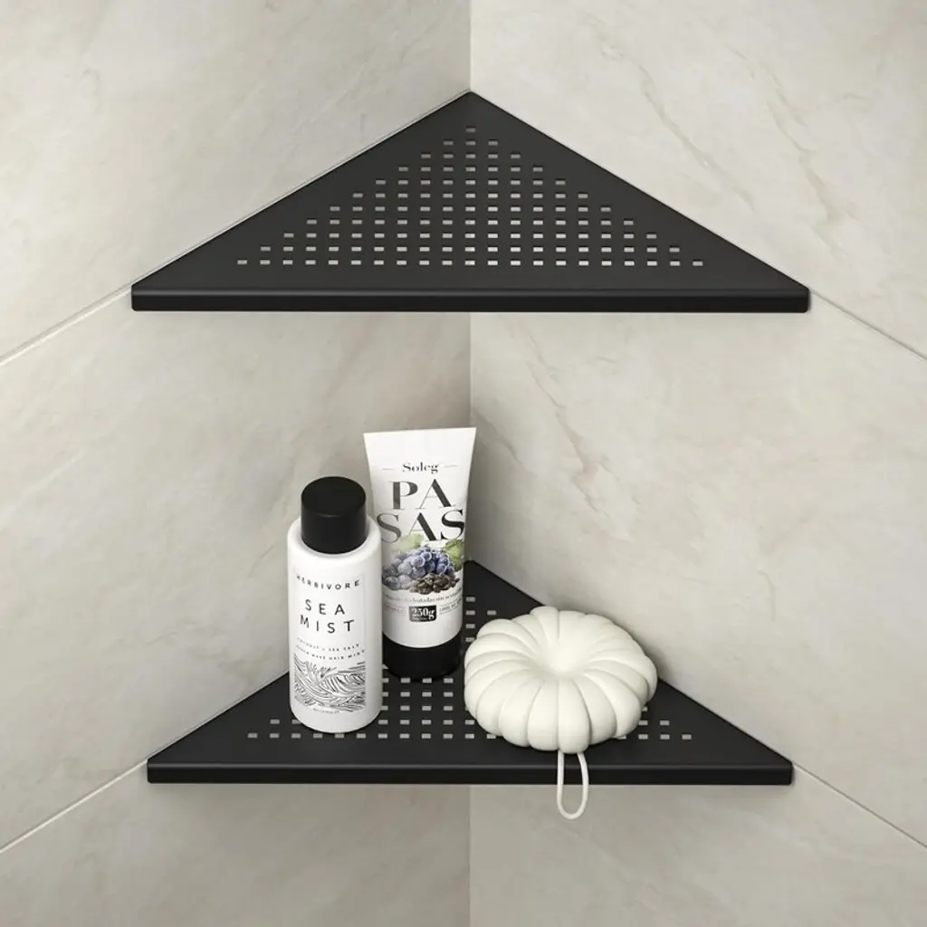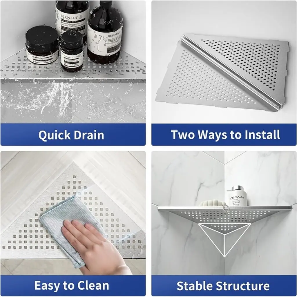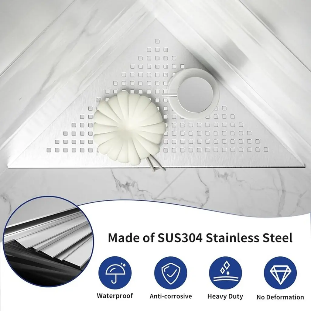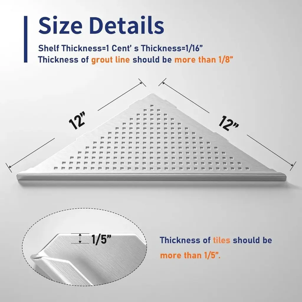 Premium 304 Stainless Steel Construction - Made with heavy-duty 1.5mm thick ASTM 304 stainless steel for exceptional corrosion and rust resistance. Supports up to 15lbs per shelf with no drilling or adhesives required - designed specifically for tiled walls.Dual-Function Design - Features two installation options: Side A offers a sleek modern stainless surface, while Side B provides a protective rail to prevent items from falling. Easily switch between styles to match your decor needs.Space-Saving Corner Solution - Perfectly designed for 90° corners to maximize unused space in bathrooms and kitchens. Ideal for organizing toiletries, cosmetics, or kitchen essentials while maintaining a clean, modern aesthetic.Smart Drainage System - Integrated drainage slots prevent water pooling, keeping items dry and clean. Multi-functional design doubles as a convenient footrest for shaving. Compatible with other shower accessories.Easy Maintenance & Installation - Requires only periodic cleaning with neutral agents. Includes detailed sizing guidance and dedicated customer support for hassle-free setup and use.