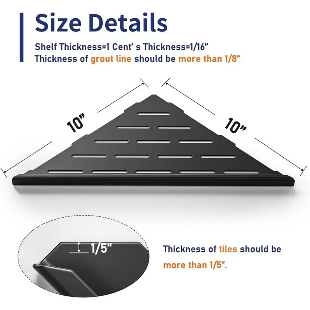 Premium 304 Stainless Steel: Crafted from ASTM-standard 304 stainless steel, these shelves resist corrosion, scratches, and rust for lasting durability. With a 1.5mm thickness, each shelf supports up to 15 lbs—ideal for tiled walls without drilling or adhesives.Dual-Design Flexibility: Choose between Side A (sleek stainless surface for a modern look) or Side B (corner shelf with a rail to prevent items from falling). Easy to install and wall-friendly, with no drilling required.Space-Saving Corner Solution: Perfect for 90° corners in bathrooms or kitchens, these floating shelves organize shampoo, body wash, and more—saving space in both narrow and wide areas.Quick-Drain & Multi-Use: Slotted design prevents water pooling, keeping items dry. Doubles as a footrest for shaving. Compatible with matching shower drains and niches.Low Maintenance & Durable: Requires minimal upkeep—just periodic cleaning with neutral agents. Includes dedicated customer support for a hassle-free experience. Note: Tile thickness must exceed 1/5" for secure installation.