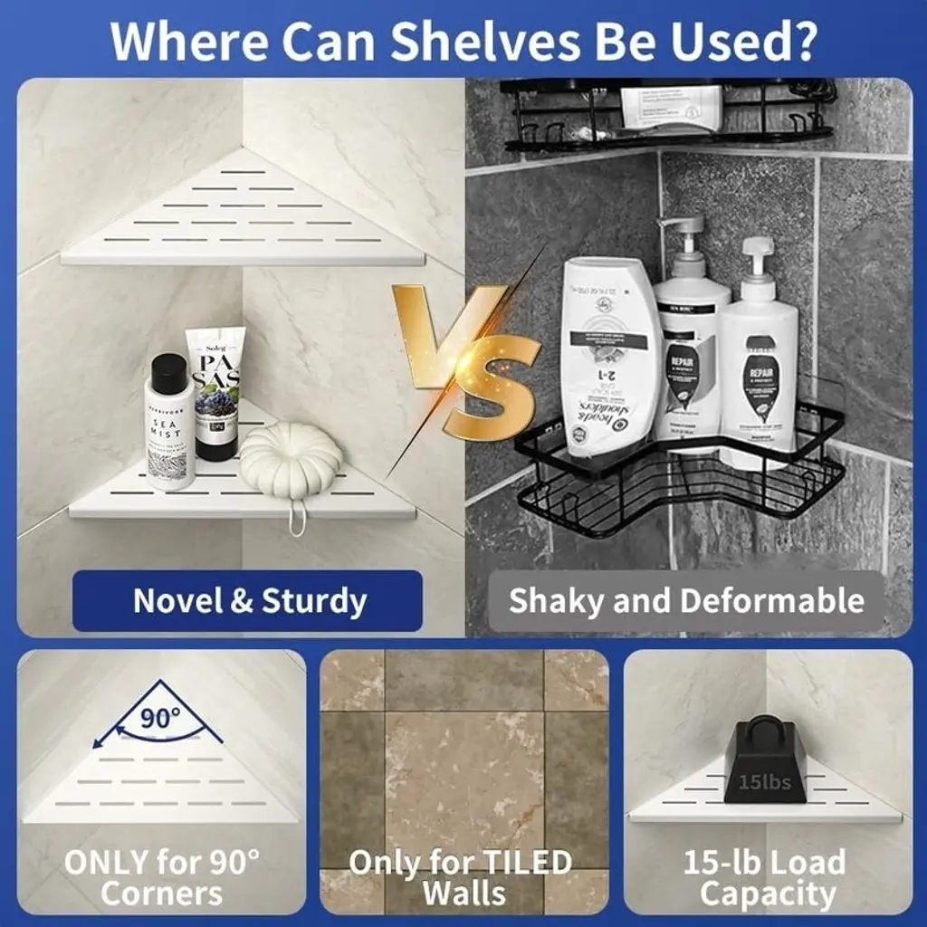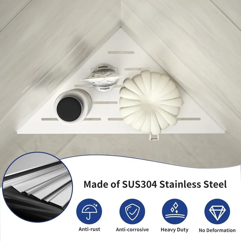 Premium 304 Stainless Steel: Crafted from ASTM-standard 304 stainless steel, these shelves resist corrosion, scratches, and rust for lasting durability. With a 1.5mm thickness, each shelf supports up to 15 lbs—ideal for tiled walls without drilling or adhesives.Dual-Design Flexibility: Choose between Side A (sleek stainless surface for a modern look) or Side B (corner shelf with a rail to prevent items from falling). Easy to install and wall-friendly, with no drilling required.Space-Saving Corner Solution: Perfect for 90° corners in bathrooms or kitchens, these floating shelves organize shampoo, body wash, and more—saving space in both narrow and wide areas.Quick-Drain & Multi-Use: Slotted design prevents water pooling, keeping items dry. Doubles as a footrest for shaving. Compatible with matching shower drains and niches.Low Maintenance & Durable: Requires minimal upkeep—just periodic cleaning with neutral agents. Includes dedicated customer support for a hassle-free experience. Note: Tile thickness must exceed 1/5" for secure installation.