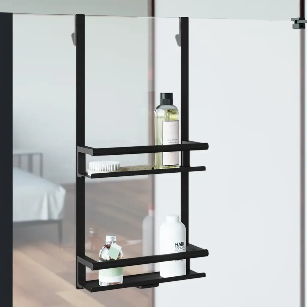 Double soap dish to hang on the screen and have everything you need for the shower on hand. One of the soap dishes incorporates a practical screen cleaner. Accessory that does not need installation. Designed by Cosmic Studio to offer a collection of maximum functionality, which stands out for incorporating an ultra-secure support system and very resistant finishes. Double hanging soap dish with 10 years warranty. Clean with a soft cloth dampened in water and dry with a chamois. Do not use rags or abrasive scouring pads, detergents, acids or cleaning products whose composition is unknown.Soft Black finish