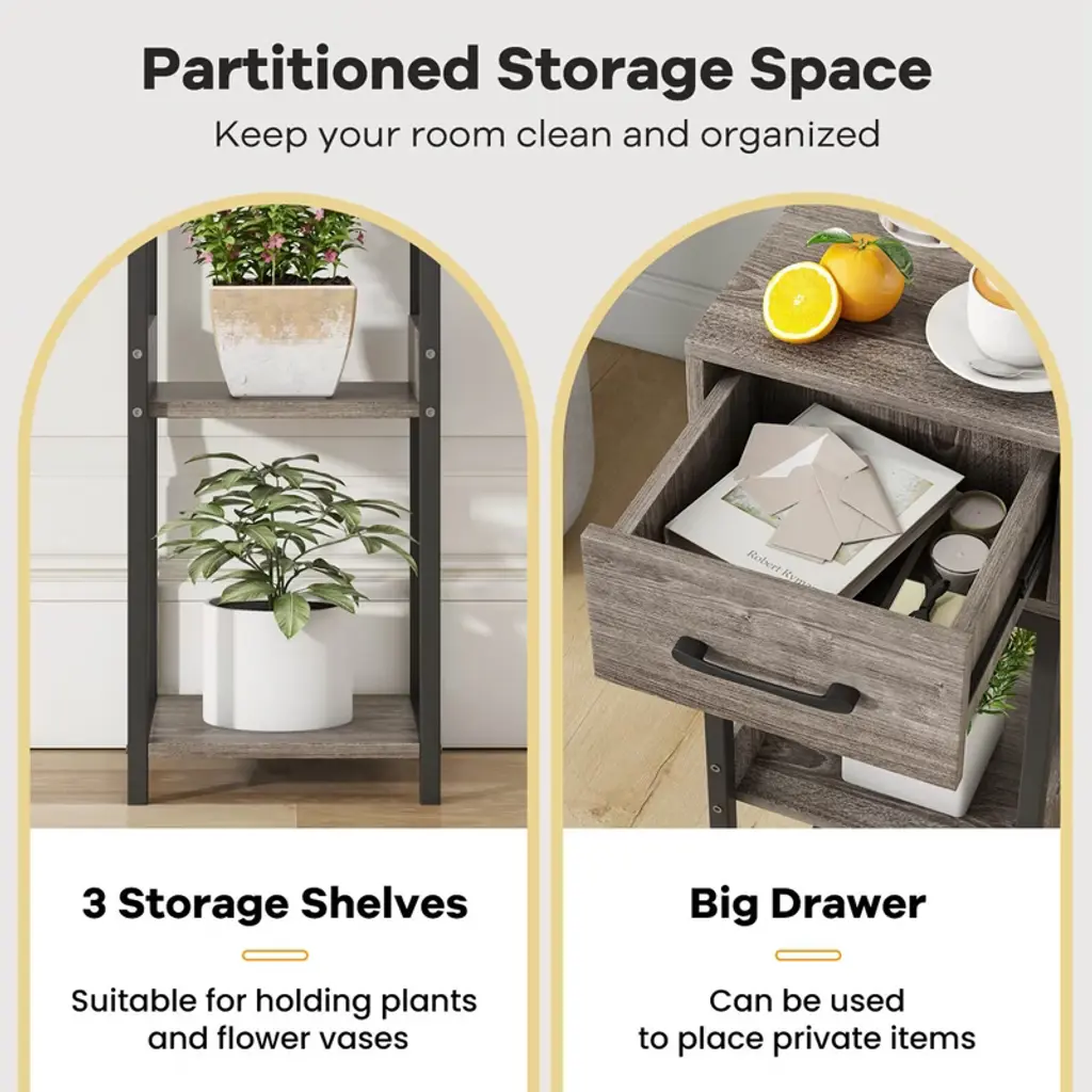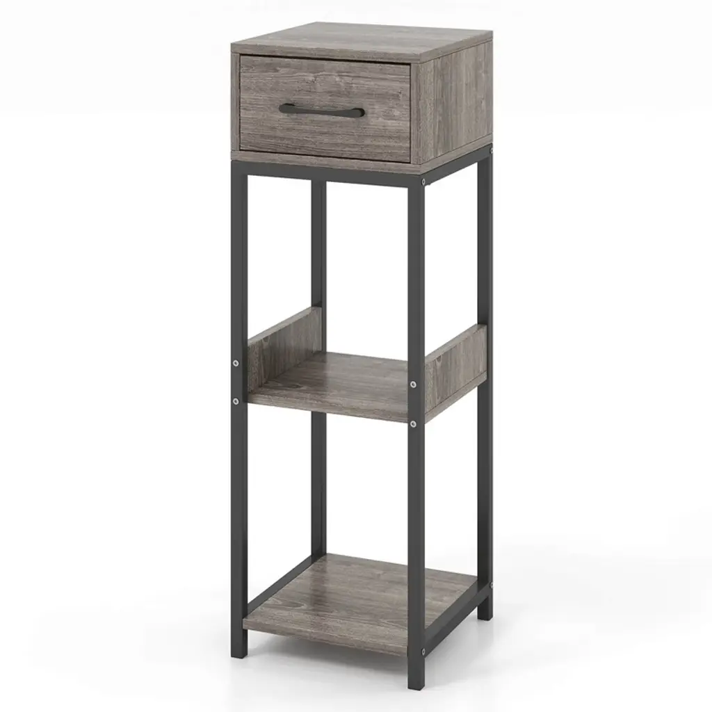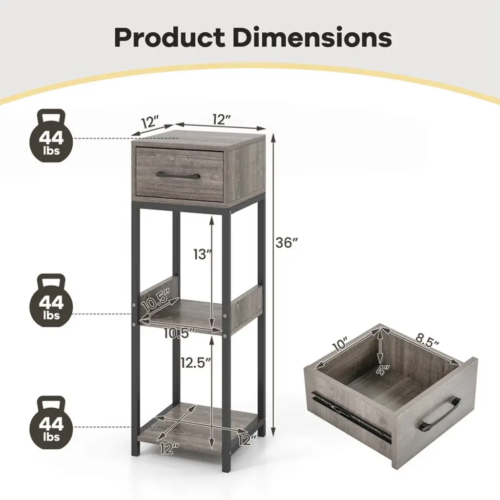 Elevate your indoor greenery with our stylish 3-tier plant stand! Boasting 3 open shelves, the corner plant stand offers a chic solution to showcase your beloved potted plants. The included drawer adds functionality, serving as a tidy spot for storing essential gardening tools or treasured decorations. Therefore, the versatile piece can double as a display shelf. Equipped with 2 anti-tipping devices, you can secure the stand to the wall for enhanced safety. Featuring powder-coated metal frame and non-slip pads, the versatile 3-tier plant shelf guarantees unwavering steadiness while safeguarding your floors from scratches. Adorned with a striking simulated wood grain finish, the plant table is a space-saving option for any balcony, living room or apartment setting.Features3 open shelves keep your potted plants in an organized way Extra large drawer is provided to hold some small tools or items Functioning as a display shelf for ornaments, books 2 anti-tipping devices are provided to prioritize your safety Medium shelf features raised baffle to prevent items from falling Powder-coated metal pipes promise a stable structure Faux wood like veneer makes the shelf easy to clean Non-slip foot pads prevent the floor from being scratched 3-tier vertical design upgraded your space utilization Applicable to entryway, living room or balconyColor: Grey & Black Material: Metal + Engineered Wood + MDF Overall Dimension: 12" x 12" x 36" (L x W x H) Drawer Size: 10" x 8.5" x 4" (L x W x H) Net Weight: 21/42 lbs Each Tier Weight Capacity: 44 lbs Drawer Weight Capacity: 22 lbs Package includes: 1/2 x 3 Tier Plant Stand 2/4 x Anti-tipping Device 1 x Instruction