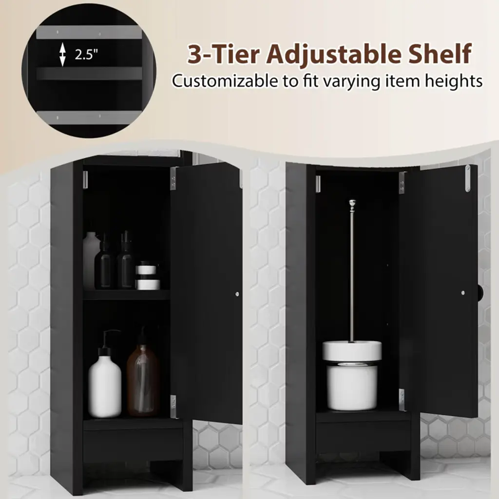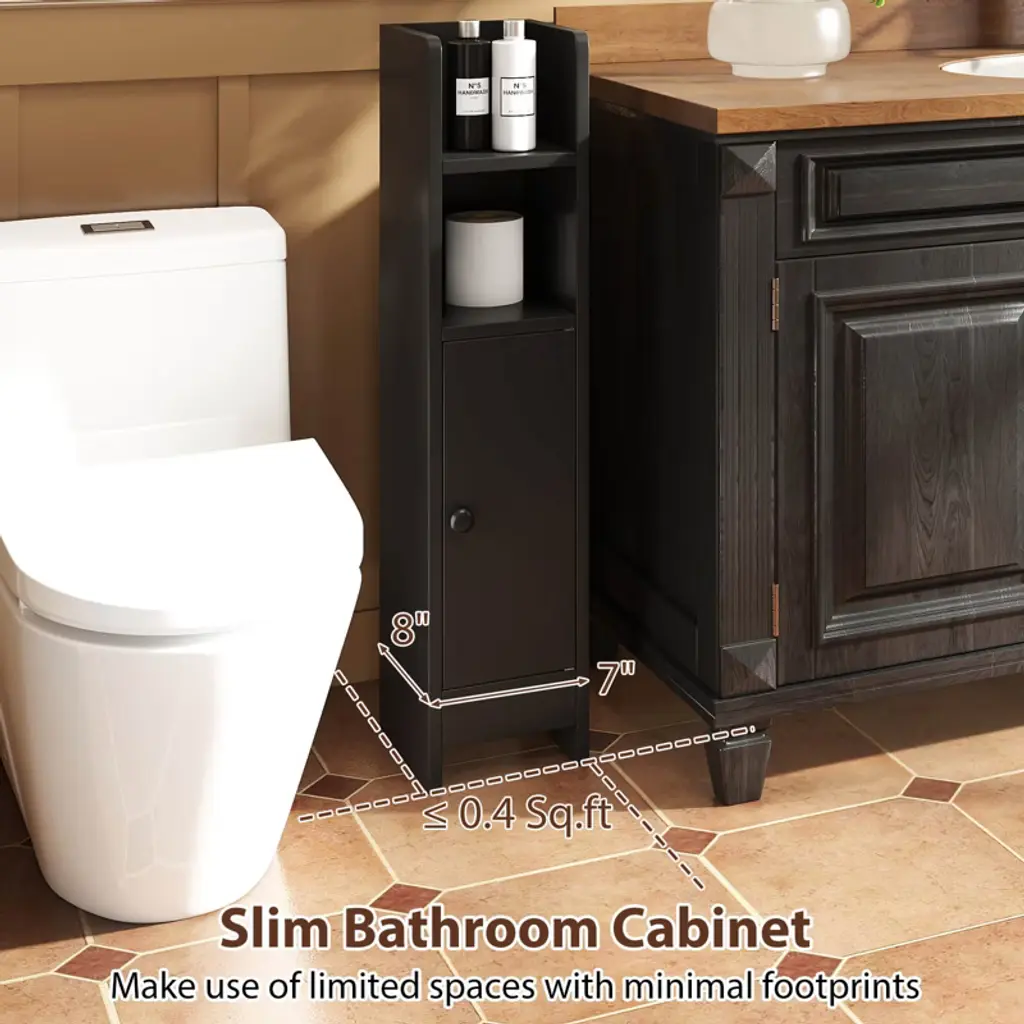 Our slim bathroom cabinet is designed to fit snugly into less than 0.4 sq.ft of floor space, providing organized storage for your essentials without overwhelming your area. It features an adjustable shelf to accommodate taller items, and the anti-tipping design with non-slip foot pads ensures stability. Plus, a magnetic catch facilitates smooth and easy operation. Perfect for small bathrooms, kitchens, or entryways, the space-efficient organizer helps you declutter without sacrificing style. Set it up in your room to maximize storage with minimal footprint!FeaturesTakes up less than 0.4 sq.ft to make use of limited floor spaces 2 shelves and 1 cabinet to organize your bathroom essentials Customizable 3-tier adjustable shelf to fit varying item heights Top area with fall guard to prevent items from falling off Stable and safe with anti-tipping kits and non-slip foot pads Magnetic door catch to shut cabinet securely Round handle design offers comfortable grip for opening Works equally well in kitchens, laundry rooms and living areas Minimalist styling blends seamlessly in to modern homes Assembly neededColor: White/Black/Brown Material: Engineered Wood + MDF Product Size: 8" x 7" x 31.5" (L x W x H) Total Weight Capacity: 44 lbs Net Weight: 11 lbs Package Includes: 1 x Slim Bathroom Floor Cabinet 1 x User Guide