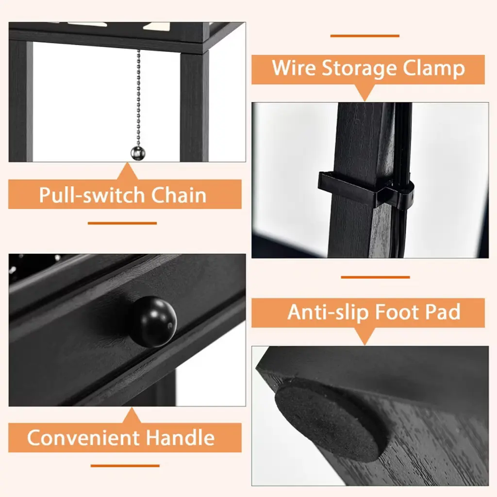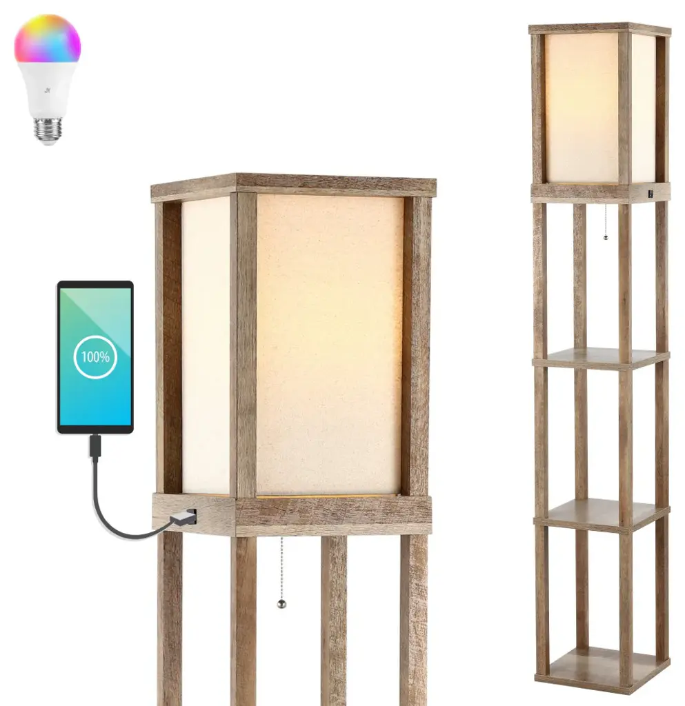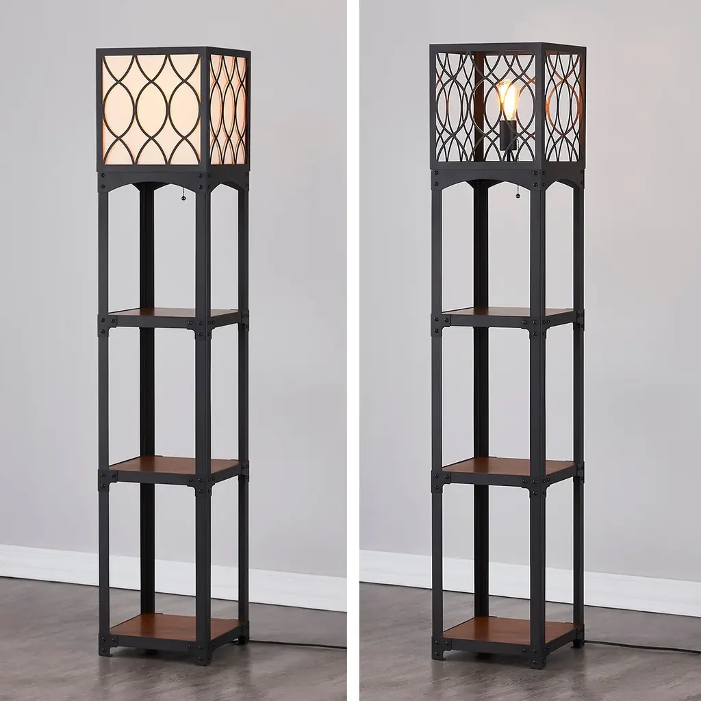 Add a great addition to your home space with this modern shelf floor lamp! With its vertical shape, our standing lamp is suitable for the corner of your living room and bedroom. If you electric devices run out of the battery, the power outlet and 2 USB ports will provide effective assistance. Apart from this, the pull-switch chain avoids you bending over to turn off the light for coziness. In addition, this floor lamp is also compatible with the role of bookshelf due to its 1 practical drawer and 3 open shelves.FeaturesColor: Black Material: MDF, Plastic Overall Dimension: 10'' x 10'' x 63'' (L x W x H) Net Weight: 12 lbs Weight Capacity of the First and Second Shelf: 5 lbs Voltage: 120V/60Hz Minimum Compatible Wattage: 9W Maximum Compatible Wattage: 60W Switch Style: Pull Chain Socket Base: E26 Standard Base Bulb Type: LED Bulb/Incandescent Bulb/CFL Bulb (Not Included) Package Includes: 1 x Floor Lamp 1 x Instruction
