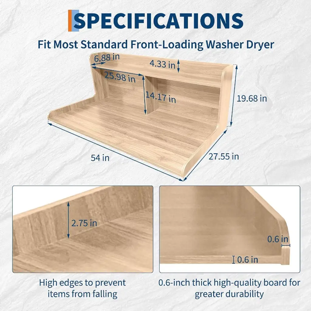 Tired of a cluttered laundry room? Discover how this double-tier washer dryer countertop with shelf instantly transforms wasted space into a clean, organized surface for folding, sorting, and storage. Highlights at a glance: - Fits most standard laundry machines - Double-tier storage for a more organized laundry area - Wide top shelf keeps laundry supplies within reach - Spacious surface for folding or sorting clothes - Waterproof, easy-to-clean wood construction - Raised edge rails help prevent items from slipping - Non-slip pads keep the topper steady on your machines - Quick assembly with clear instructions and labeled parts Specification: Product name: Washer Dryer Countertop Size: 54x27.5x16.68 inches Color: walnut / natural / white Material: engineered wood Friendly note: Please follow the step-by-step instructions and check all labeled parts before starting assembly. For best results, make sure your washer and dryer are positioned on a level surface before installing the topper. Tighten screws and bolts securely, but avoid over-tightening. Wipe spills promptly to keep your laundry countertop looking its best. Packing list: 1x Laundry Topper 1x Hardware Pack 1x Assembly Instruction