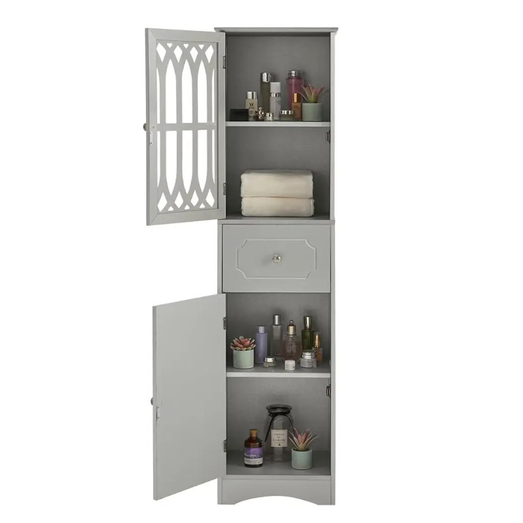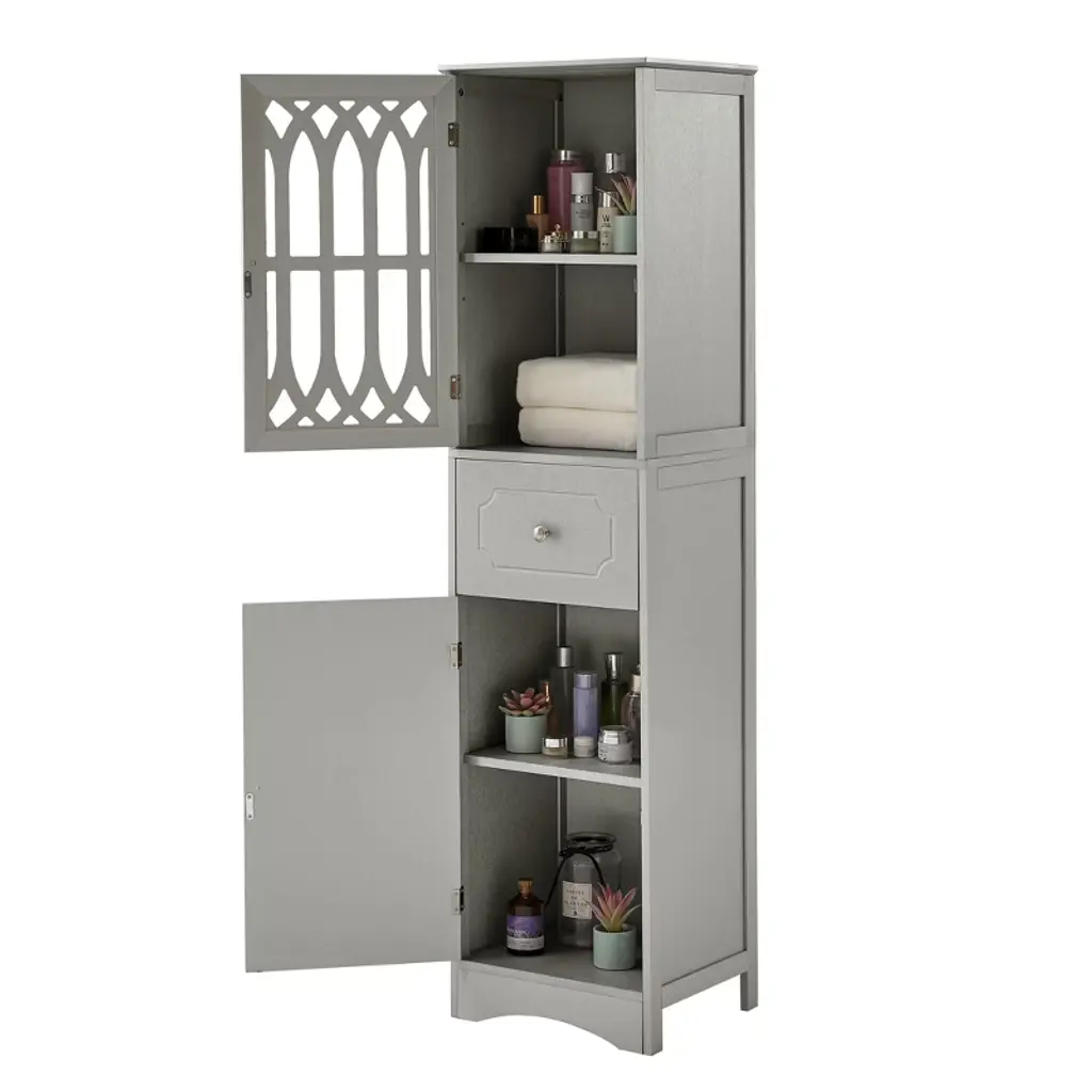 Cowlown Gray Freestanding Bathroom Storage Cabinet With Drawer And Doors, Slim Linen Tower With Adjustable Shelf And Acrylic Panel, Modern Design