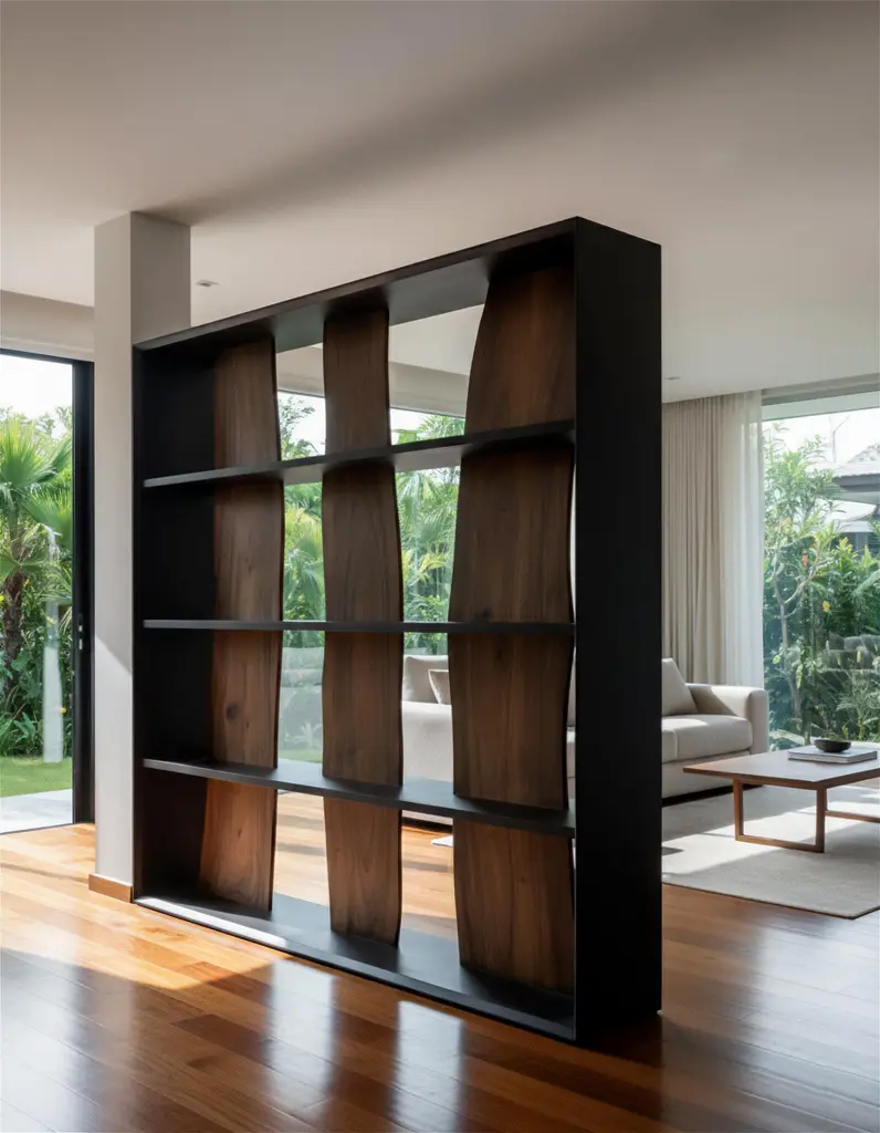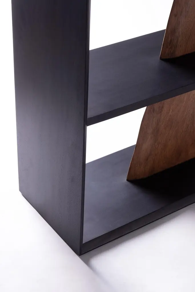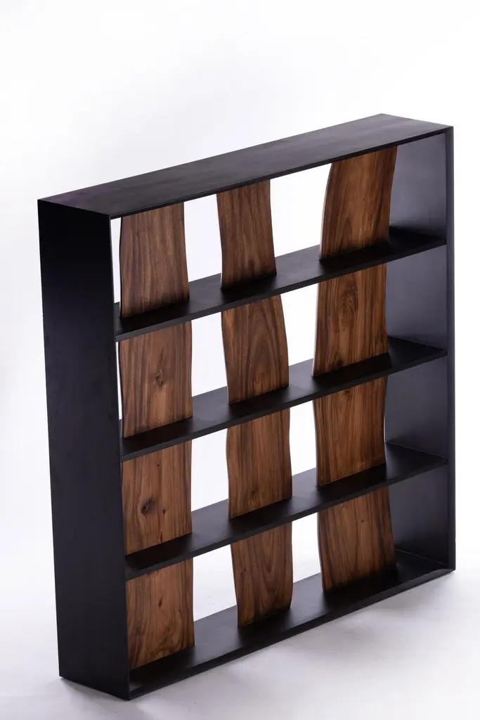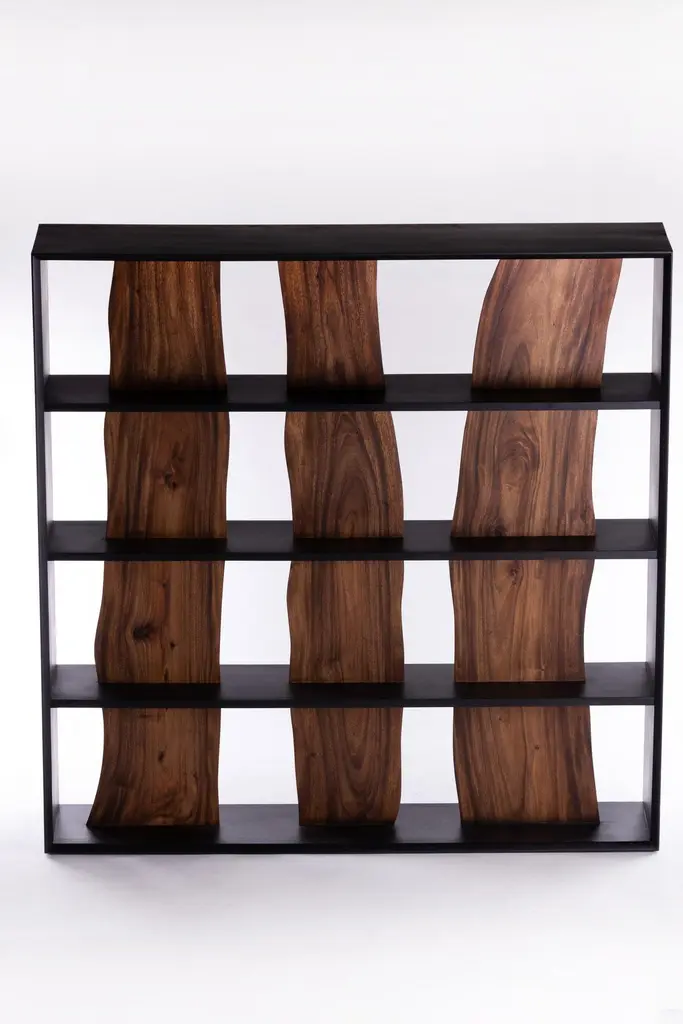 A great deal of time was spent considering the best way to cut wood without wasting its unique beauty. After careful consideration, this wood piece maintains its essential values by combining natural-shaped wood with simple pieces, creating a shelf for which the strength of the middle piece supports the whole structure. When an object is placed on the shelf, the individual’s perception of beauty is revealed.The Darakorn shelf is like a picture frame magnifying beauty of materiality where the designer combines natural beauty and spiritual humility.Moonler’s products are mainly made of Chamchuri Wood (known as Acacia or Monkey Pod) which are solid wood and solid wood is a living material. It may move according to different weather conditions and environment humidity. It is normal for wood to increase and decrease its own dimensions according to the climate. Variations of 1-2% on solid wood table tops or surfaces such as skin crack or movement caused by small differences in thickness between the various pieces of solid wood glued together to form the tabletop should be considered natural and typical of solid wood and cannot represent a reason for claims. Also, each and every wooden piece of furniture features unique color shades and grains. Natural crack or holes should be accepted as it is part of the charming of solid wood characteristic.