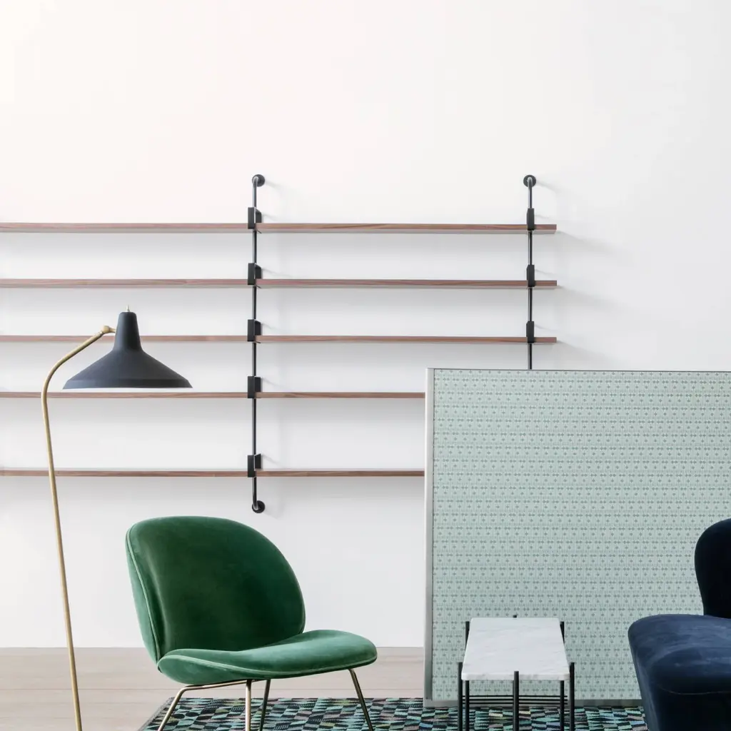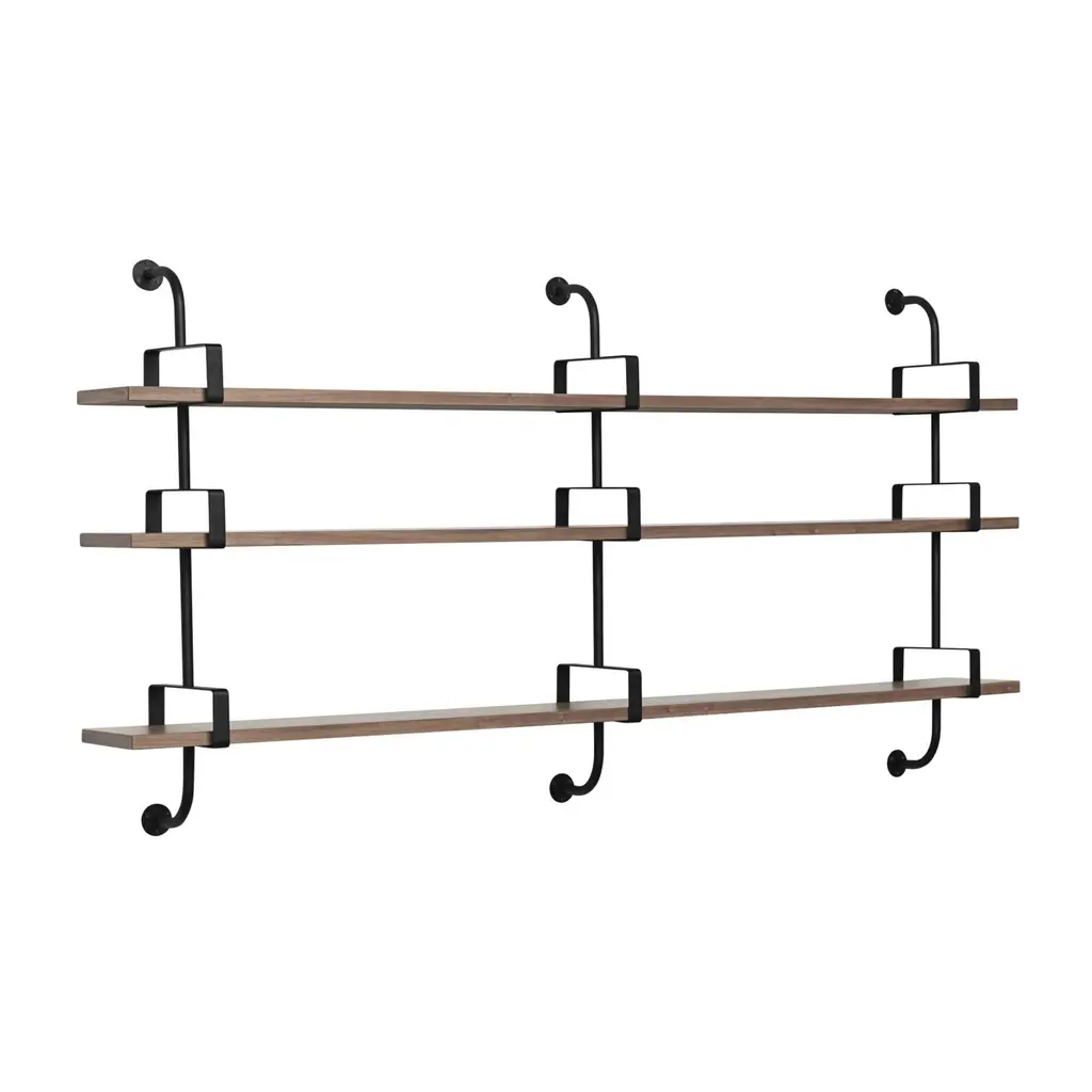 A 3-shelf variation expands Mathieu Matégot's "Biblio-Démon," the French designer's forward-thinking wall storage system first introduced in 1954. With nearly unlimited combinations of the series' different shelf units, he introduced the then-novel idea of a modular shelving system which could be changed and adapted as needed. With the distinctive metal brackets lacquered in black, the veneered shelves come in natural oak, natural walnut or black-stained ash for additional versatility.