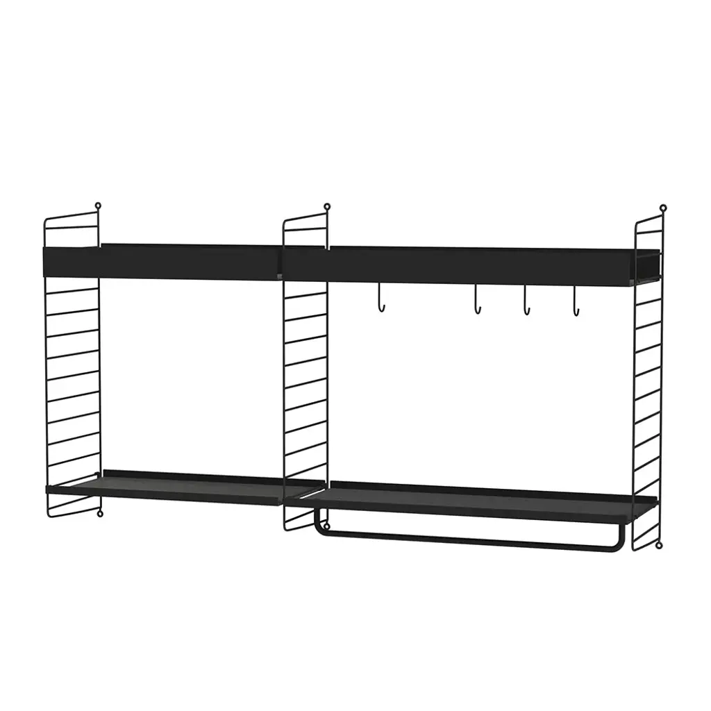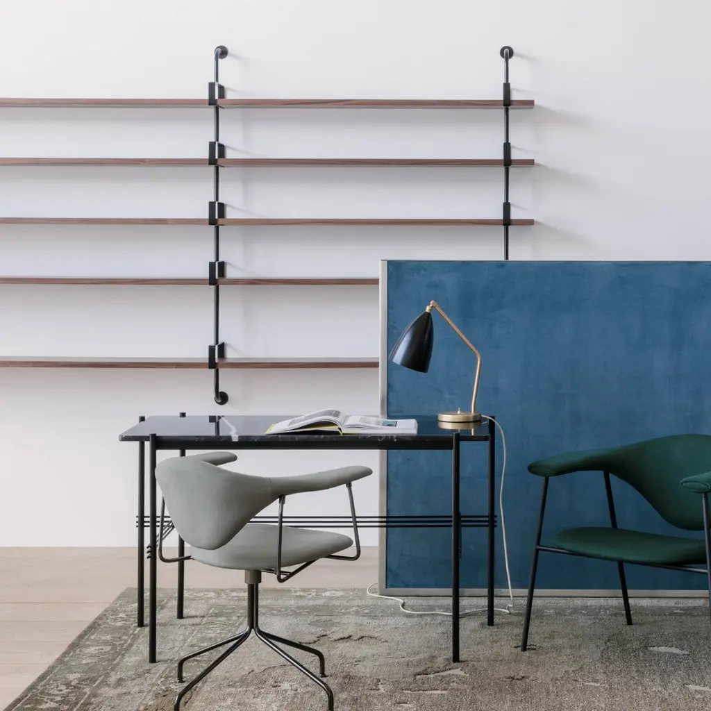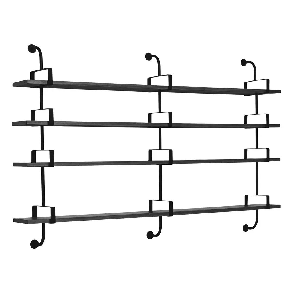 A 3-shelf variation expands Mathieu Matégot's "Biblio-Démon," the French designer's forward-thinking wall storage system first introduced in 1954. With nearly unlimited combinations of the series' different shelf units, he introduced the then-novel idea of a modular shelving system which could be changed and adapted as needed. With the distinctive metal brackets lacquered in black, the veneered shelves come in natural oak, natural walnut or black-stained ash for additional versatility.