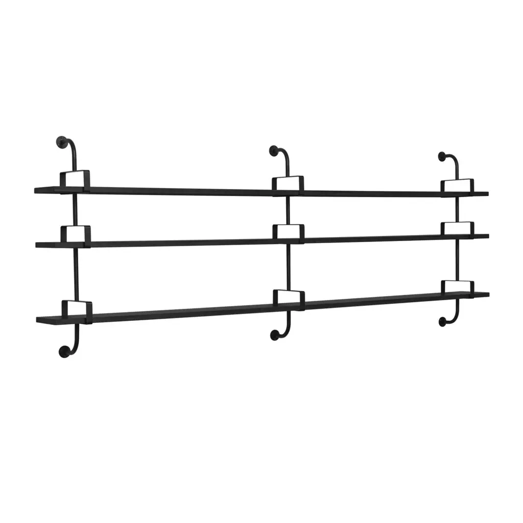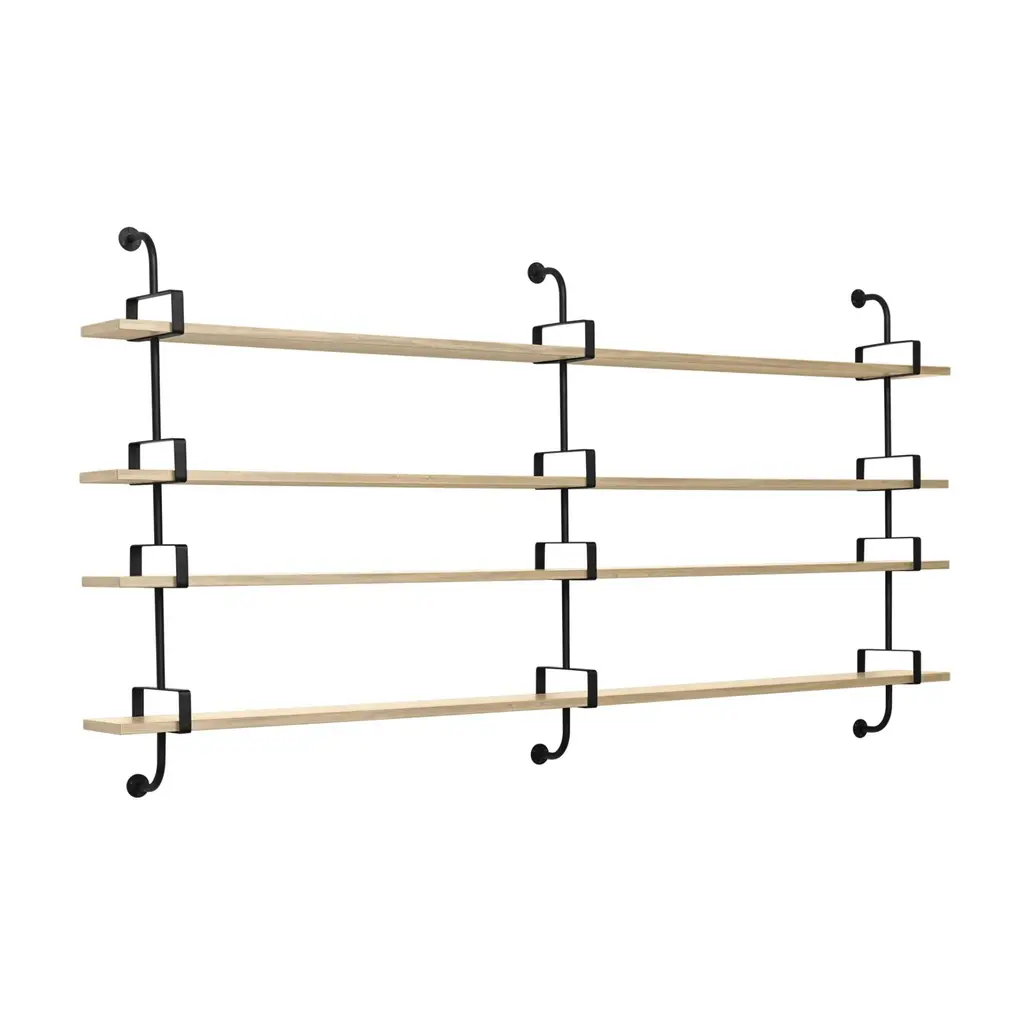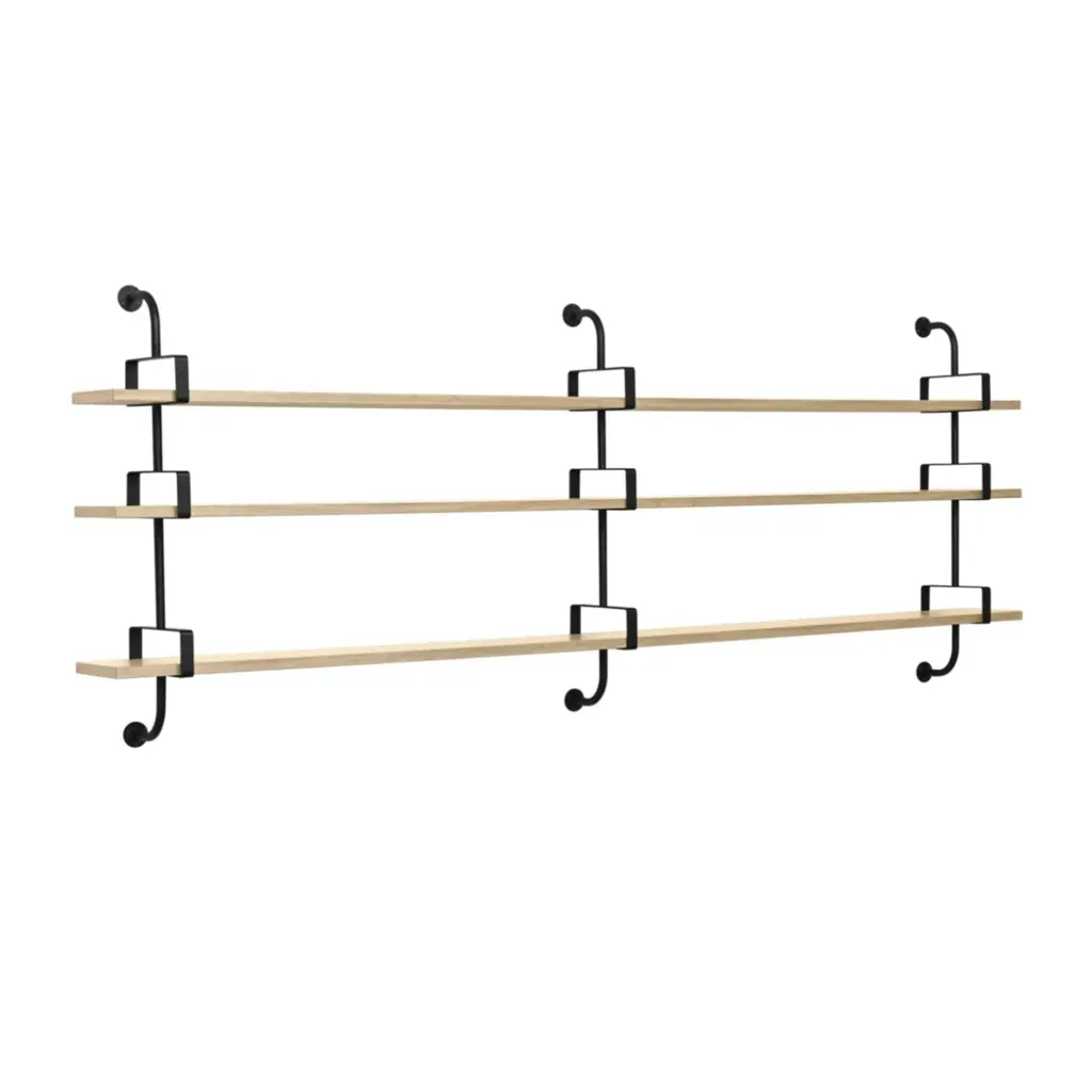 A 3-shelf variation expands Mathieu Matégot's "Biblio-Démon," the French designer's forward-thinking wall storage system first introduced in 1954. With nearly unlimited combinations of the series' different shelf units, he introduced the then-novel idea of a modular shelving system which could be changed and adapted as needed. With the distinctive metal brackets lacquered in black, the veneered shelves come in natural oak, natural walnut or black-stained ash for additional versatility.