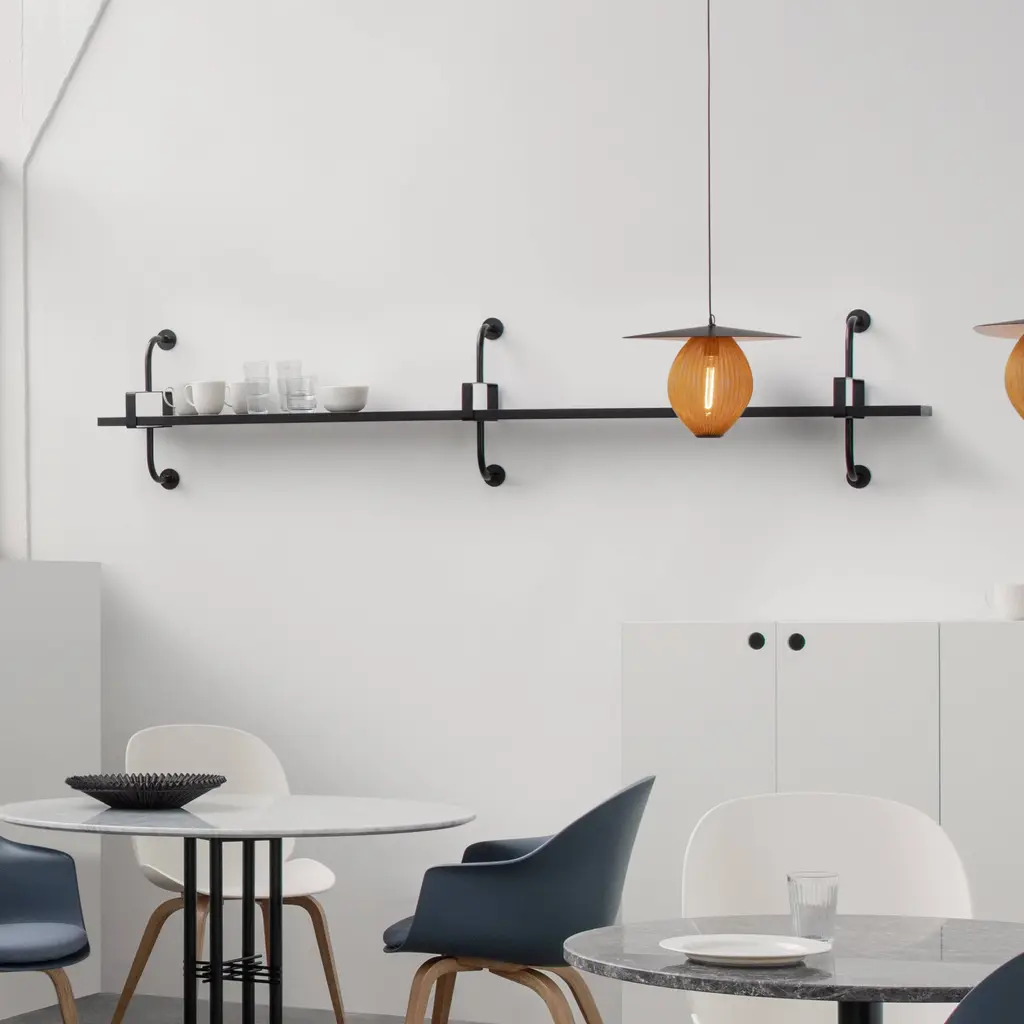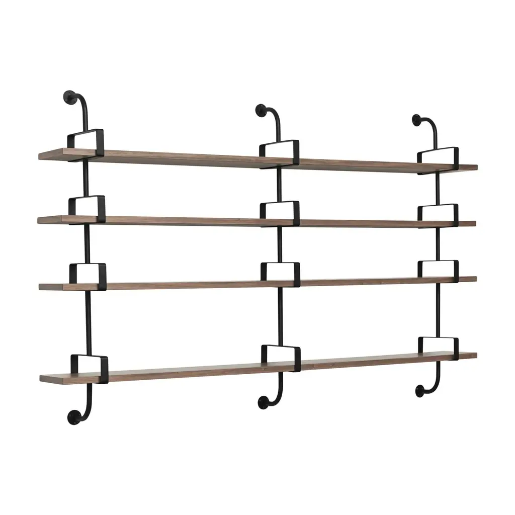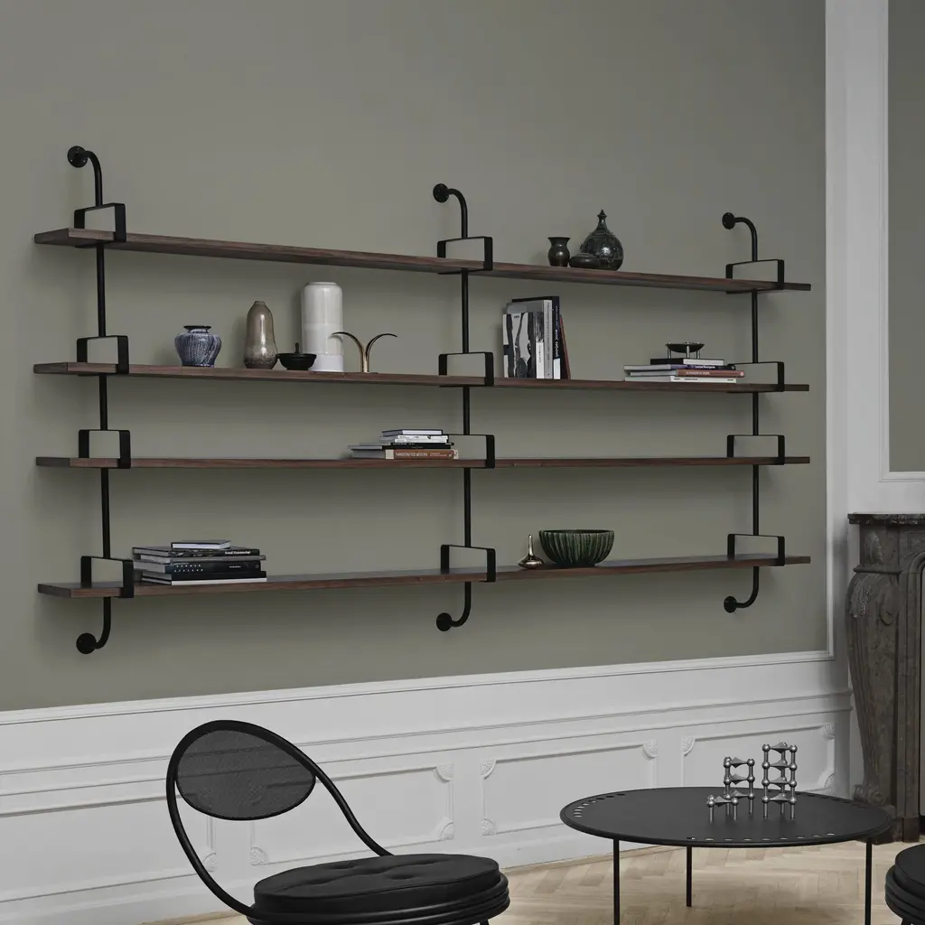 A 3-shelf variation expands Mathieu Matégot's "Biblio-Démon," the French designer's forward-thinking wall storage system first introduced in 1954. With nearly unlimited combinations of the series' different shelf units, he introduced the then-novel idea of a modular shelving system which could be changed and adapted as needed. With the distinctive metal brackets lacquered in black, the veneered shelves come in natural oak, natural walnut or black-stained ash for additional versatility.
