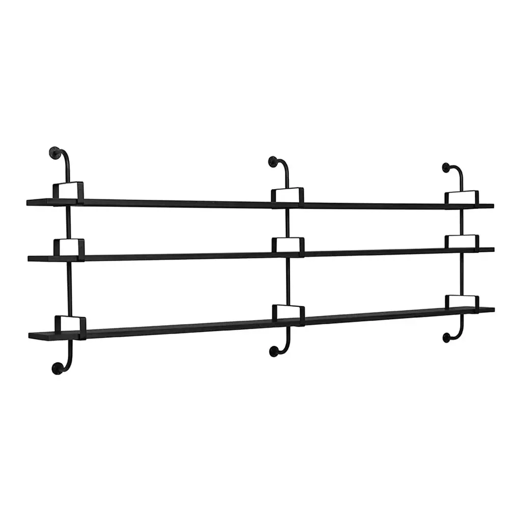 A modular shelving system that can be combined in several ways. The veneered shelves come in natural oak, natural walnut and black stained ash. The metal brackets are lacquered in black. Available in four shelf widths: 37.4in, 61in, 84.6in and 108.3in / with 3, 4, or 5 shelves.