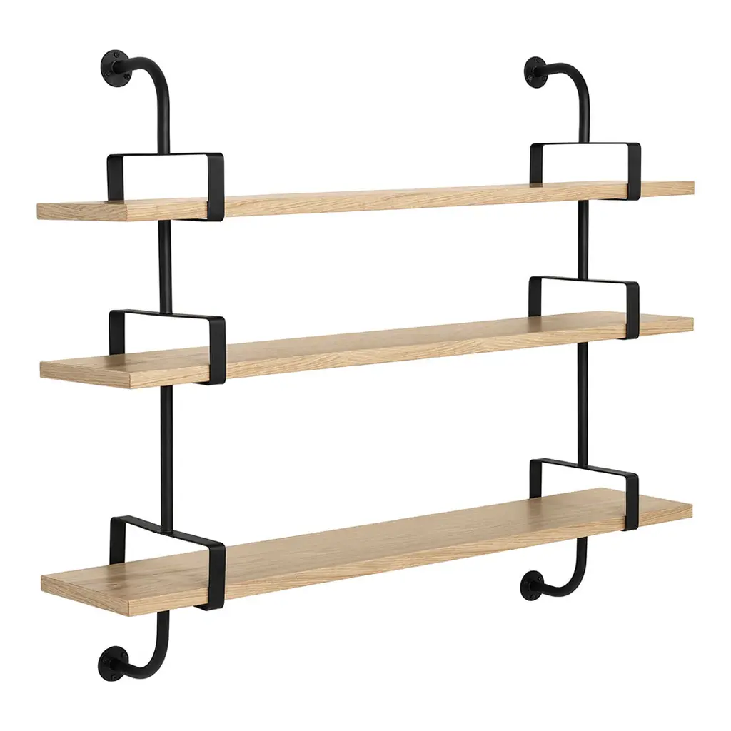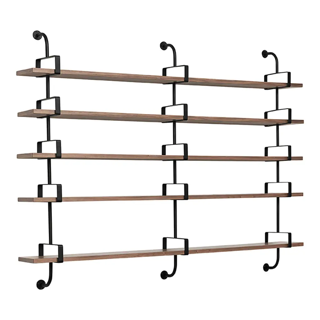 A modular shelving system that can be combined in several ways. The veneered shelves come in natural oak, natural walnut and black stained ash. The metal brackets are lacquered in black. Available in four shelf widths: 37.4in, 61in, 84.6in and 108.3in / with 3, 4, or 5 shelves.