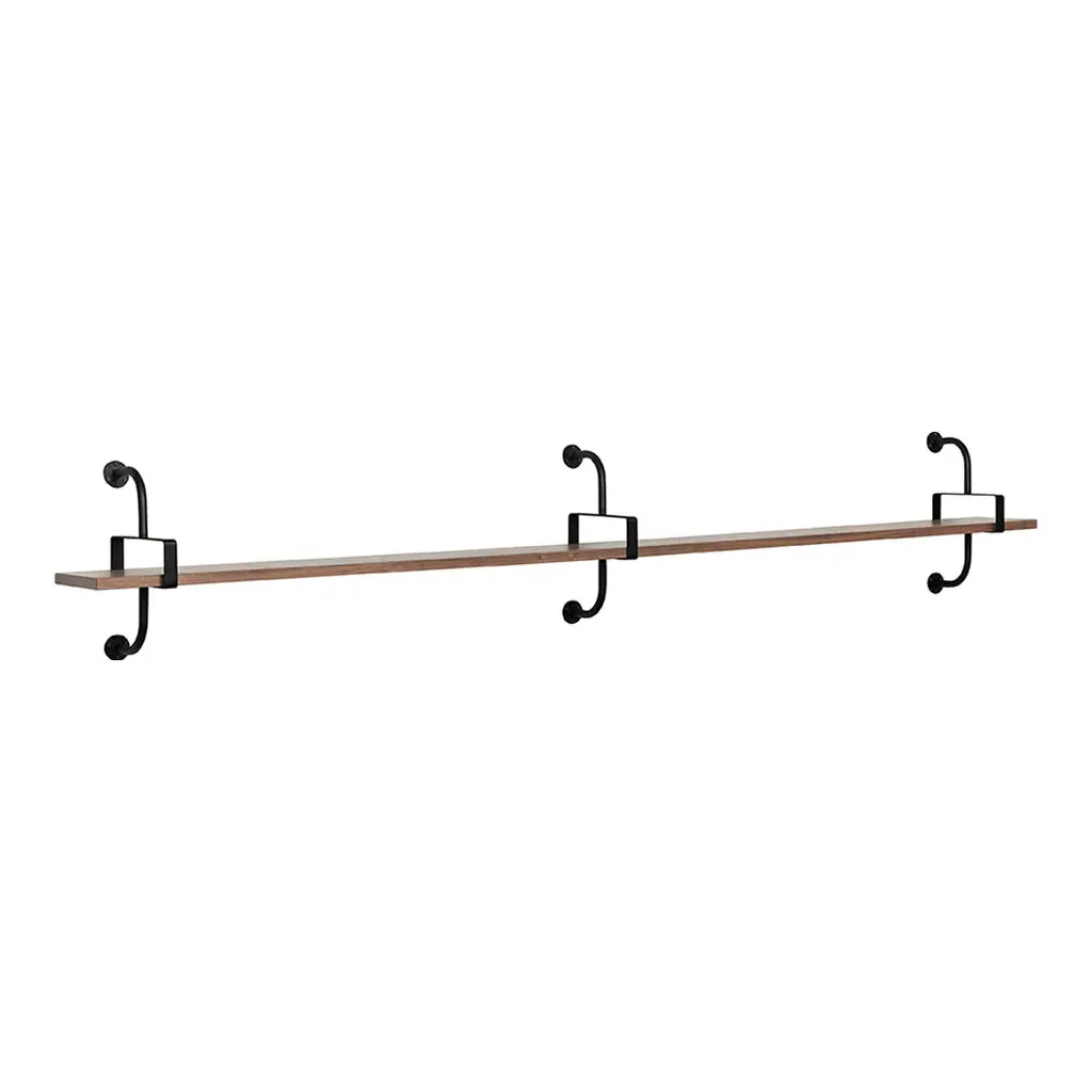 A modular shelving system that can be combined in several ways. The veneered shelves come in natural oak, natural walnut and black stained ash. The metal brackets are lacquered in black. Available in four shelf widths: 37.4in, 61in, 84.6in and 108.3in / with 3, 4, or 5 shelves.