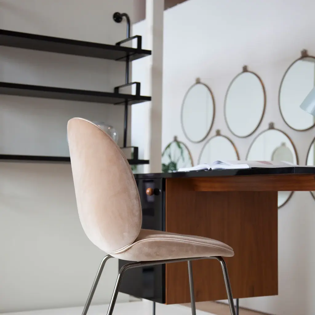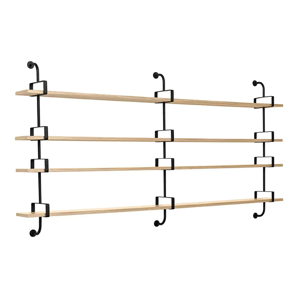 A modular shelving system that can be combined in several ways. The veneered shelves come in natural oak, natural walnut and black stained ash. The metal brackets are lacquered in black. Available in four shelf widths: 37.4in, 61in, 84.6in and 108.3in / with 3, 4, or 5 shelves.
