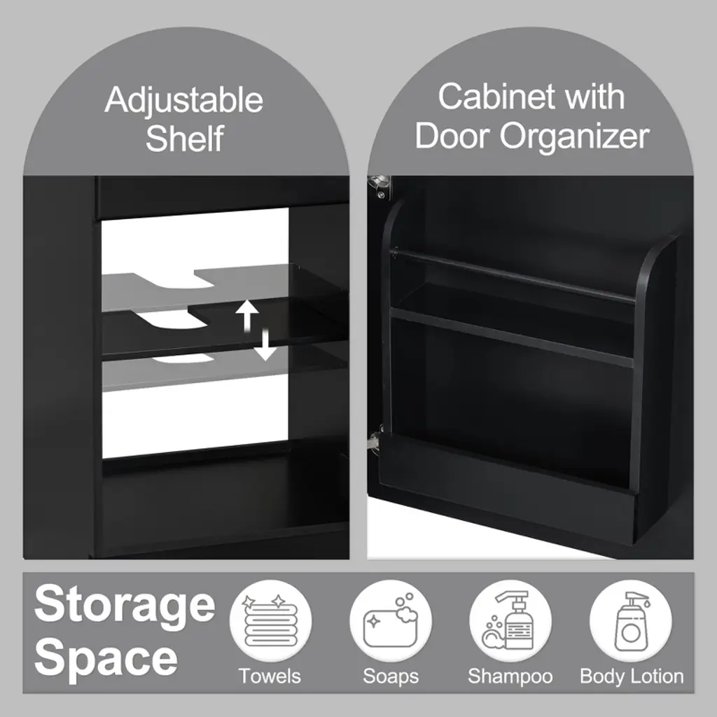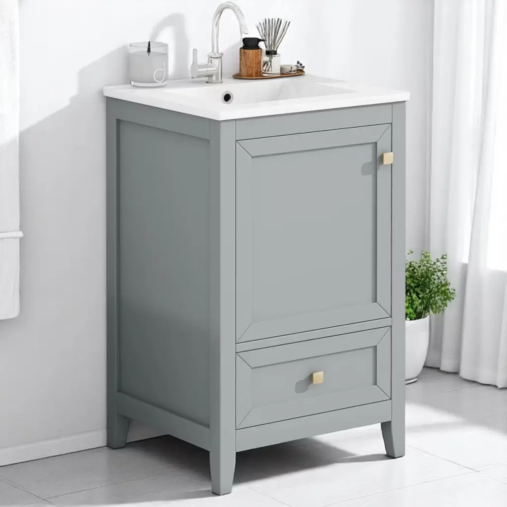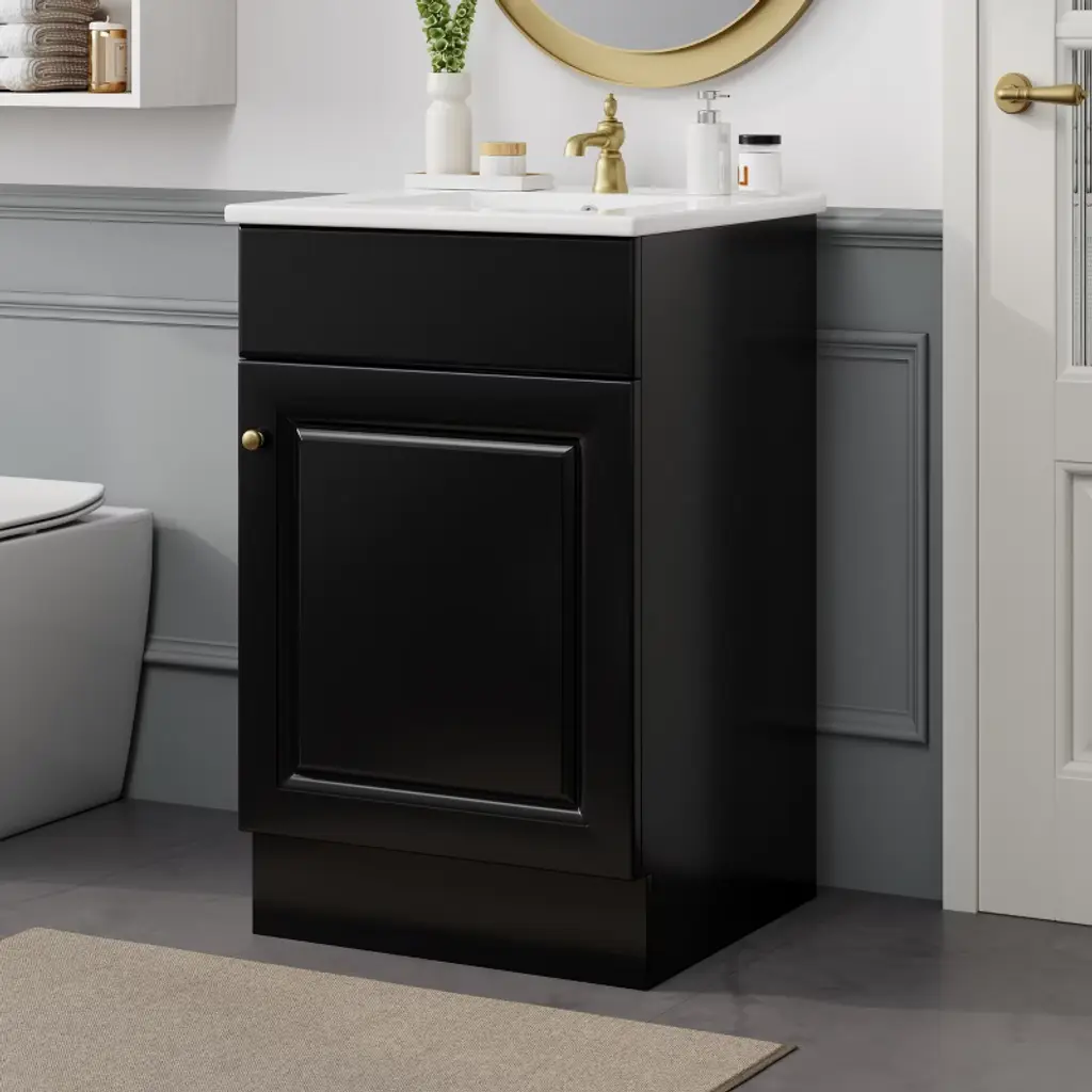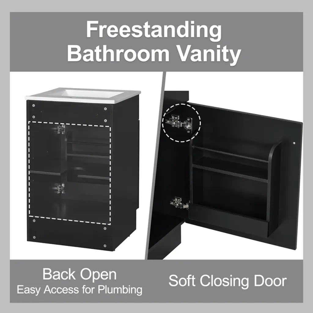 Material High-quality MDF Board Painted Finish Metal Hardware Ceramic Sink Ceramic Sink Pre-drilled Faucet Hole Chrome-finish Overflow Compatible with Single Hole Faucet (not included) Freestanding Bathroom Vanity Soft Closing Door Back Open Easy Access for Plumbing Storage Space Cabinet with Door Organizer Adjustable Shelf Shampoo/Towels/Soaps/Body Lotion