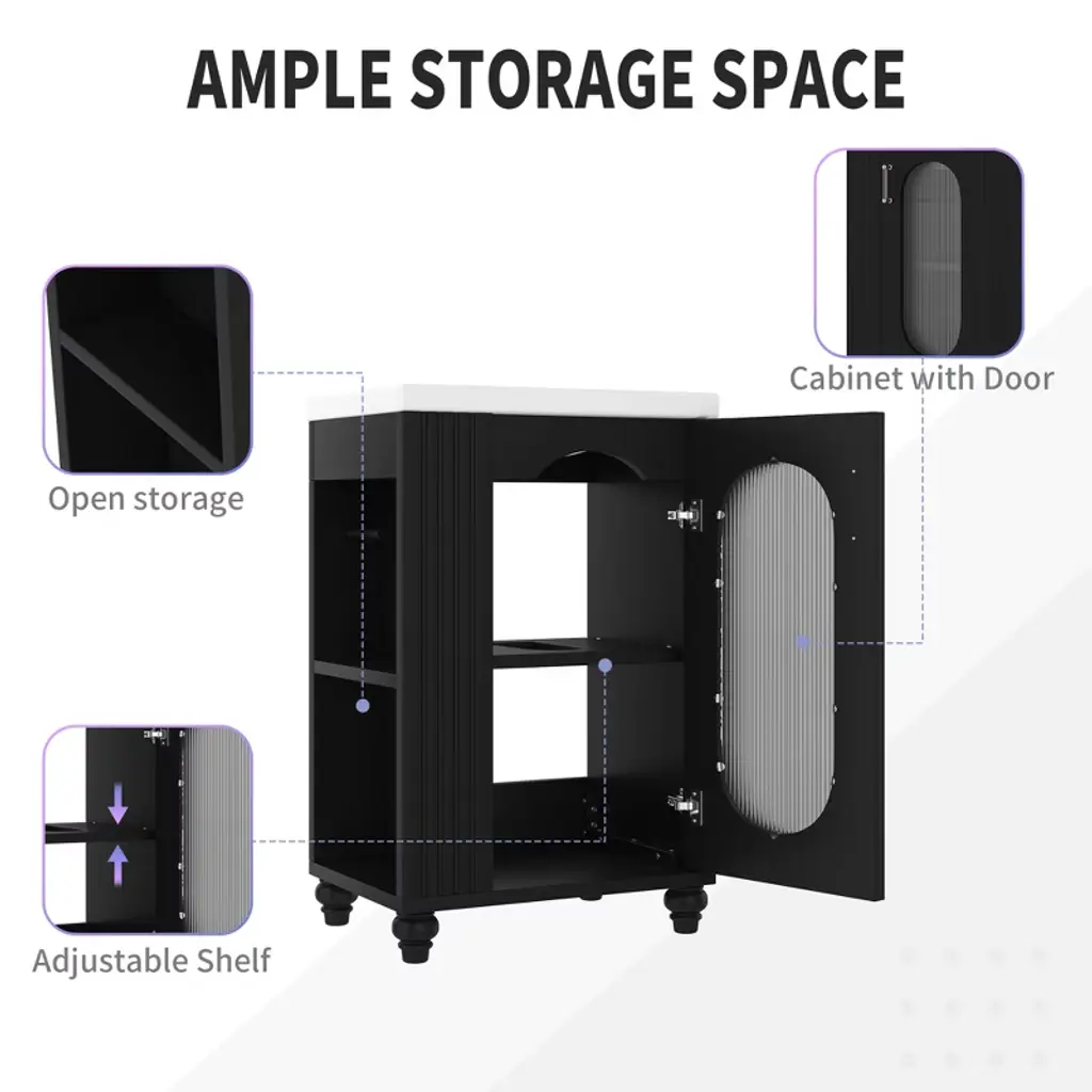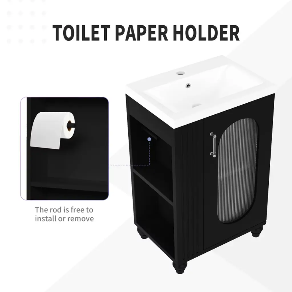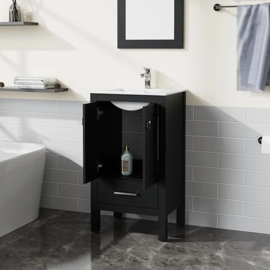 This bathroom vanity has different storage space: one cabinet with door, two-tier storage shelf on the side, and toilet paper holder. You can put soaps, towels, shampoos, tissue paper and other bathroom essentials in it.