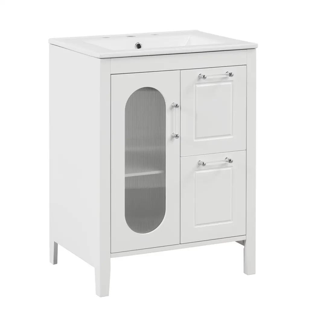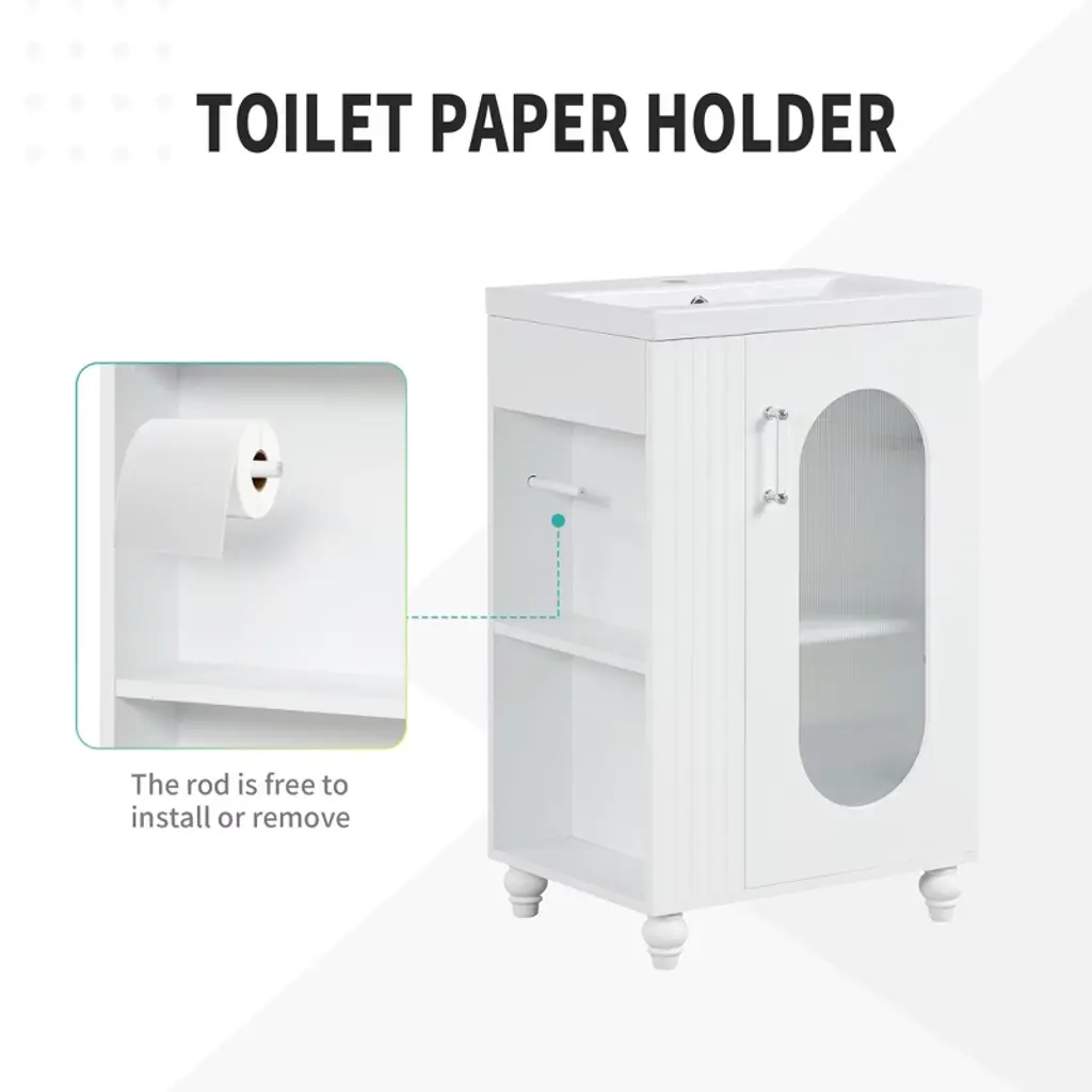 This bathroom vanity has different storage space: one cabinet with door, two-tier storage shelf on the side, and toilet paper holder. You can put soaps, towels, shampoos, tissue paper and other bathroom essentials in it.