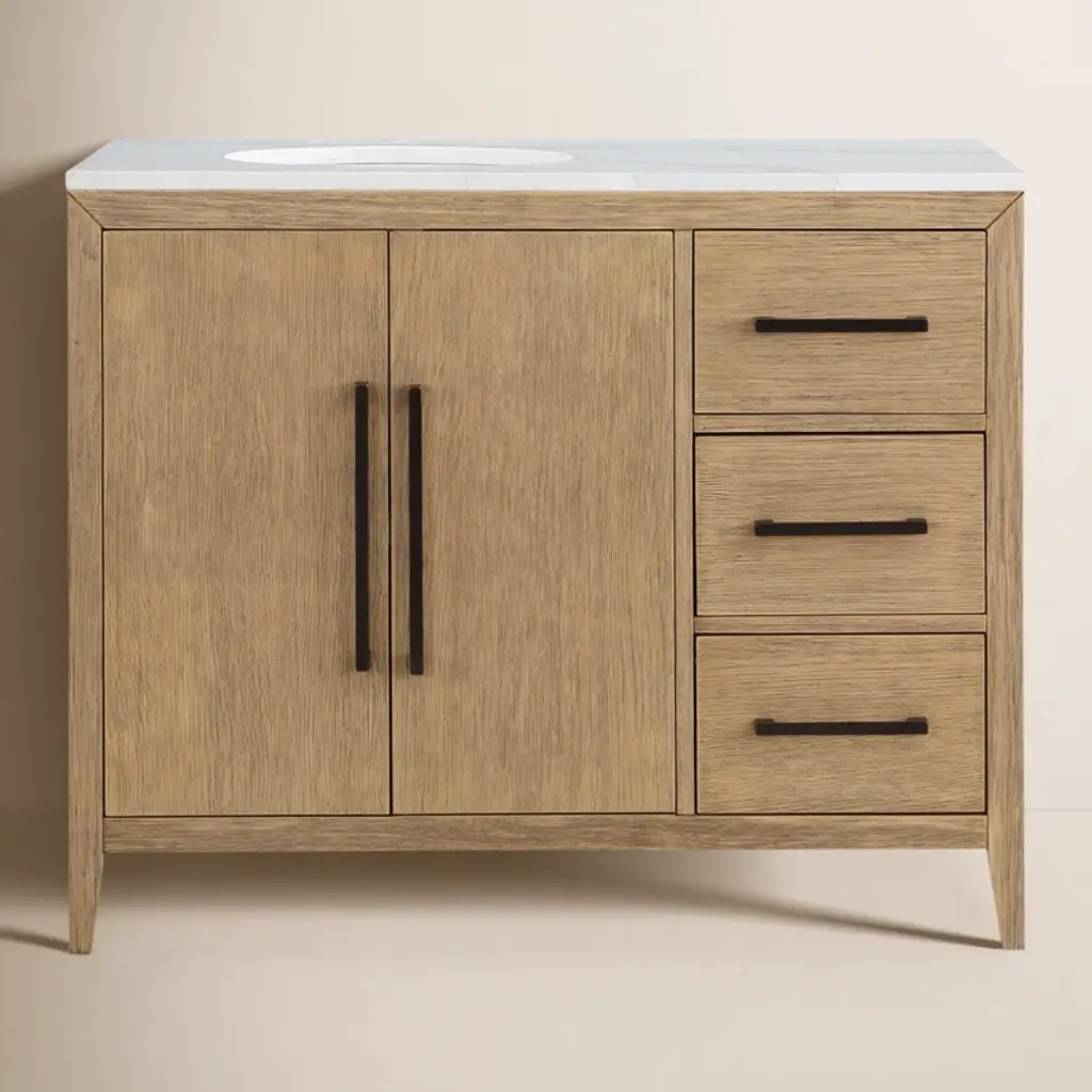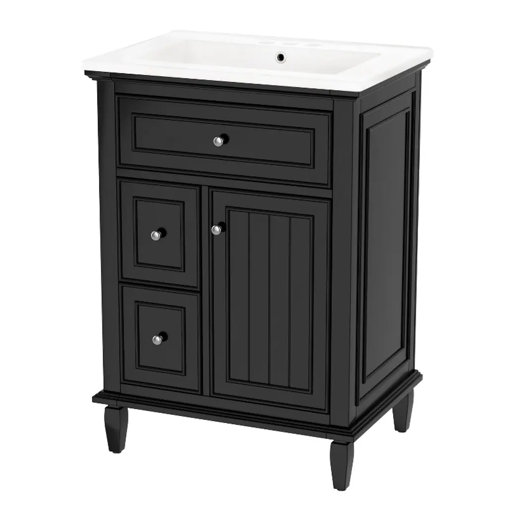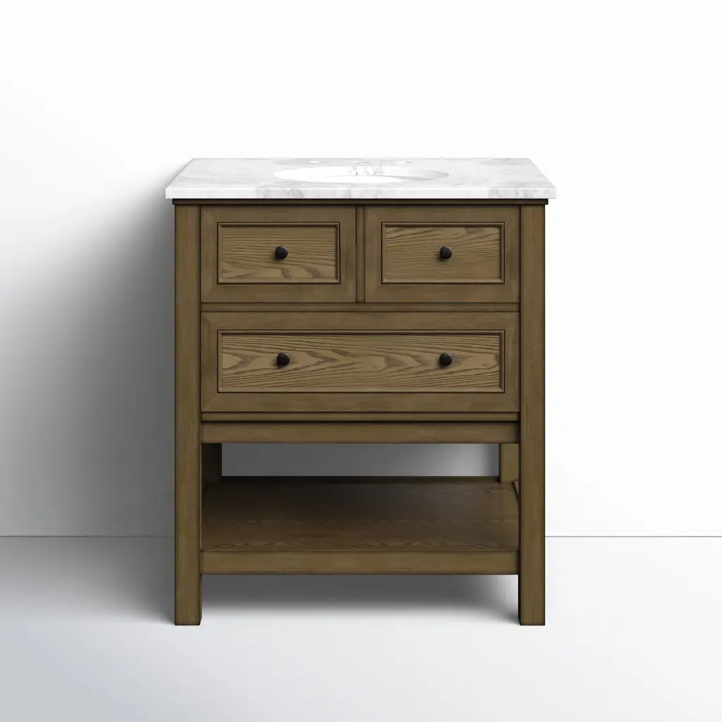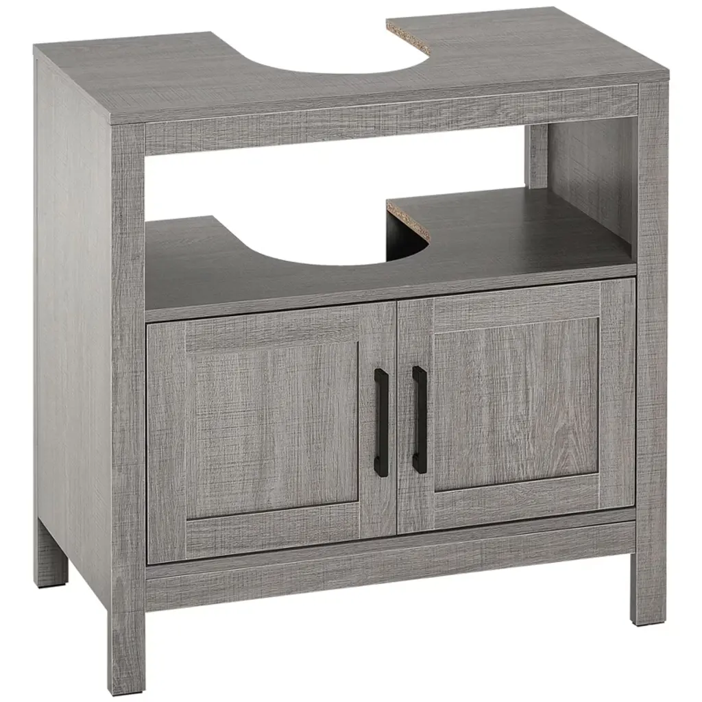 This sink storage tabletop is covered with a walnut wood grain to add natural beauty. The recessed door panel design makes this bathroom cabinet look more appealing, which will be a great addition to any bathroom décor.