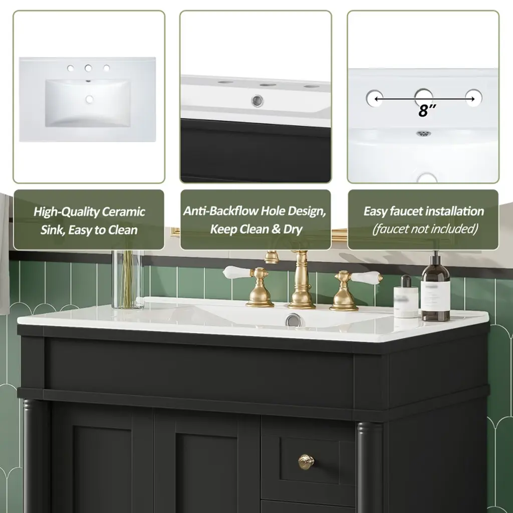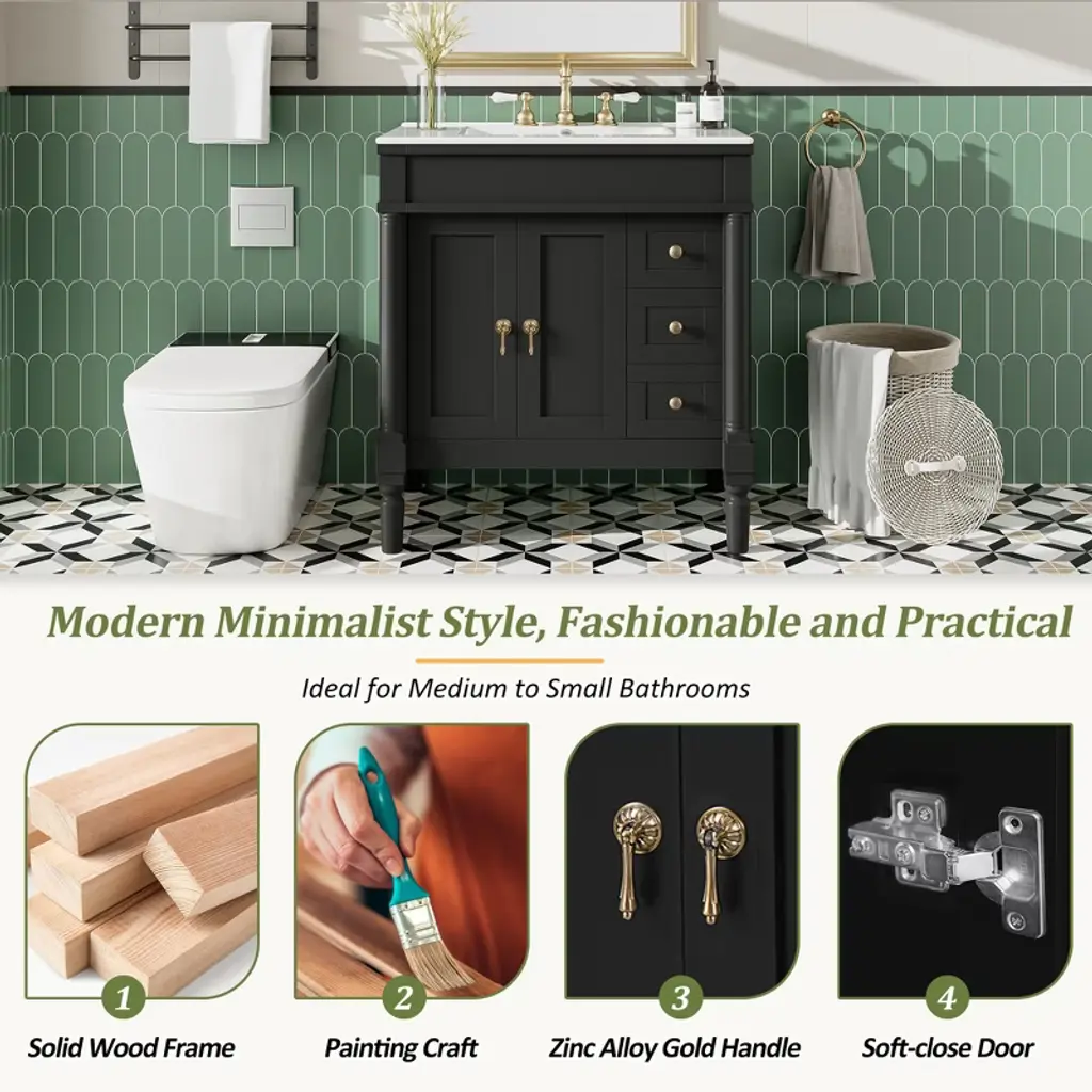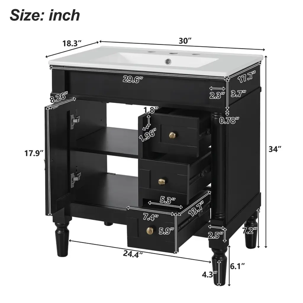 Modern 30-Inch Bathroom Vanity / Stylish and Practical Storage Solution This 30-inch modern bathroom vanity combines function and style, ideal for small to medium-sized bathrooms. It includes a U-shaped adjustable shelf and three drawers for organized storage. The ceramic sink with pre-drilled holes makes faucet installation easy. Soft-close doors and dampened hinges ensure smooth and quiet use. Built with a solid wood frame and MDF, it offers lasting durability and a neat upgrade to your bathroom space. Ample Storage Space with Flexible Design Equipped with U-shaped adjustable shelves and three drawers, it offers ample storage options for organizing various bathroom essentials, keeping your space neat and orderly. Durable Ceramic Sink, Easy to Clean and Maintain Premium ceramic sink with a smooth and refined surface for easy daily maintenance. The integrated overflow hole helps prevent spills, keeping your countertop clean and dry. Comes with three pre-drilled faucet holes for convenient installation and compatibility with various standard faucet styles. Designed for Everyday Convenience This vanity features soft-close doors and smooth drawer rails that minimize noise during use, ensuring a quieter and more pleasant experience. Built to Last with Modern Style This vanity features solid wood legs and corrosion-resistant gold zinc alloy handles, combining long-lasting durability with a sleek modern appearance. Its thoughtfully designed storage layout offers both functionality and style, making it a fashionable and reliable addition to your bathroom. Open Back Design for Easy Installation Open-back design allows easy access to plumbing and makes installation more flexible, saving time during setup. Glide drawer ensures smooth access to your items The drawer features smooth glides for effortless access to your essentials. Its sturdy design ensures durability and ease of use, ideal for daily routines. Adjustable Shelf for Flexible Storage Built-in adjustable shelf allows flexible height customization to accommodate items of various sizes. No matter what you're storing, everything can be neatly organized and easily accessed, maximizing the use of space. Soft-Close Hinges for a Quiet Experience The vanity is equipped with soft-close hinges that allow the doors to close gently and quietly. This helps reduce noise and wear from daily use, enhancing both comfort and long-term durability.