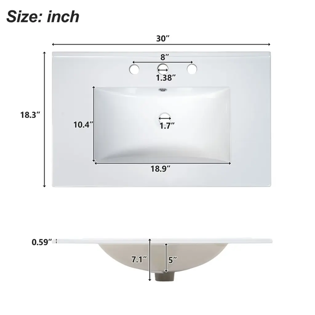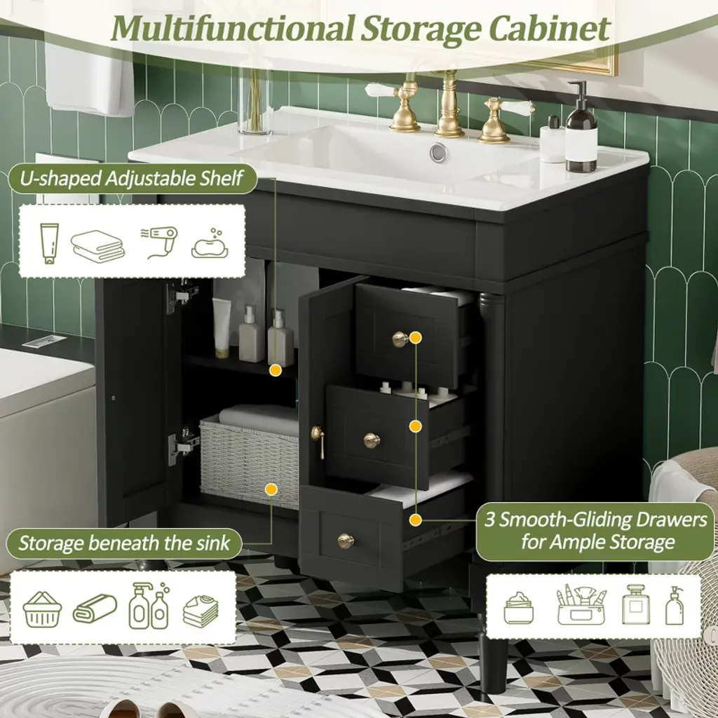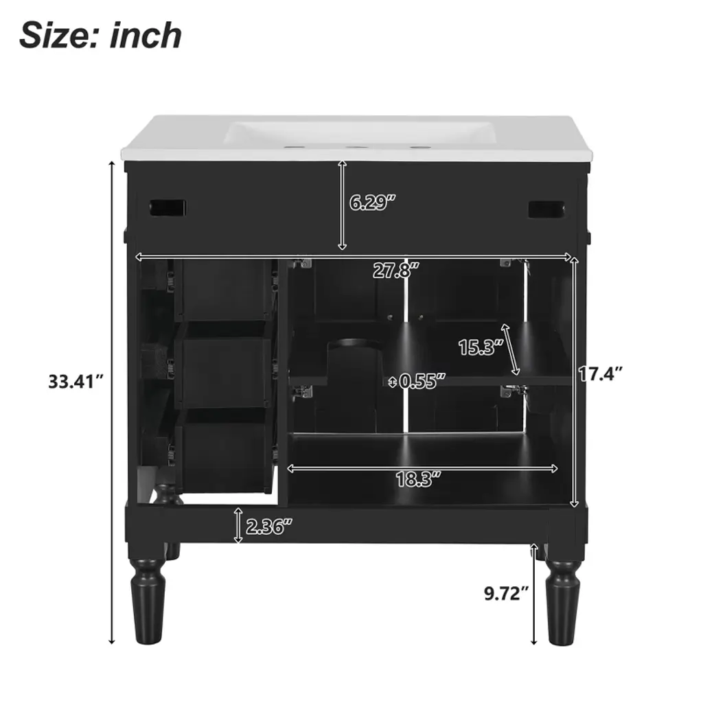 Modern 30-Inch Bathroom Vanity / Stylish and Practical Storage Solution This 30-inch modern bathroom vanity combines function and style, ideal for small to medium-sized bathrooms. It includes a U-shaped adjustable shelf and three drawers for organized storage. The ceramic sink with pre-drilled holes makes faucet installation easy. Soft-close doors and dampened hinges ensure smooth and quiet use. Built with a solid wood frame and MDF, it offers lasting durability and a neat upgrade to your bathroom space. Ample Storage Space with Flexible Design Equipped with U-shaped adjustable shelves and three drawers, it offers ample storage options for organizing various bathroom essentials, keeping your space neat and orderly. Durable Ceramic Sink, Easy to Clean and Maintain Premium ceramic sink with a smooth and refined surface for easy daily maintenance. The integrated overflow hole helps prevent spills, keeping your countertop clean and dry. Comes with three pre-drilled faucet holes for convenient installation and compatibility with various standard faucet styles. Designed for Everyday Convenience This vanity features soft-close doors and smooth drawer rails that minimize noise during use, ensuring a quieter and more pleasant experience. Built to Last with Modern Style This vanity features solid wood legs and corrosion-resistant gold zinc alloy handles, combining long-lasting durability with a sleek modern appearance. Its thoughtfully designed storage layout offers both functionality and style, making it a fashionable and reliable addition to your bathroom. Open Back Design for Easy Installation Open-back design allows easy access to plumbing and makes installation more flexible, saving time during setup. Glide drawer ensures smooth access to your items The drawer features smooth glides for effortless access to your essentials. Its sturdy design ensures durability and ease of use, ideal for daily routines. Adjustable Shelf for Flexible Storage Built-in adjustable shelf allows flexible height customization to accommodate items of various sizes. No matter what you're storing, everything can be neatly organized and easily accessed, maximizing the use of space. Soft-Close Hinges for a Quiet Experience The vanity is equipped with soft-close hinges that allow the doors to close gently and quietly. This helps reduce noise and wear from daily use, enhancing both comfort and long-term durability.