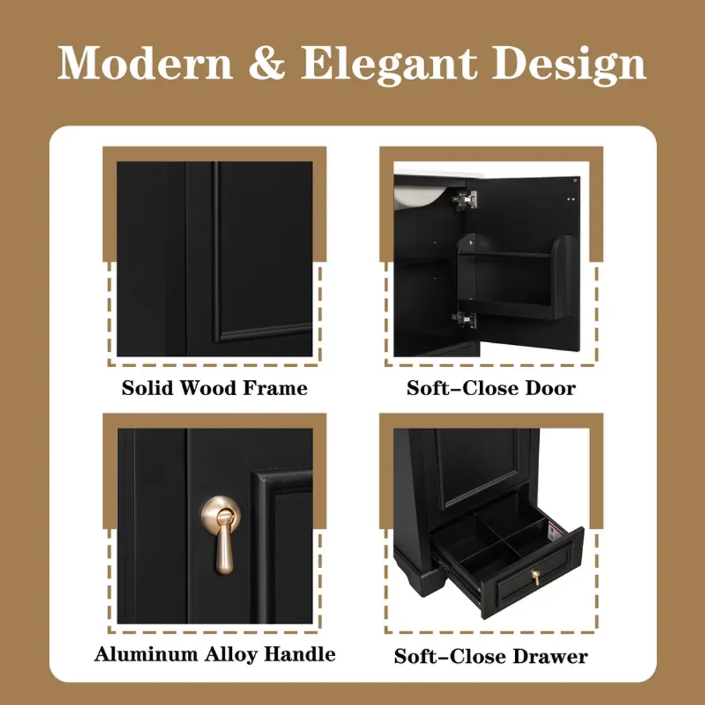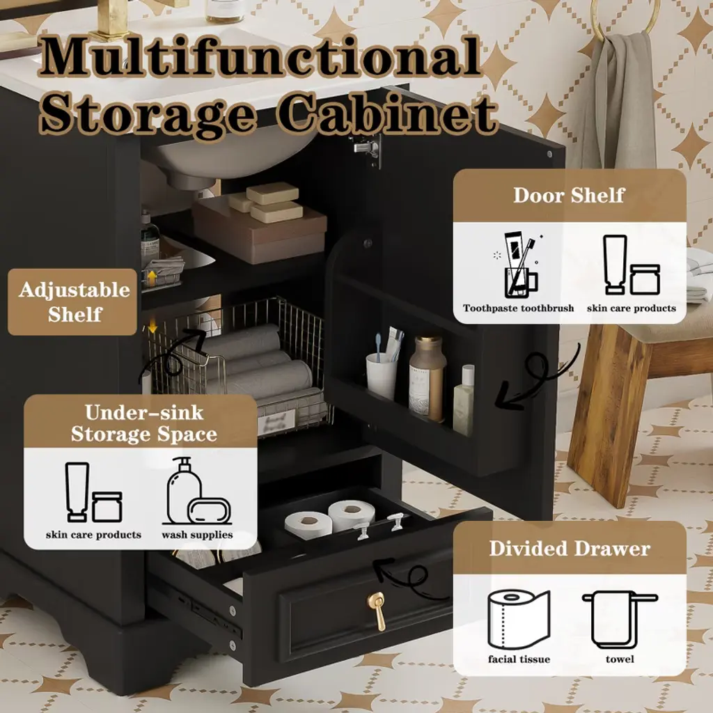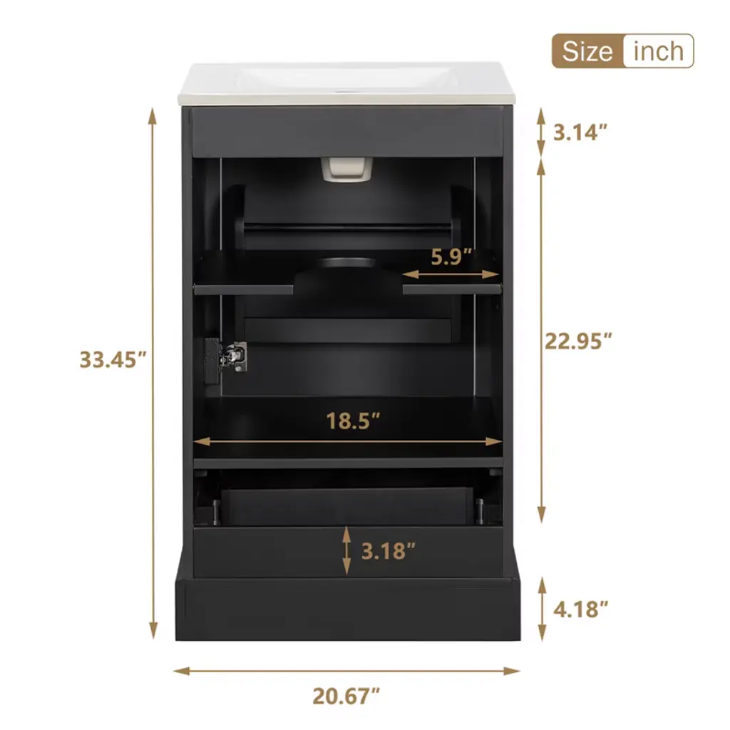 This space-saving 20-inch vanity enhances your bathroom’s functionality and style. Featuring a modern minimalist design, it includes a durable ceramic sink, soft-close door, adjustable U-shaped shelf, a practical compartment drawer, and a door storage rack. The sturdy solid wood frame ensures long-lasting durability, while multiple storage areas help keep your bathroom neat and organized. This vanity features a spacious under-sink cabinet, adjustable shelves, a divided drawer, and a door-mounted organizer, keeping towels, hairdryers, and other essentials neatly arranged and within easy reach. Soft-close doors and drawers reduce noise and enhance everyday comfort, while the adjustable shelf offers flexible storage options to suit your needs. This vanity features a solid wood frame and sleek aluminum alloy handles, offering both modern design and long-lasting reliability. With a door organizer, U-shaped adjustable shelf, and divided drawers, it provides a practical and organized storage solution for your bathroom essentials. The open back design provides convenient access to plumbing, making installation faster and more flexible. It also allows better airflow, helping to reduce moisture buildup behind the cabinet. The compartment drawer offers organized storage by separating bathroom essentials for easy access. This design uses space efficiently and helps keep the bathroom tidy. Soft-close hinges provide a smooth and silent door-closing experience, preventing slamming and reducing wear. This feature enhances both safety and longevity, creating a more peaceful and durable bathroom setting.