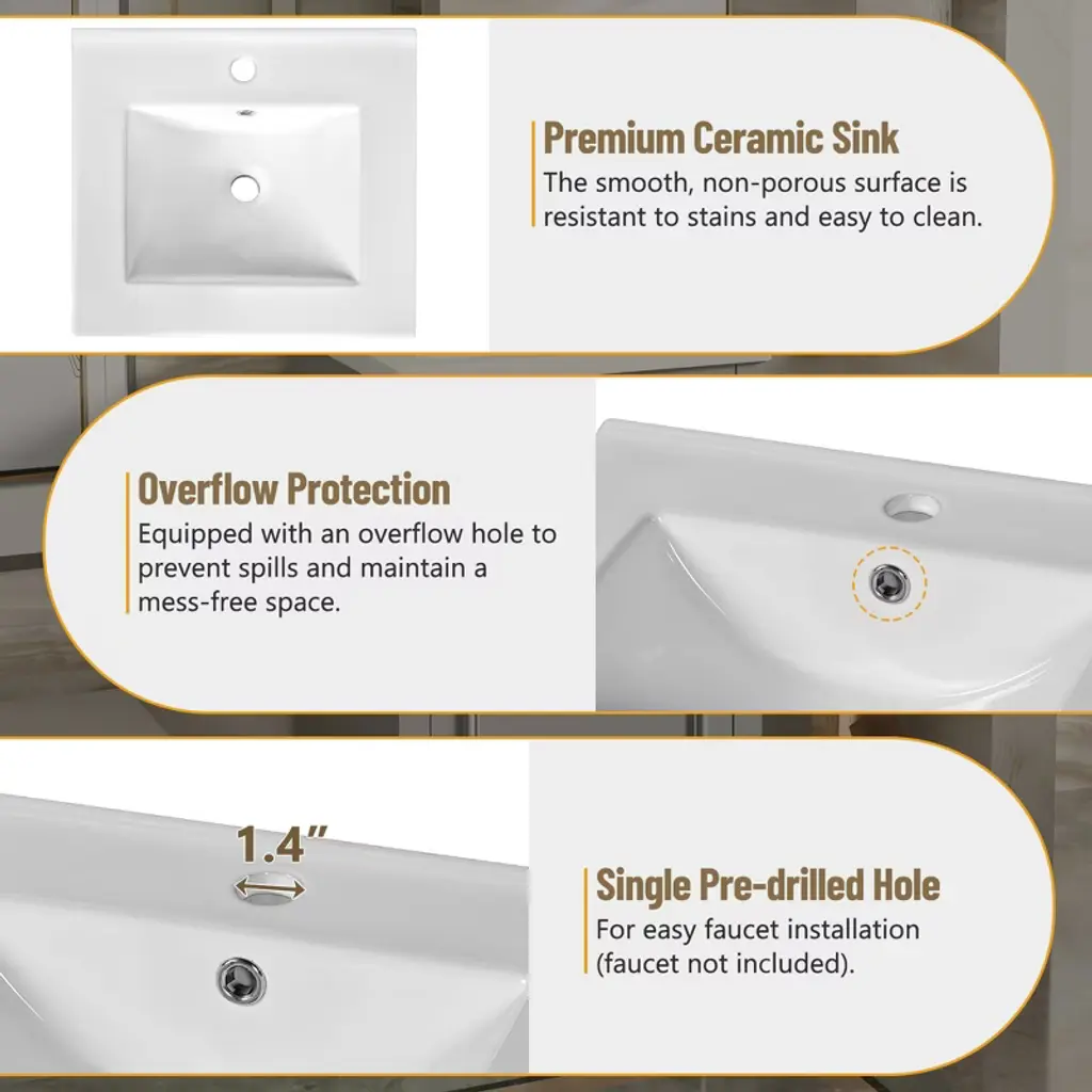 Upgrade your bathroom with our 20-inch vanity, a perfect blend of functionality and timeless elegance. Picture the smooth ceramic sink, gleaming under soft light, offering easy maintenance and daily convenience. The vintage water-drop shaped metal handle adds a touch of nostalgia, inviting you to open its soft-close doors with a whisper. Inside, adjustable shelves and a door-mounted rack create abundant storage for all your essentials, keeping your space clutter-free. This compact vanity fits seamlessly into small bathrooms, transforming them into serene, organized retreats. Let the clean lines and thoughtful design elevate your bathroom to a place of calm and beauty, where every morning feels like a fresh start. With adjustable shelves and a door-mounted rack, this vanity offers abundant storage options to keep your bathroom essentials neatly arranged and within easy reach. This vanity features a solid wood frame and aluminum alloy handles, combining modern design with lasting durability. It is equipped with a door organizer and adjustable internal shelves, providing a thoughtful and organized storage solution for daily essentials. The open back design provides convenient access to plumbing, making installation faster and more flexible. It also allows better airflow, helping to reduce moisture buildup behind the cabinet. Designed with a sink cabinet, U-shaped adjustable shelf, and door organizer, this vanity keeps daily items like towels and hairdryers organized and easy to access. This sink features a smooth ceramic surface that resists stains and is easy to clean. The built-in overflow hole helps prevent water from spilling over, keeping your bathroom neat and dry. The U-shaped adjustable shelf fits neatly around plumbing while allowing you to customize the space for items of different sizes. Soft-close hinges offer quiet operation and added safety, ideal for everyday use. Integrated door shelf stores toothbrushes, skincare, and other daily items for easy access.