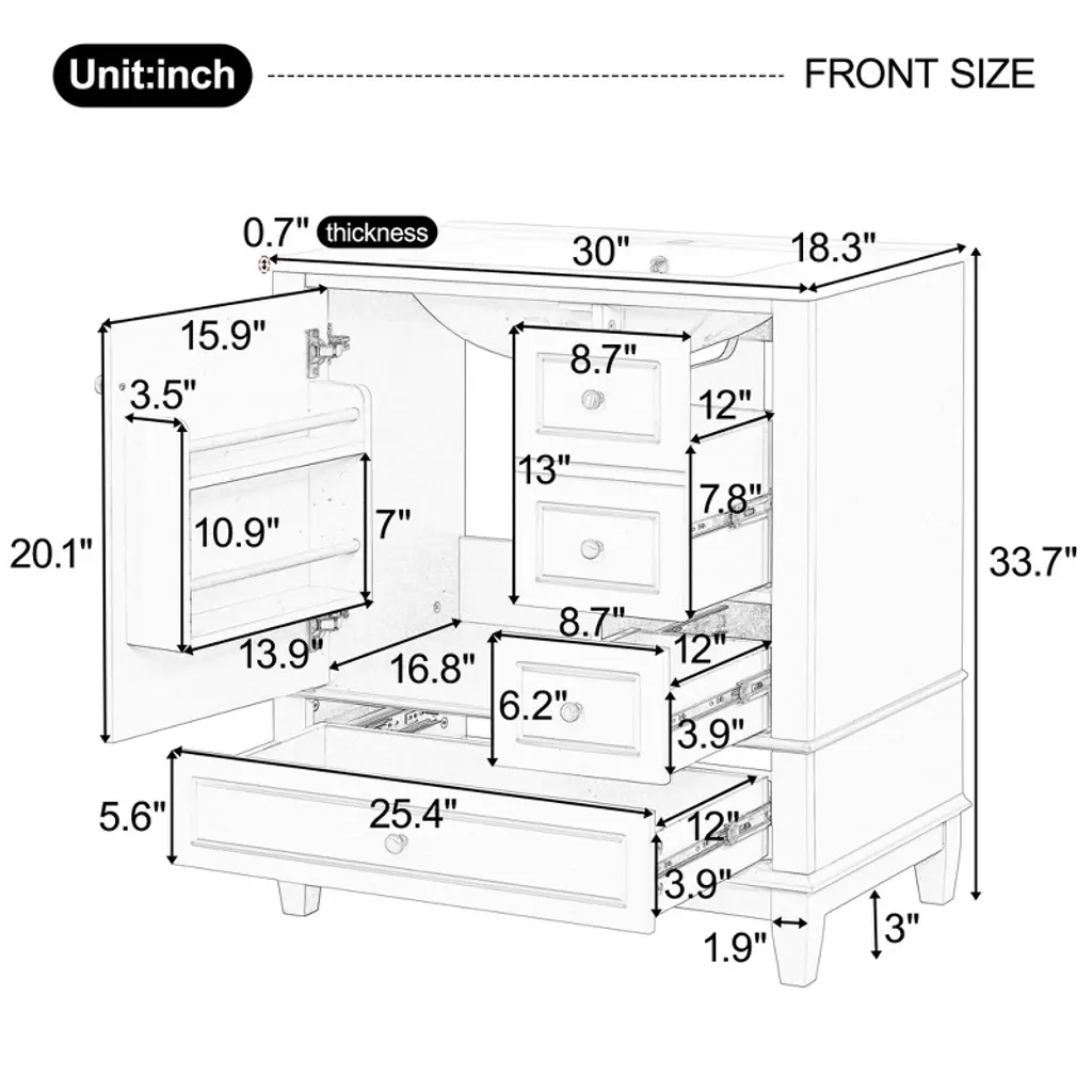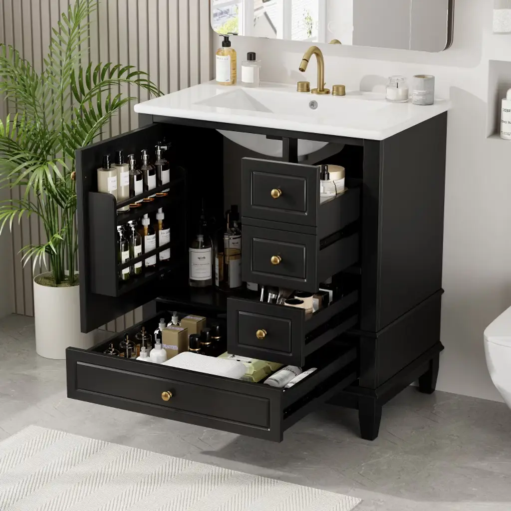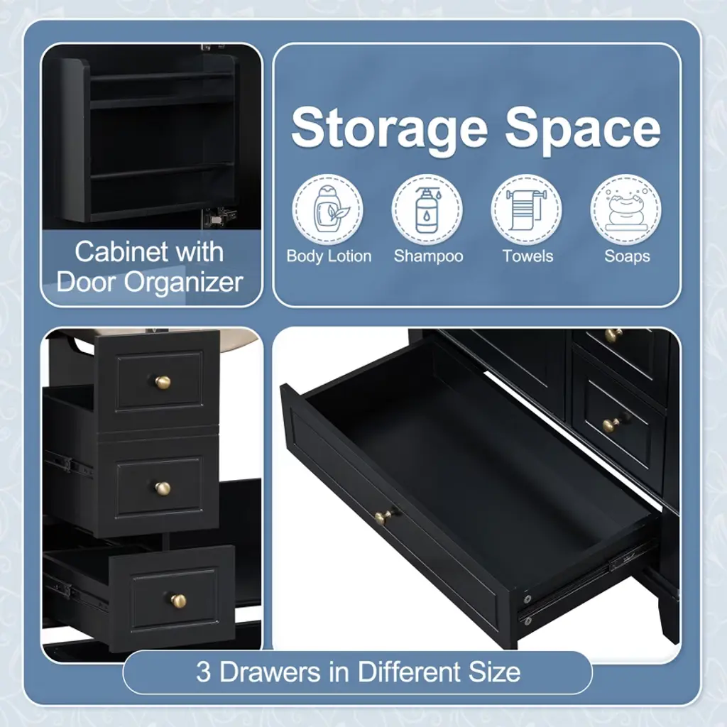 This bathroom vanity has ample storage space: one door with two-tier storage shelf and three drawers in different sizes. You can put soaps, towels, shampoos, tissue paper and other bathroom essentials in it so to keep them away from dust.