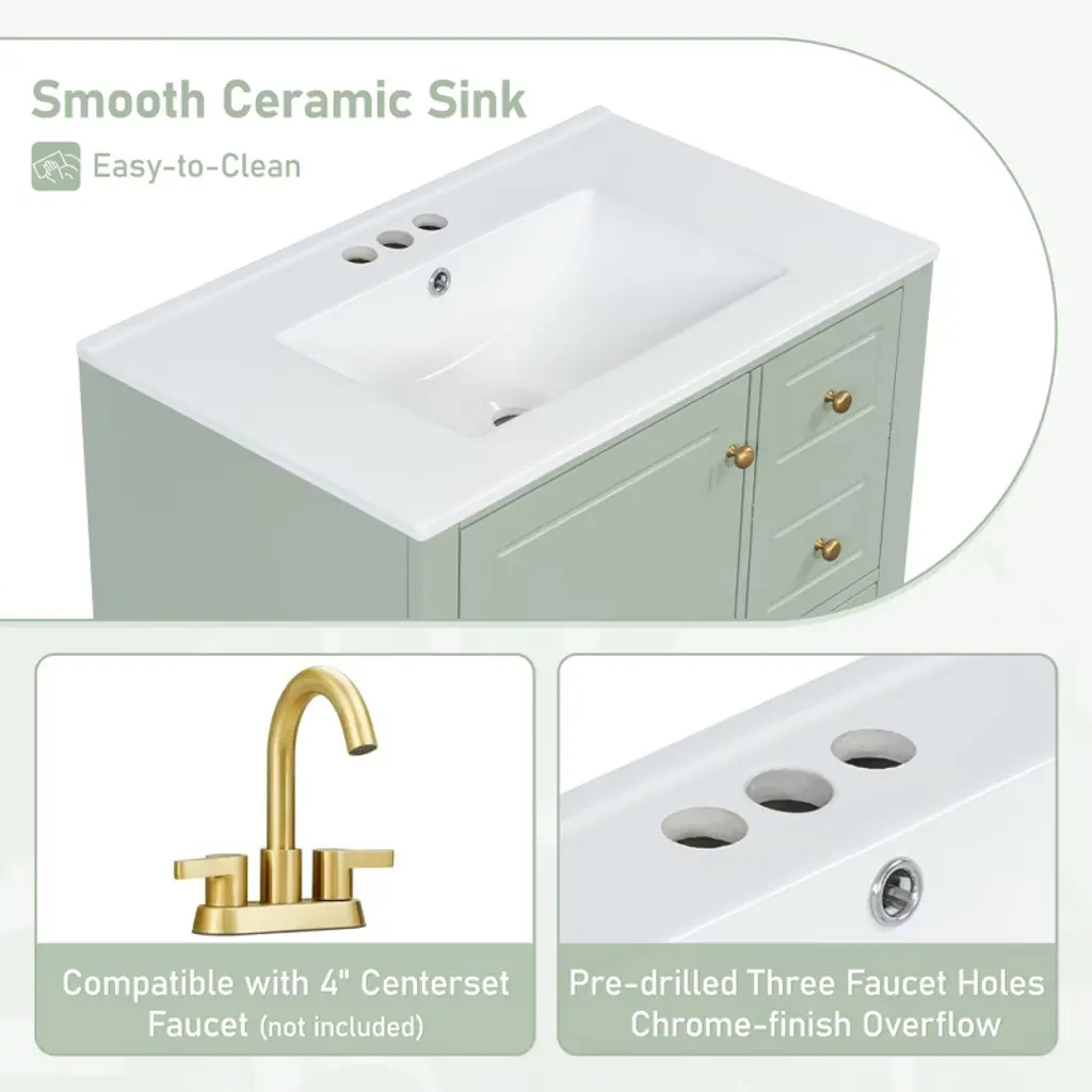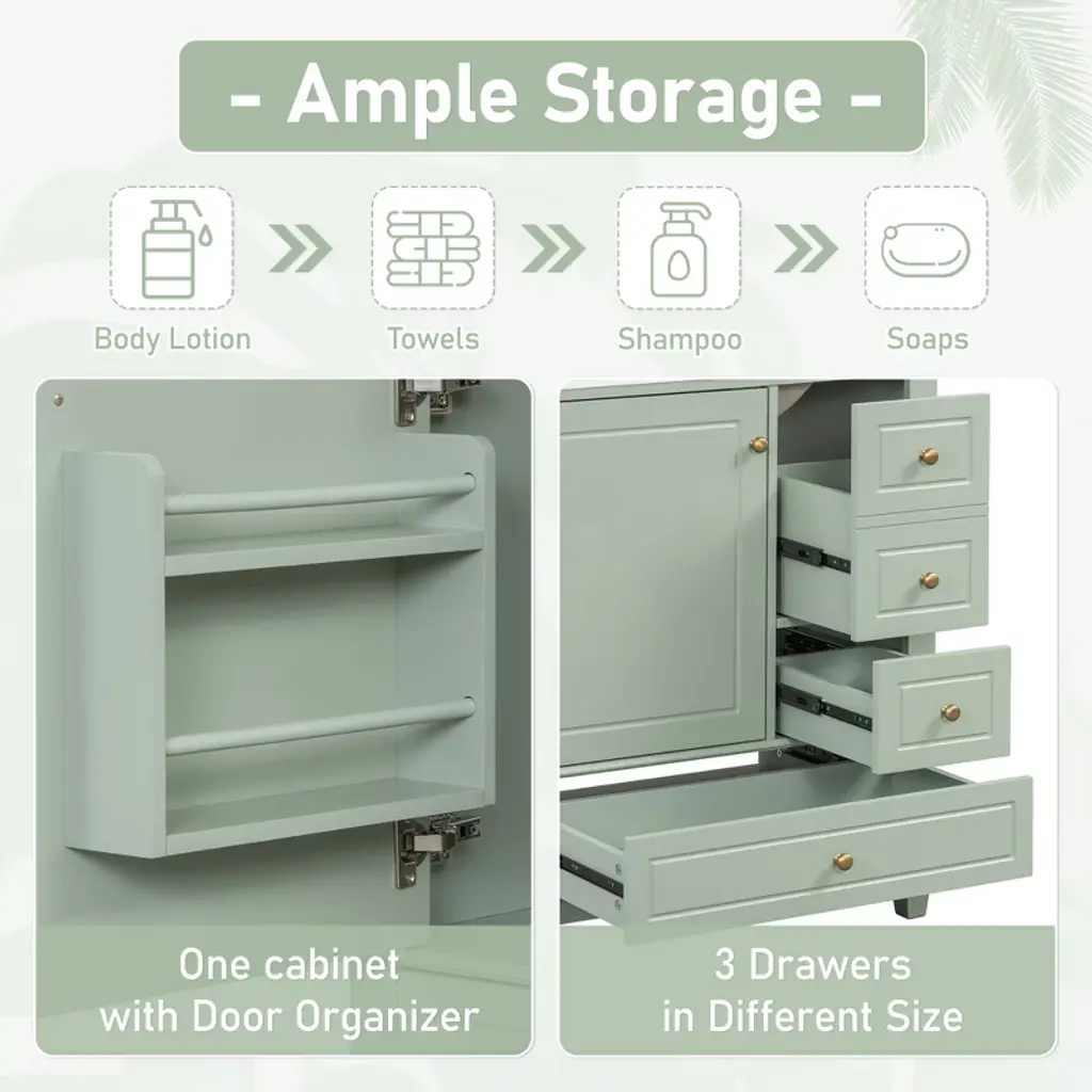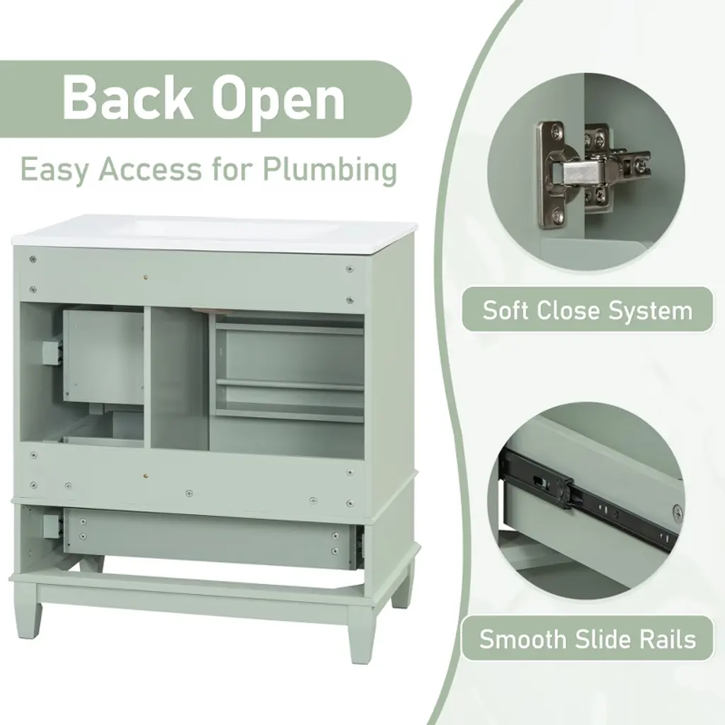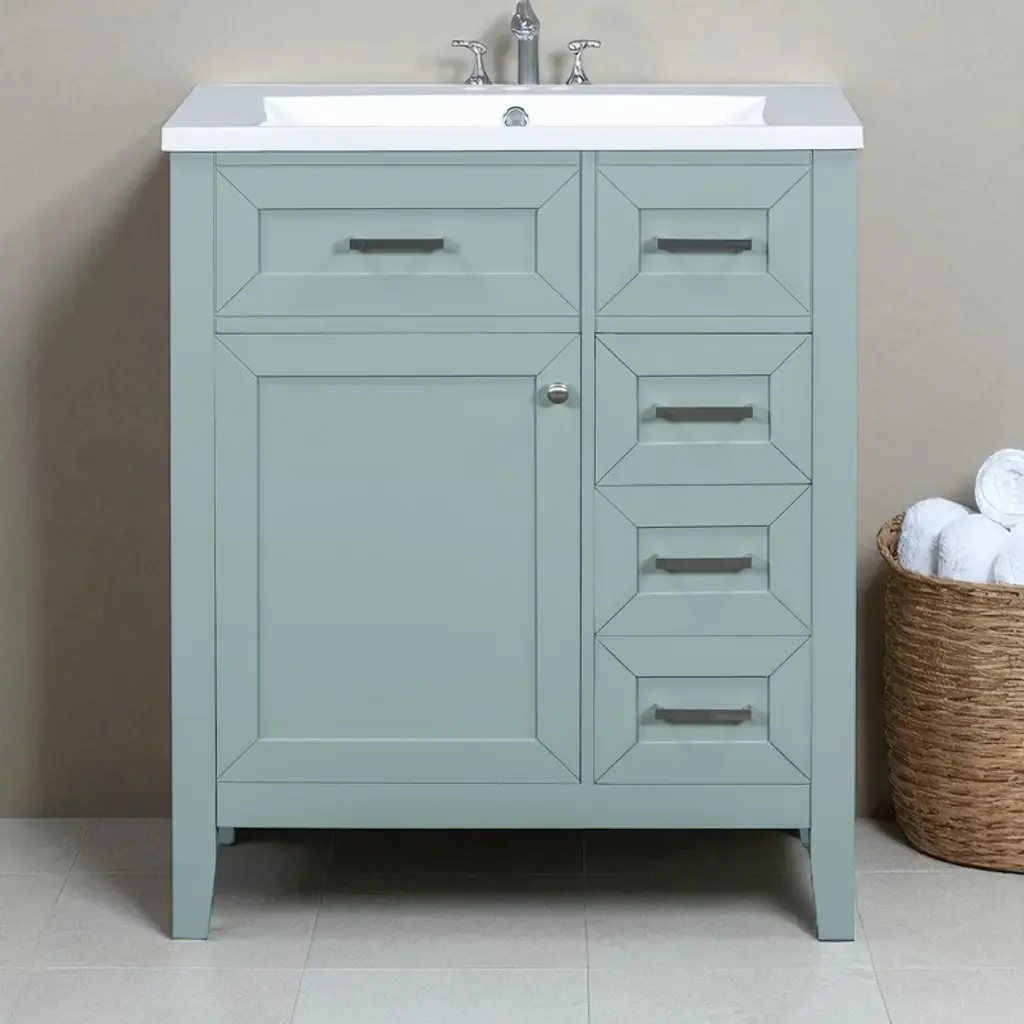 30" bathroom vanity with a light green finish and freestanding structure, adding a modern touch to any bathroom decor while optimizing space.