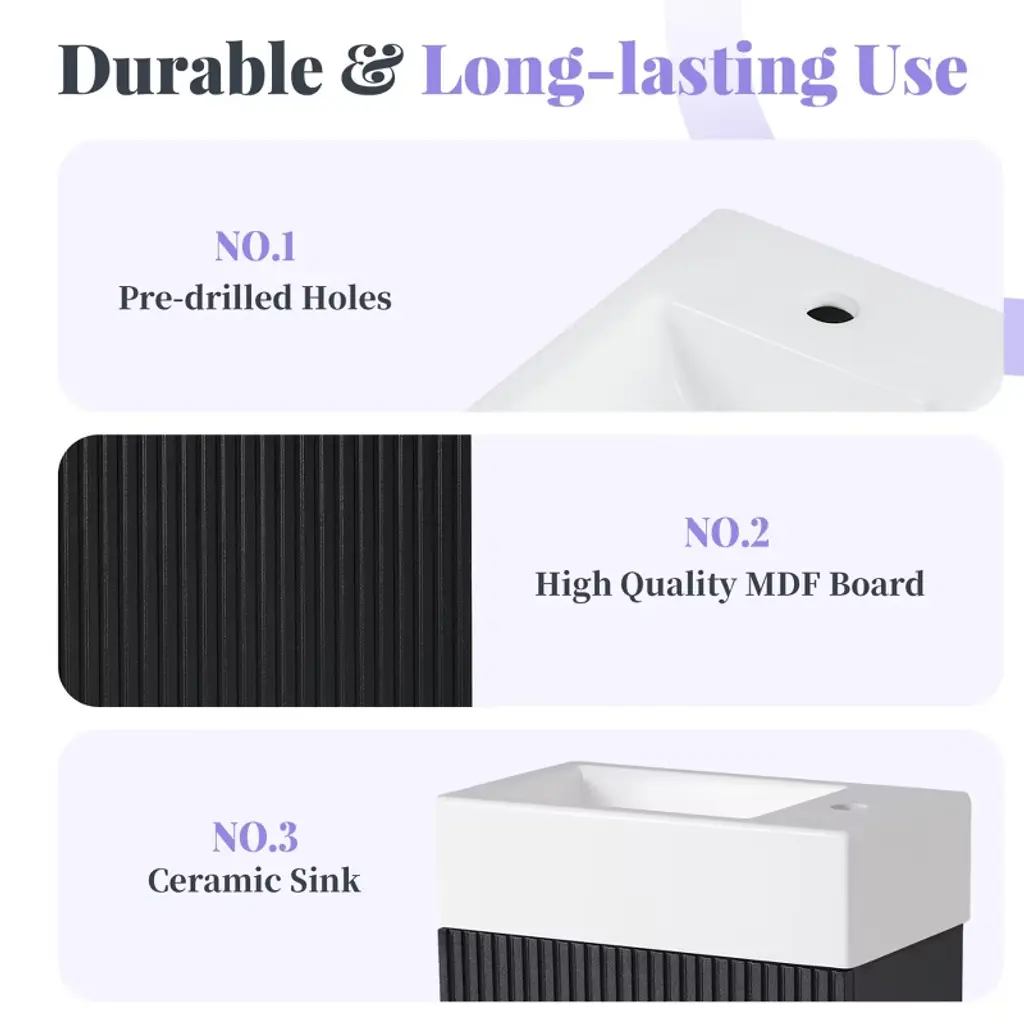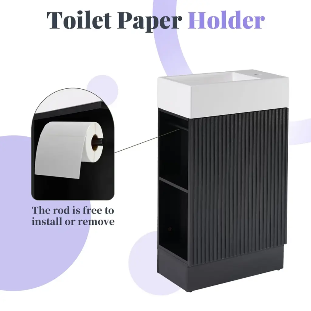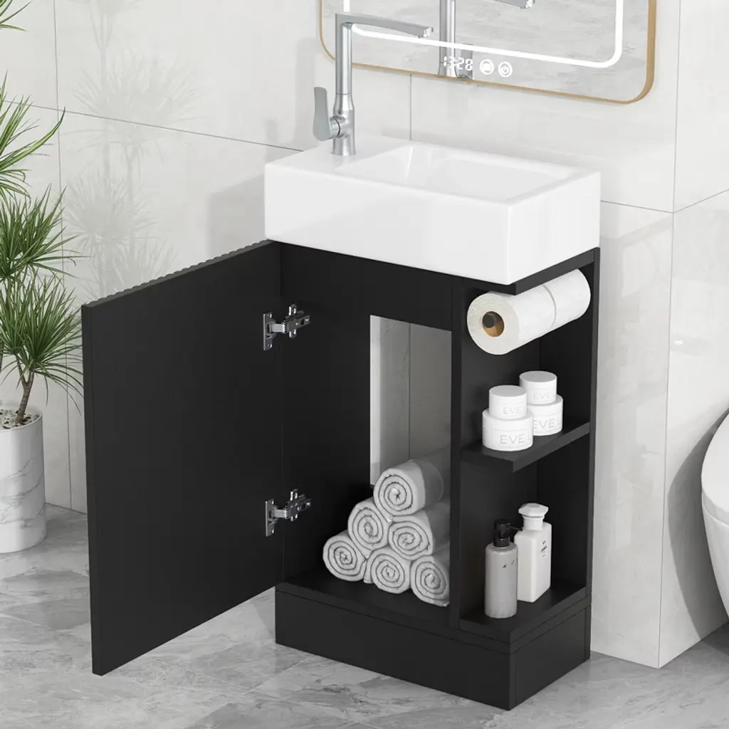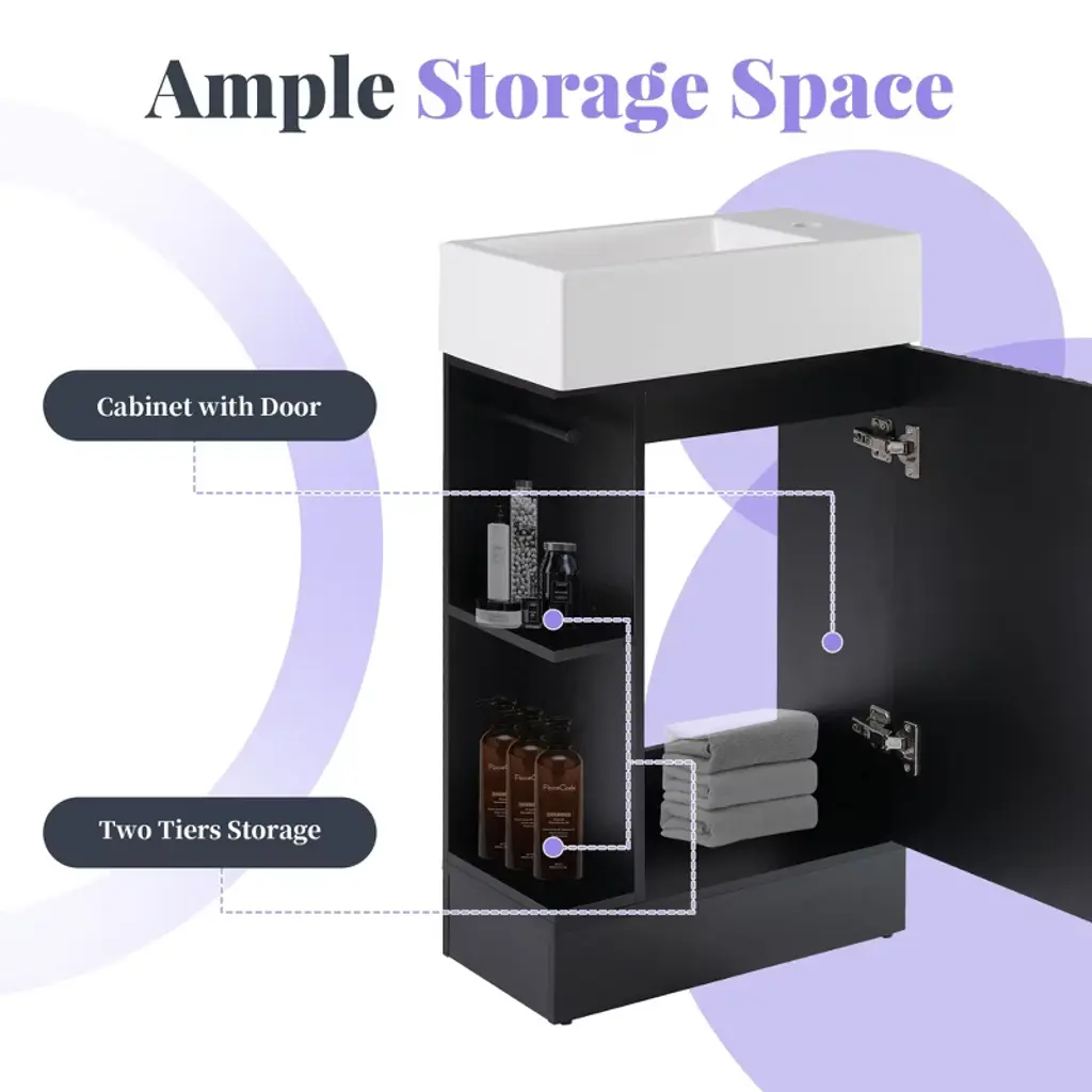 This bathroom vanity has different storage space: one cabinet with door, two-tier storage shelf on the side, and toilet paper holder. You can put soaps, towels, shampoos, tissue paper and other bathroom essentials in it.