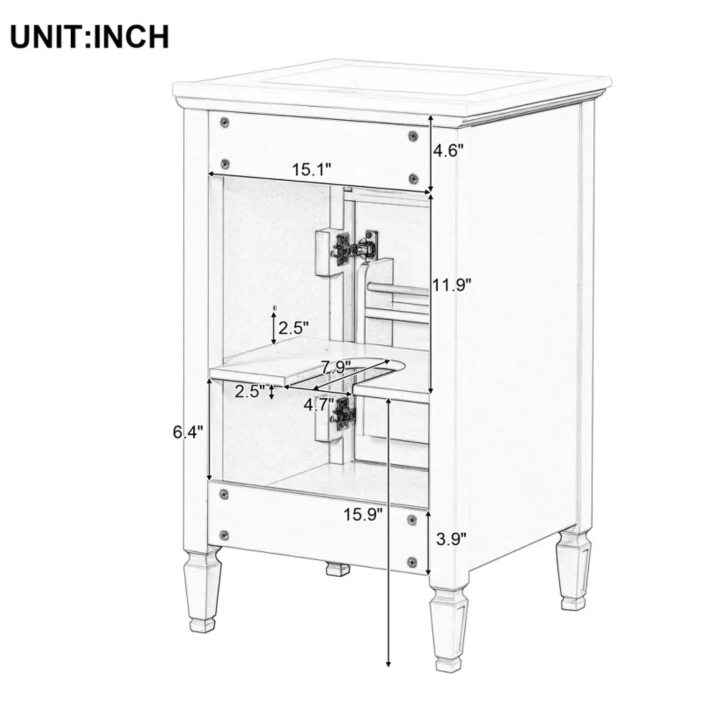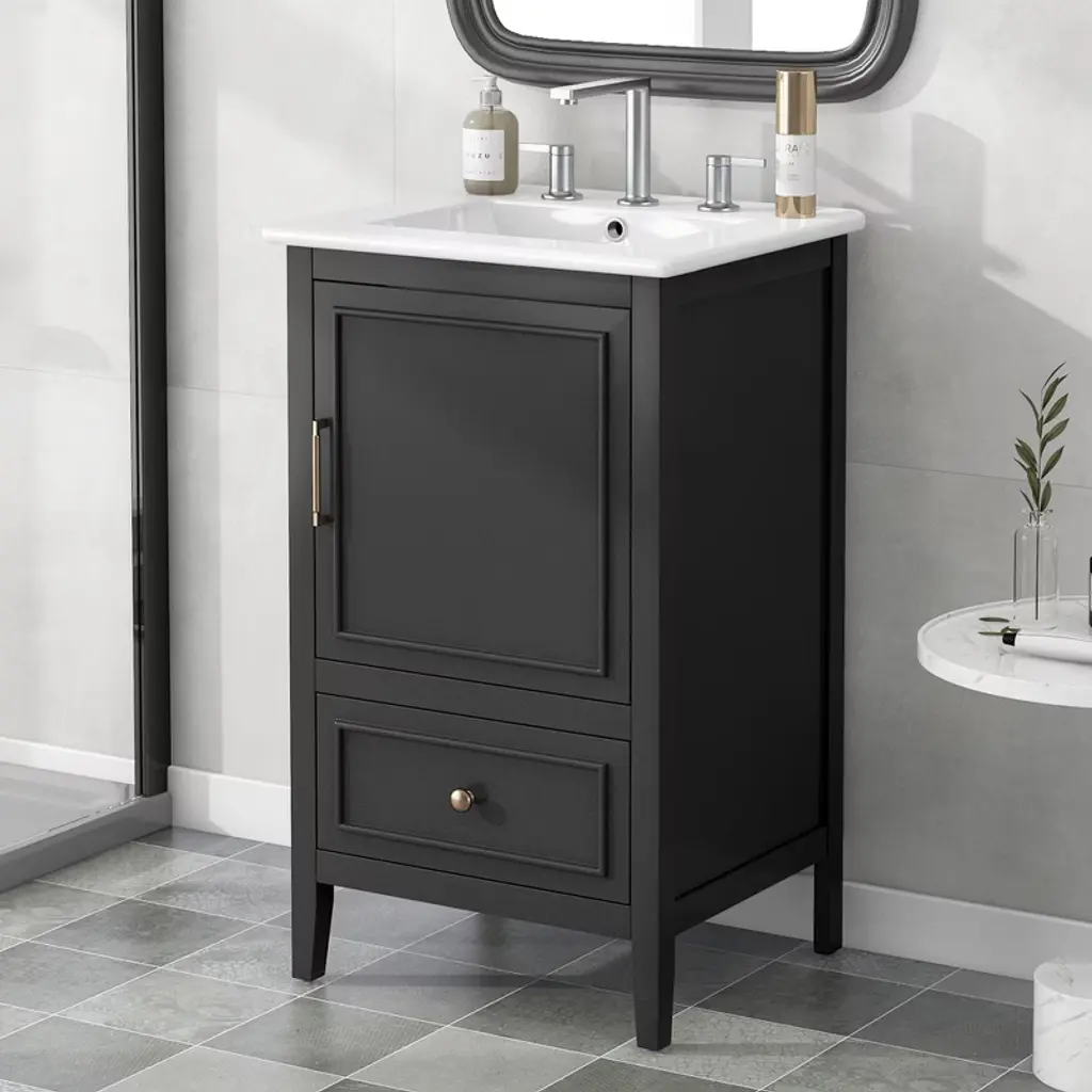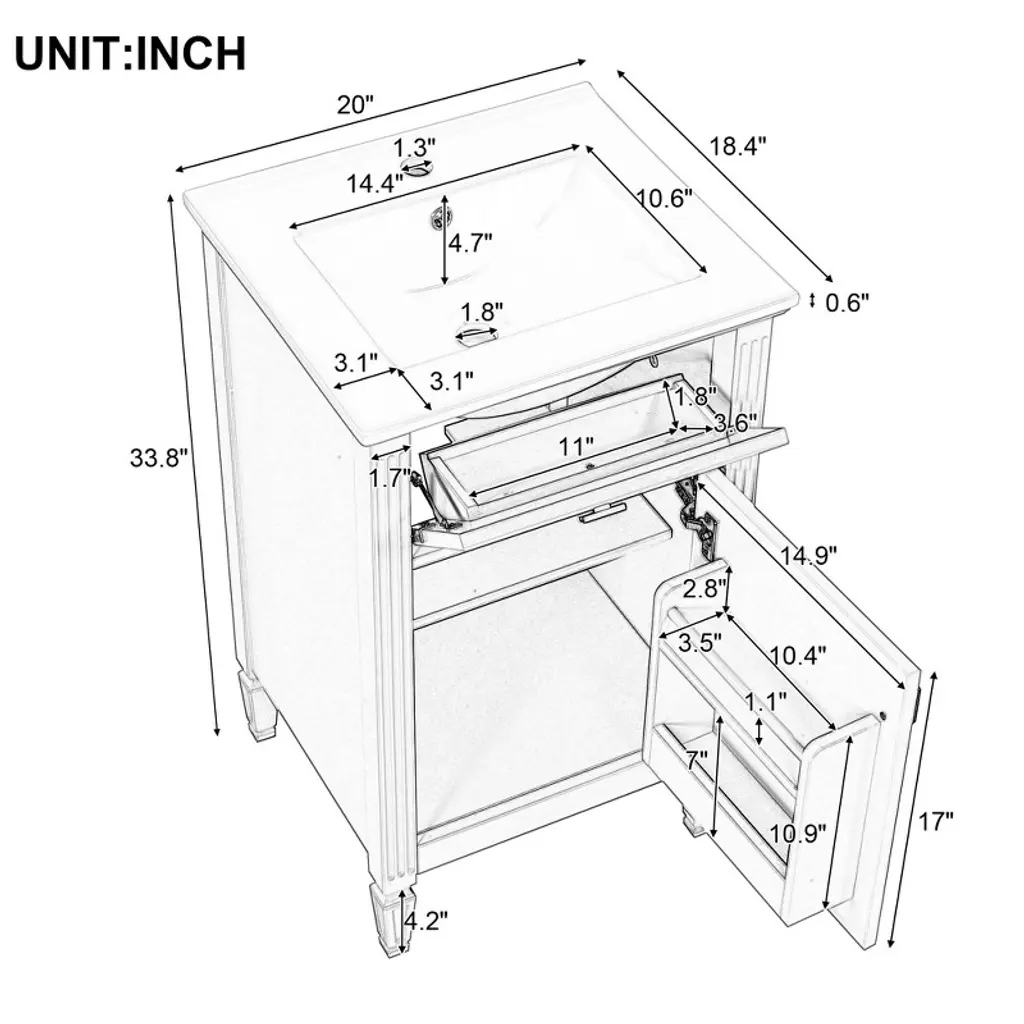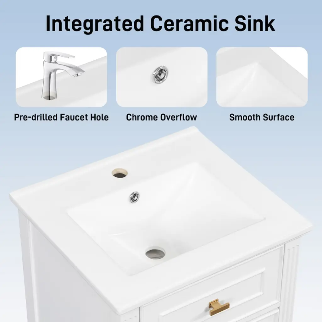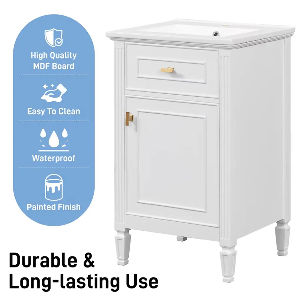 Key Product Features / Bullet Points】 1. Space-Saving & Stylish – Perfectly sized for compact bathrooms, this 20" freestanding vanity offers a clean, modern look with maximum storage functionality. 2. Durable Construction – Built with a solid rubberwood frame, MDF panels, and real wood legs for lasting durability and strength. Holds up to 150 lbs total. 3. Functional Storage Options – Features a tilt-out drawer for small items and an inner adjustable shelf for organizing taller bottles and toiletries. 4.Premium Zinc Alloy Handles – Comes with modern gold-finished metal knobs that are both elegant and easy to grip. 5.Easy Assembly & Maintenance – Pre-drilled single faucet hole and overflow included. Simple structure for quick setup. Faucet and drain not included.