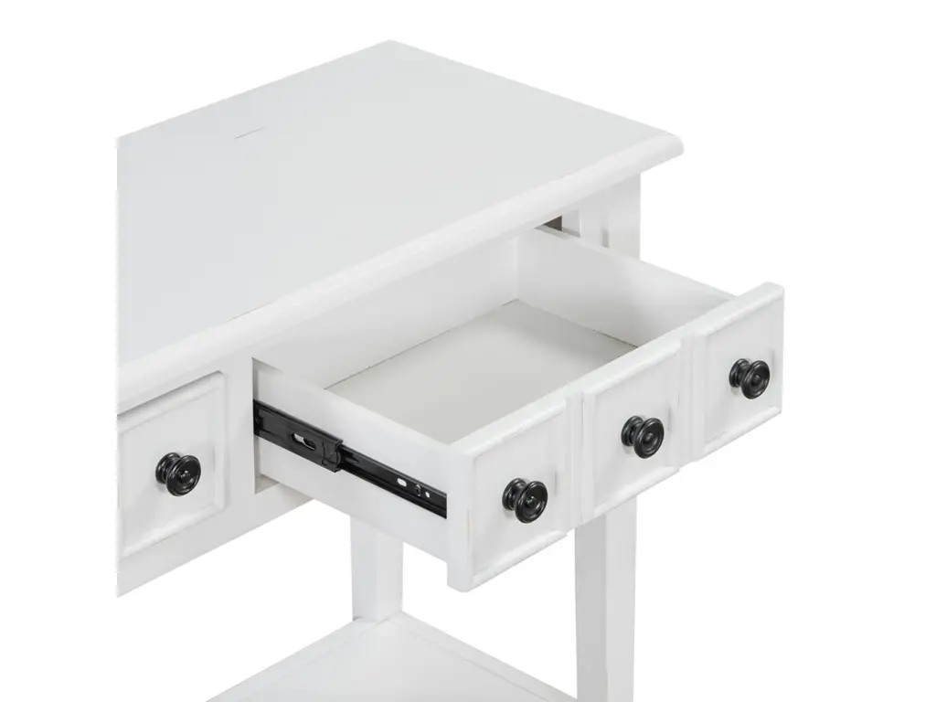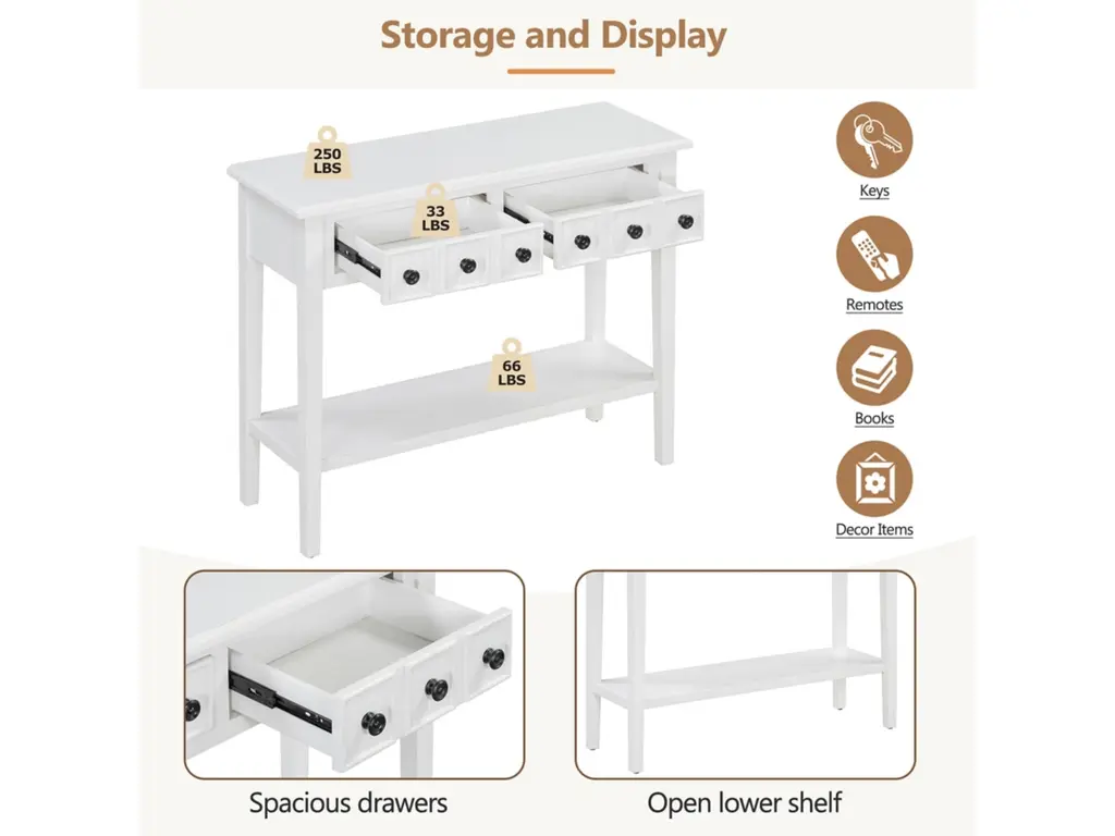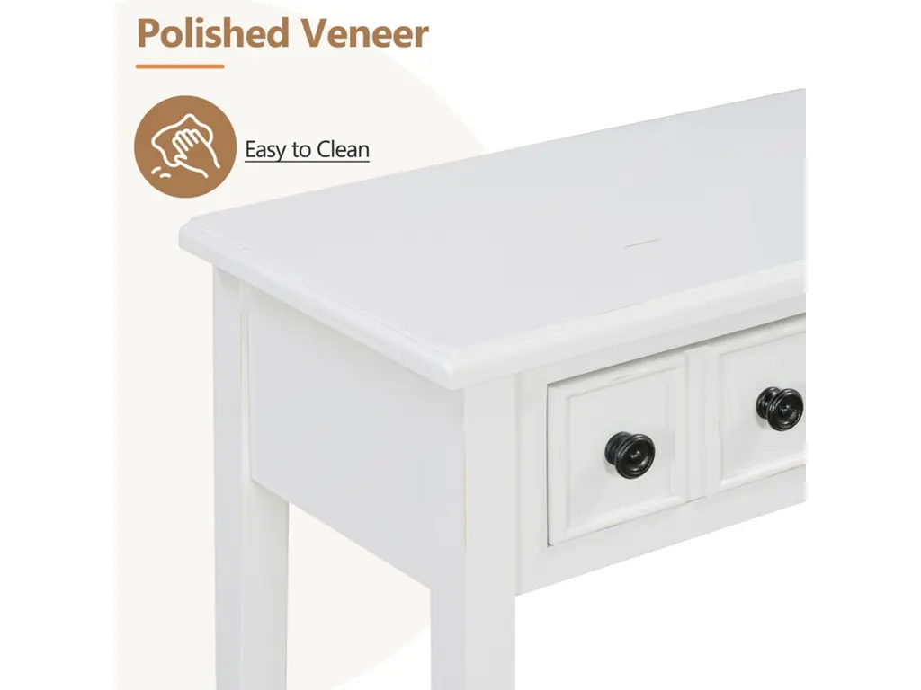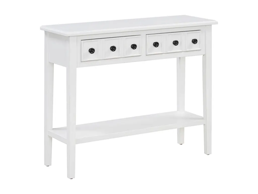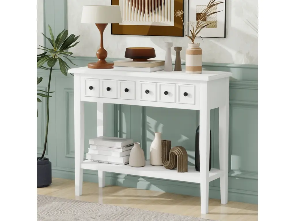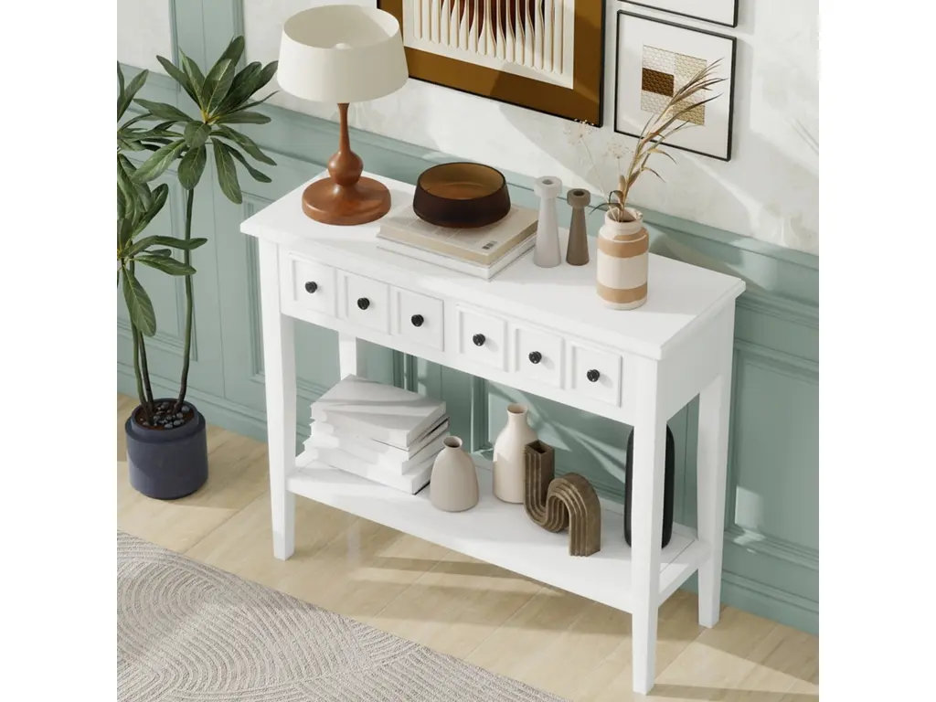 Embrace the charm of our wooden vintage console table, designed to elevate your entryway. This exquisite piece, crafted from solid wood with a distressed finish, exudes a timeless. Its spacious top and lower shelf provide ample space for keys, mail, and decor, while the sturdy construction ensures lasting quality. Perfect for adding a touch of classic elegance to your foyer, this console table is both functional and aesthetically pleasing.