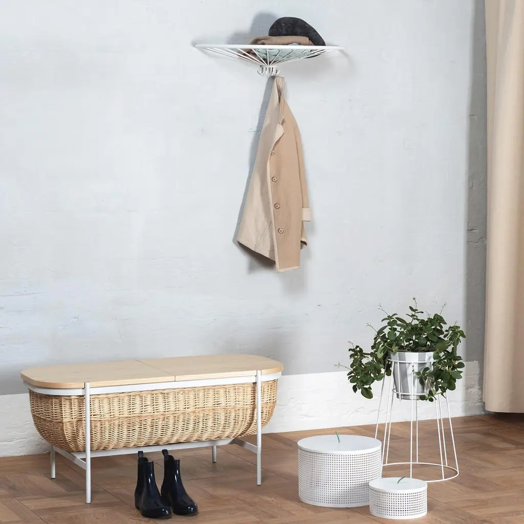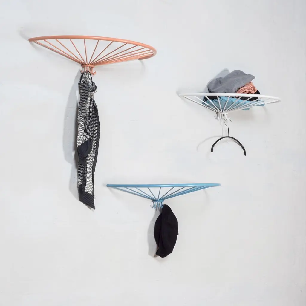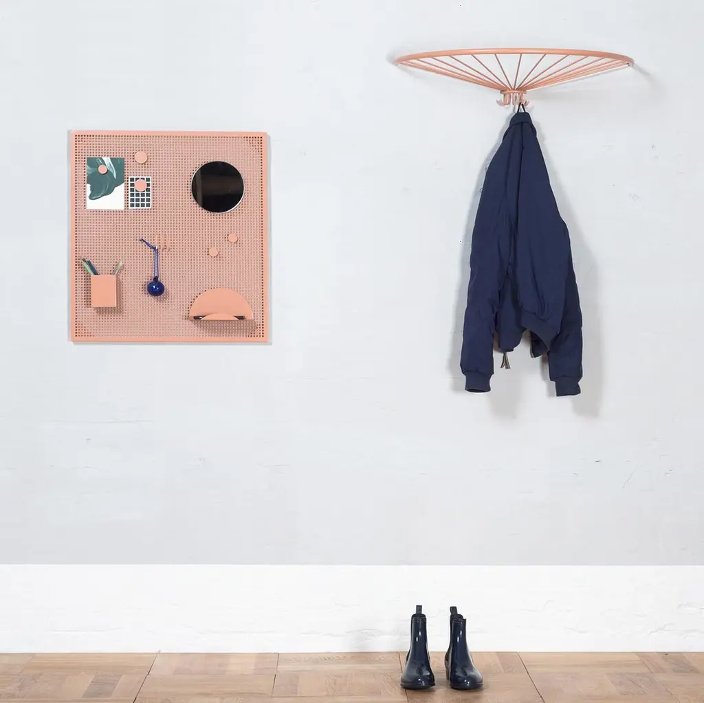 Dusty Peach Pina Hat Shelf by OK DesignDimensions: D 35 x W 68 x H 13 cm.Materials: Powder-coated metal.Available in black, white, sea green, pigeon blue, or dusty peach. Please contact us.The Pinna Hat Shelf is a stylish and functional accessory for any home. Designed by Finnish designer Anni Pitkäjärvi, this hat shelf and coat rack features a simple yet powerful design that is highly decorative in the hallway and entrance. The shelf is made of powder-coated metal and comes with a shelf and 5 hooks to store your hats, coats, and other accessories.Pinna picks up on OK Design’s tradition for shapes and silhouettes. Its sleek and minimalist design makes it suitable for any modern interior. This shelf is perfect for small spaces and can be easily mounted on the wall.OK Design was founded by the Danish couple: Jacob Fasting and Kirsten Krogh. Jacob began his entrepreneurial life by founding the first bicycle courier company in Mexico City. Later his adventurous spirit led him down a new, creative path together with the architect Kirsten Krogh.Kirsten and Jacob initiated their success in Europe by introducing the traditional woven furniture from Mexico. Today they create in-house furniture as well as work in collaboration with international designers.OK Design is based in Copenhagen, the environmentally friendly production takes place in the EU, and the designs are sold in more than 40 countries worldwide.Their latest endeavour is Stella Atlántico in Isla de la Palma. A 4 floor building reaching towards the stars and located on the rim of the world’s largest erosion crater. Stella Atlántico functions as a combined visual showroom and holiday home.