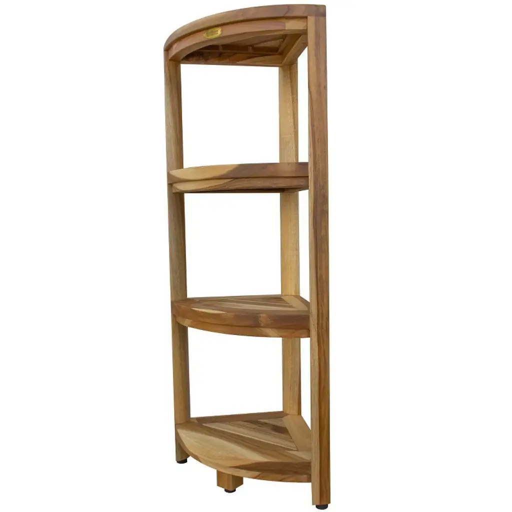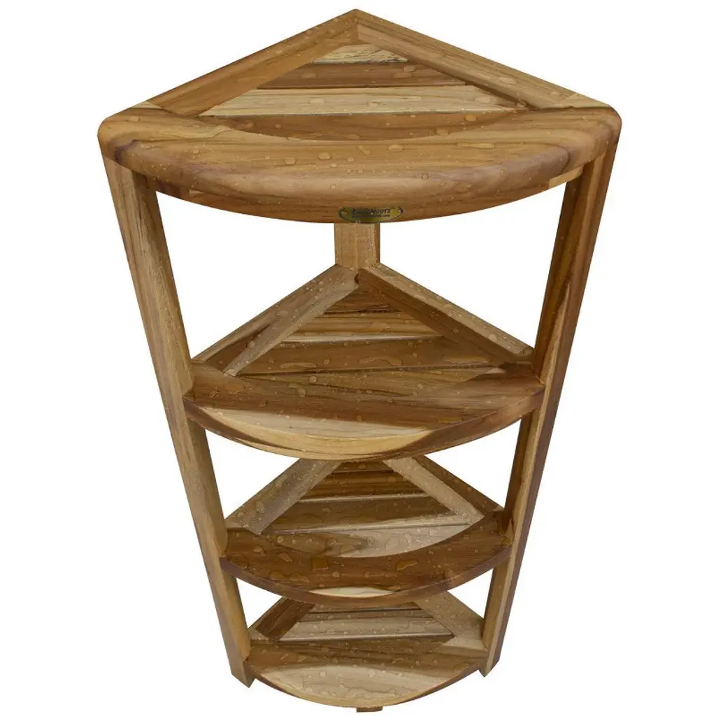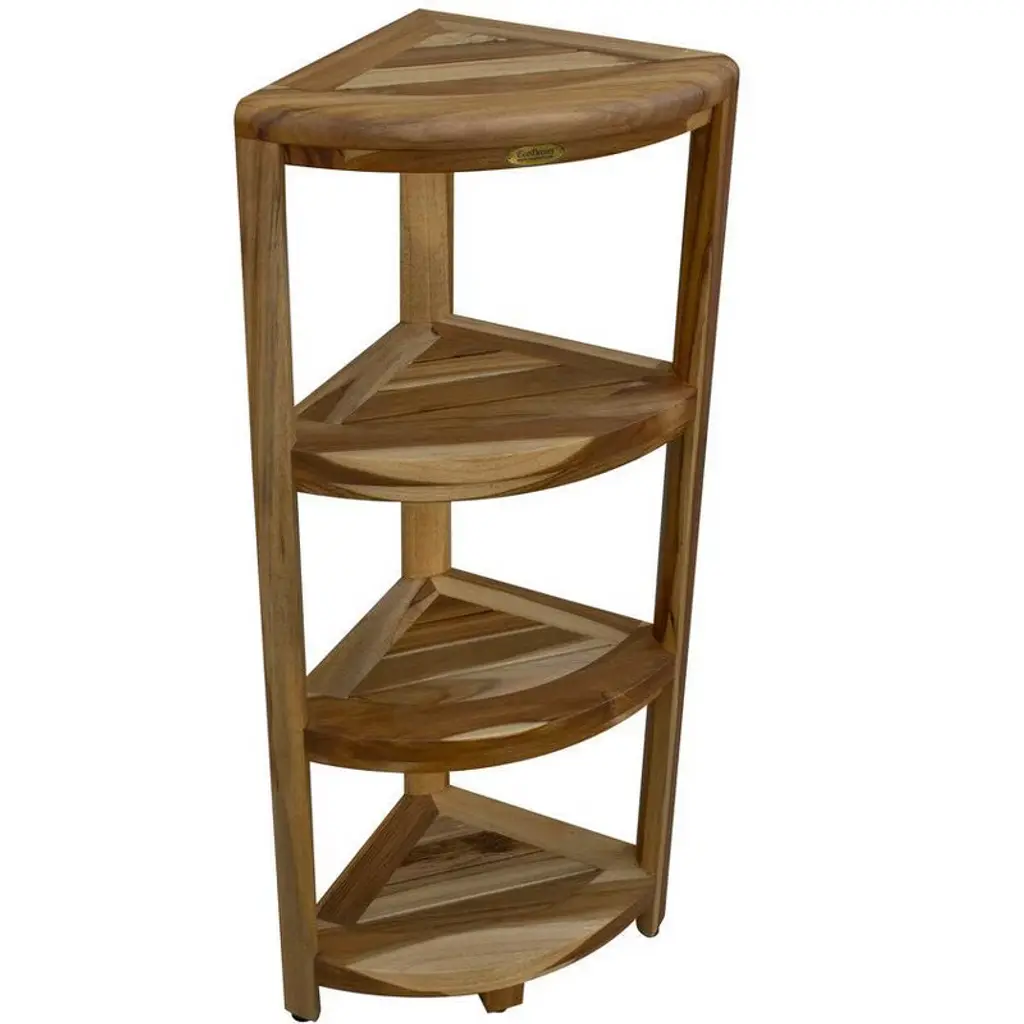 Introducing the EcoDecors® SnazzyCorner® 38" Teak Wood 4-Tier Corner Shelf in EarthyTeak Finish, a versatile and practical storage solution for your bathroom or any corner of your home. Crafted from solid plantation teak wood sourced from Indonesia, this corner shelf exhibits natural water resistance, making it suitable for both indoor and outdoor use. The EarthyTeak finish adds a touch of elegance and complements any décor style. Featuring a 4-tier design, this teak wood corner shelf provides ample storage space for your shower products, towels, or any other items you need to keep organized. Keep your essentials within easy reach, and enjoy a clutter-free bathing space. The adjustable rubber feet ensure stability and level the shelf on uneven floors, preventing any wobbling and ensuring a secure placement. You can confidently place it on any surface without worry. Designed with slatted shelves, this corner shelf allows efficient water drainage, ensuring your items stay dry and preventing water from accumulating on the surface. For added durability, galvanized steel hardware is used, preventing rusting and ensuring the longevity of this teak wood corner shelf. Dimensions: 17"L x 12"D x38"H Assembly Required