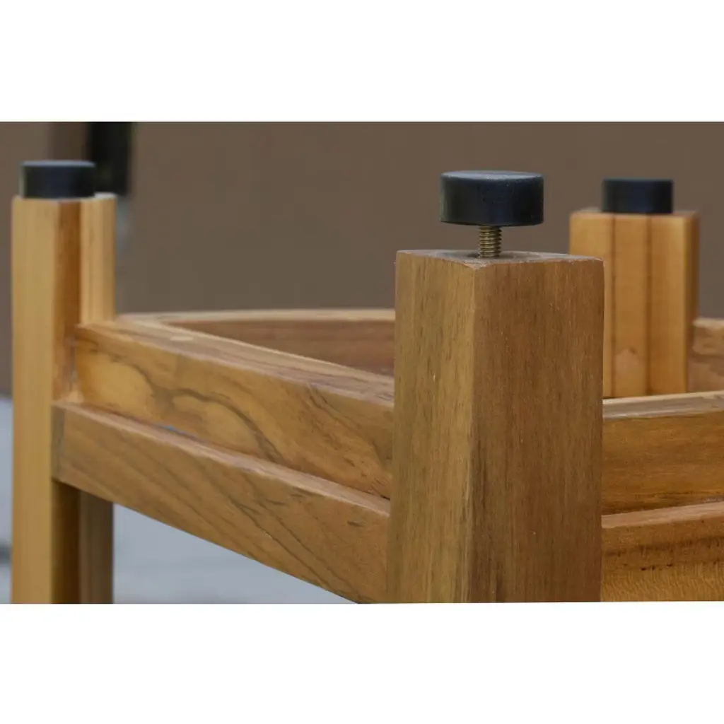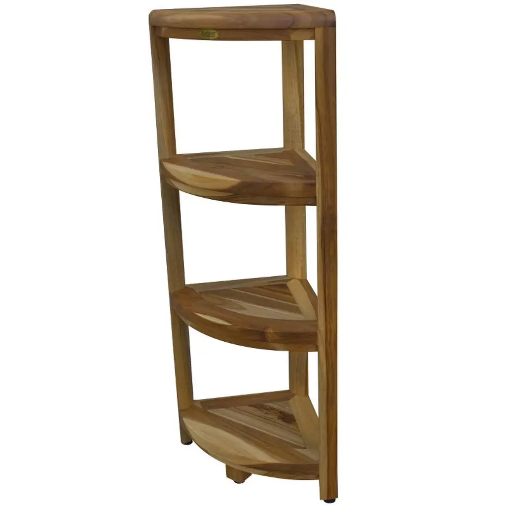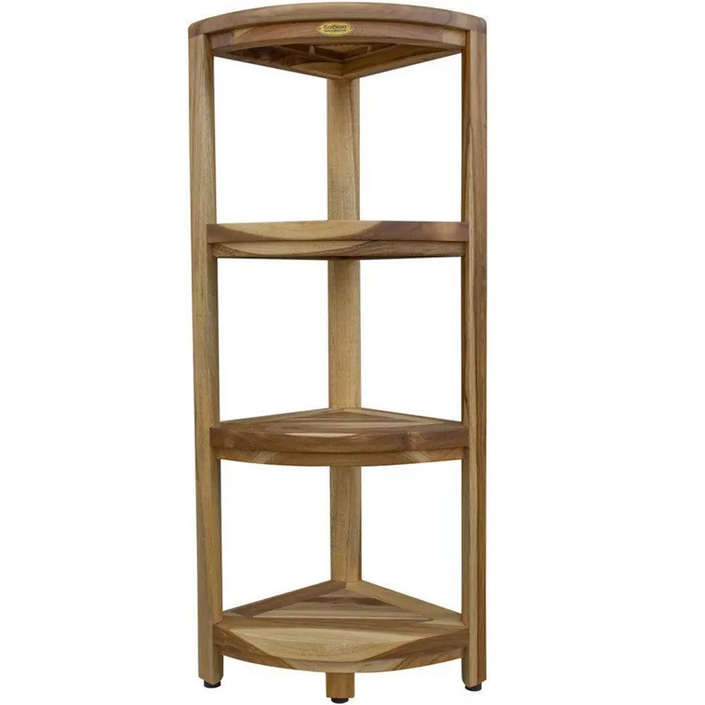 Introducing the EcoDecors® SnazzyCorner® 38" Teak Wood 4-Tier Corner Shelf in EarthyTeak Finish, a versatile and practical storage solution for your bathroom or any corner of your home. Crafted from solid plantation teak wood sourced from Indonesia, this corner shelf exhibits natural water resistance, making it suitable for both indoor and outdoor use. The EarthyTeak finish adds a touch of elegance and complements any décor style. Featuring a 4-tier design, this teak wood corner shelf provides ample storage space for your shower products, towels, or any other items you need to keep organized. Keep your essentials within easy reach, and enjoy a clutter-free bathing space. The adjustable rubber feet ensure stability and level the shelf on uneven floors, preventing any wobbling and ensuring a secure placement. You can confidently place it on any surface without worry. Designed with slatted shelves, this corner shelf allows efficient water drainage, ensuring your items stay dry and preventing water from accumulating on the surface. For added durability, galvanized steel hardware is used, preventing rusting and ensuring the longevity of this teak wood corner shelf. Dimensions: 17"L x 12"D x38"H Assembly Required