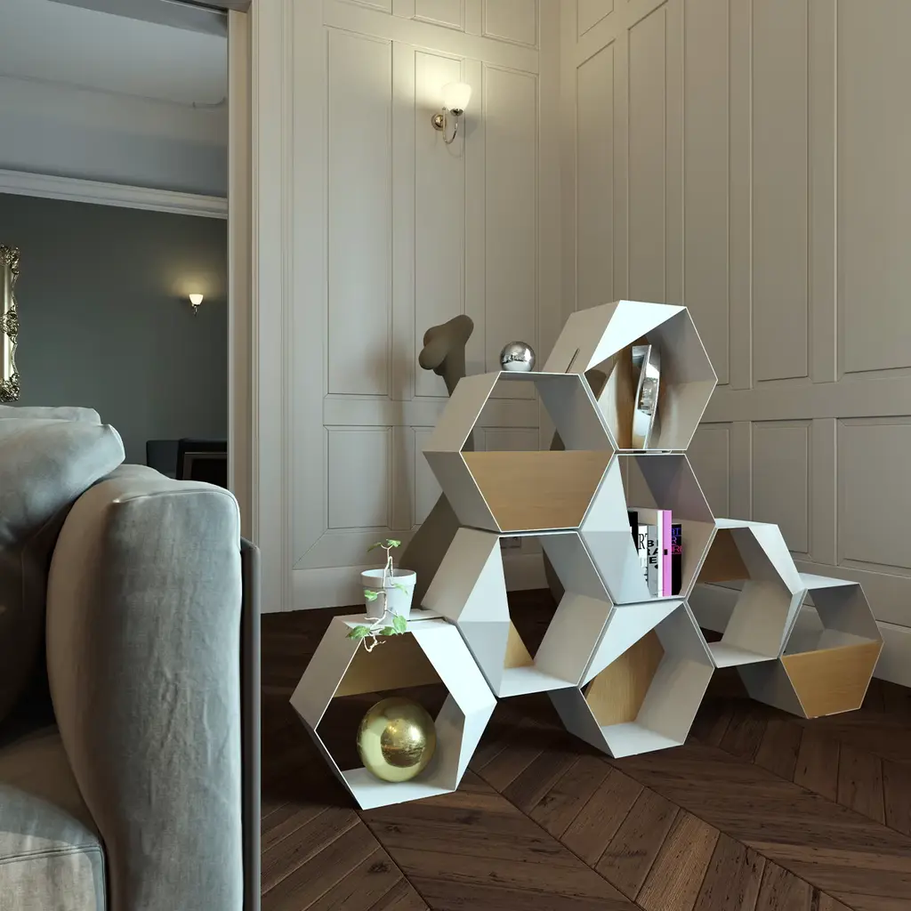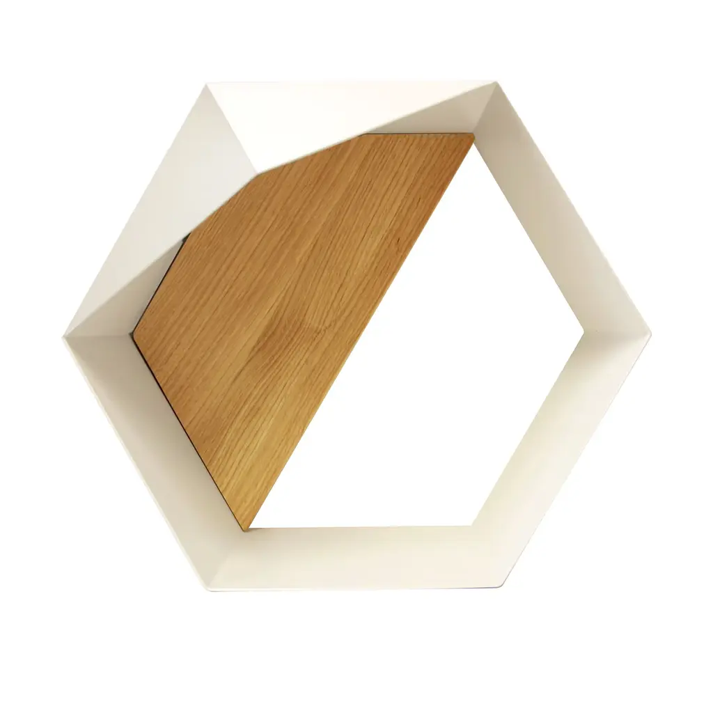 Hexagonal modular shelving made of matt lacquered iron and oak wood. Geometry and balance discreetly go out of the third dimension, towards the user. Perfect to characterize and dynamize a space, to display plants, books, bottles, candles, beloved items or to contain bedside personal effects. They always create new and custom compositions, combining with the place they are hosted in. Please, contact the Concierge for further information.