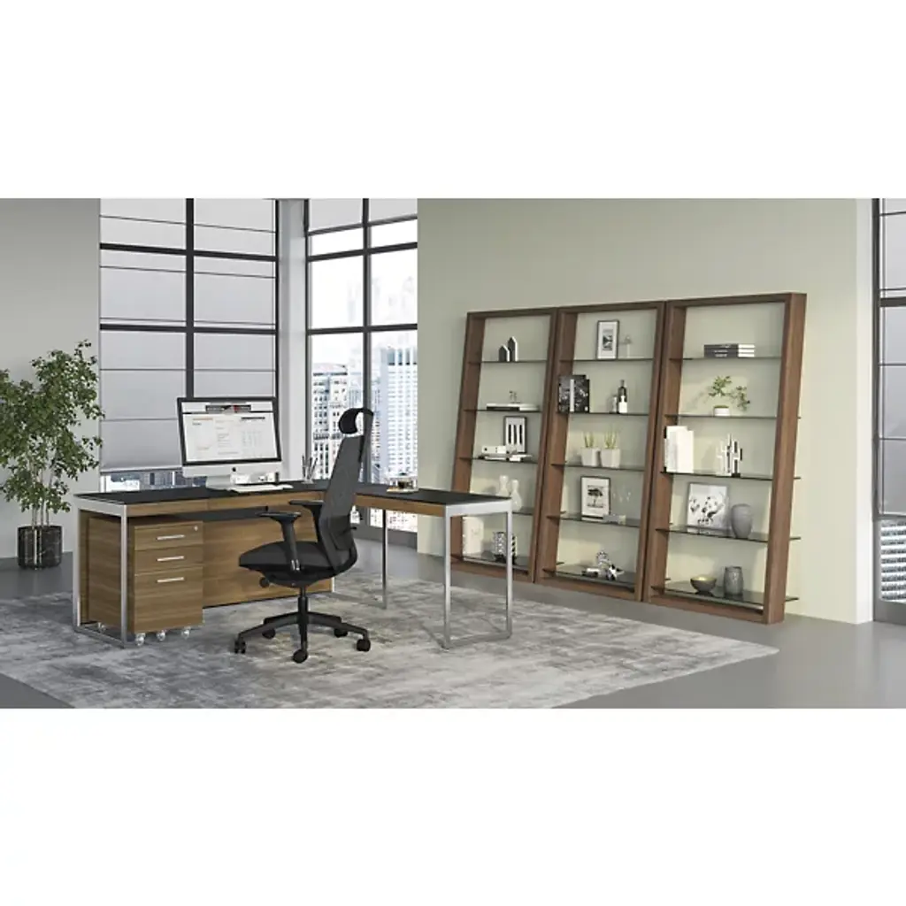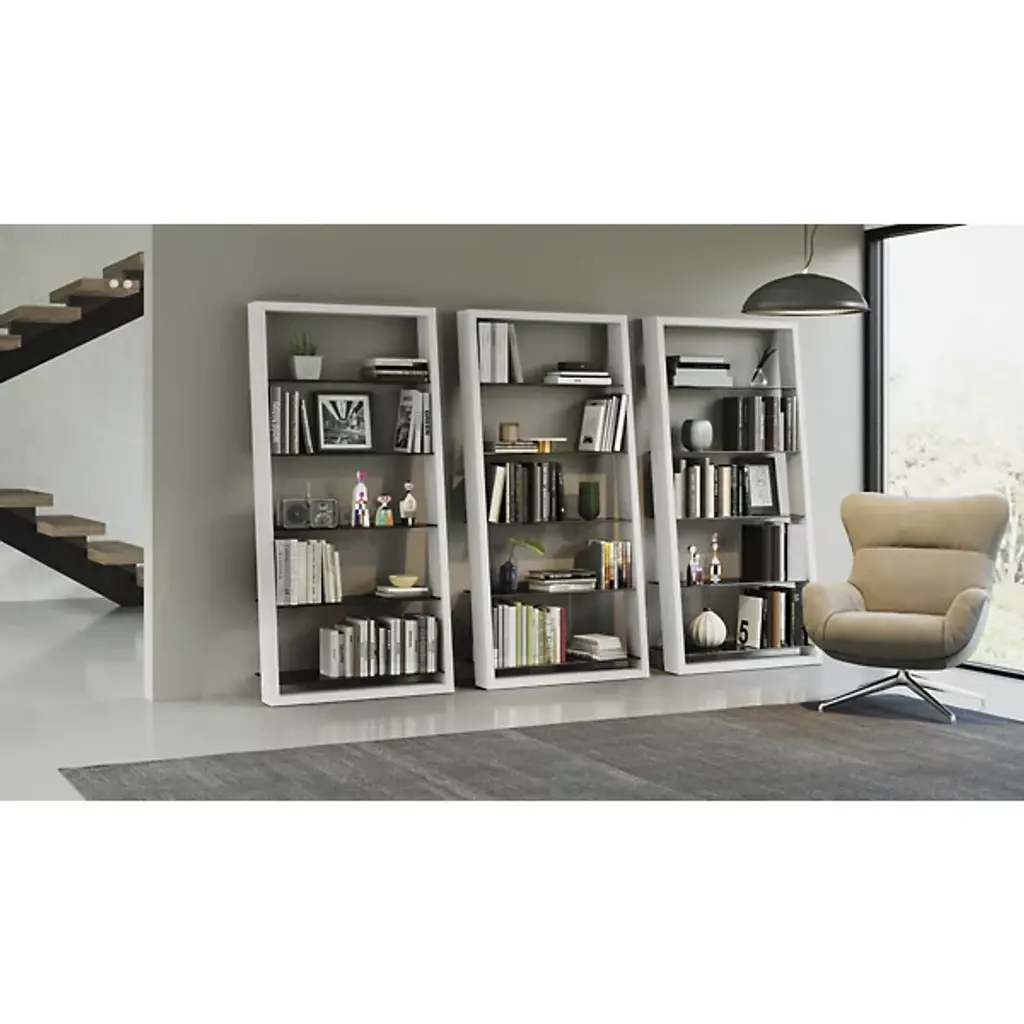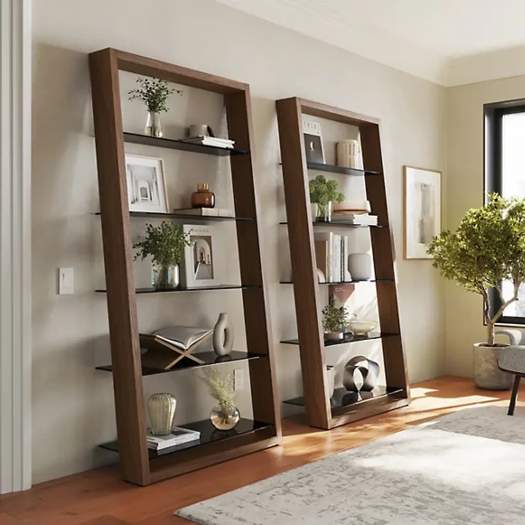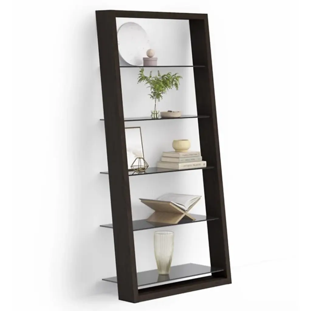 Give your favorite books and knickknacks a cool, laid-back place to hang out on the BDI Eileen Shelf. It features a precisely angled wood frame that leans securely against the wall, with five grey-tinted tempered glass shelves in increasing depths to accommodate the frame""s tilt. Depending on your storage needs, Eileen looks great alone or in a group.