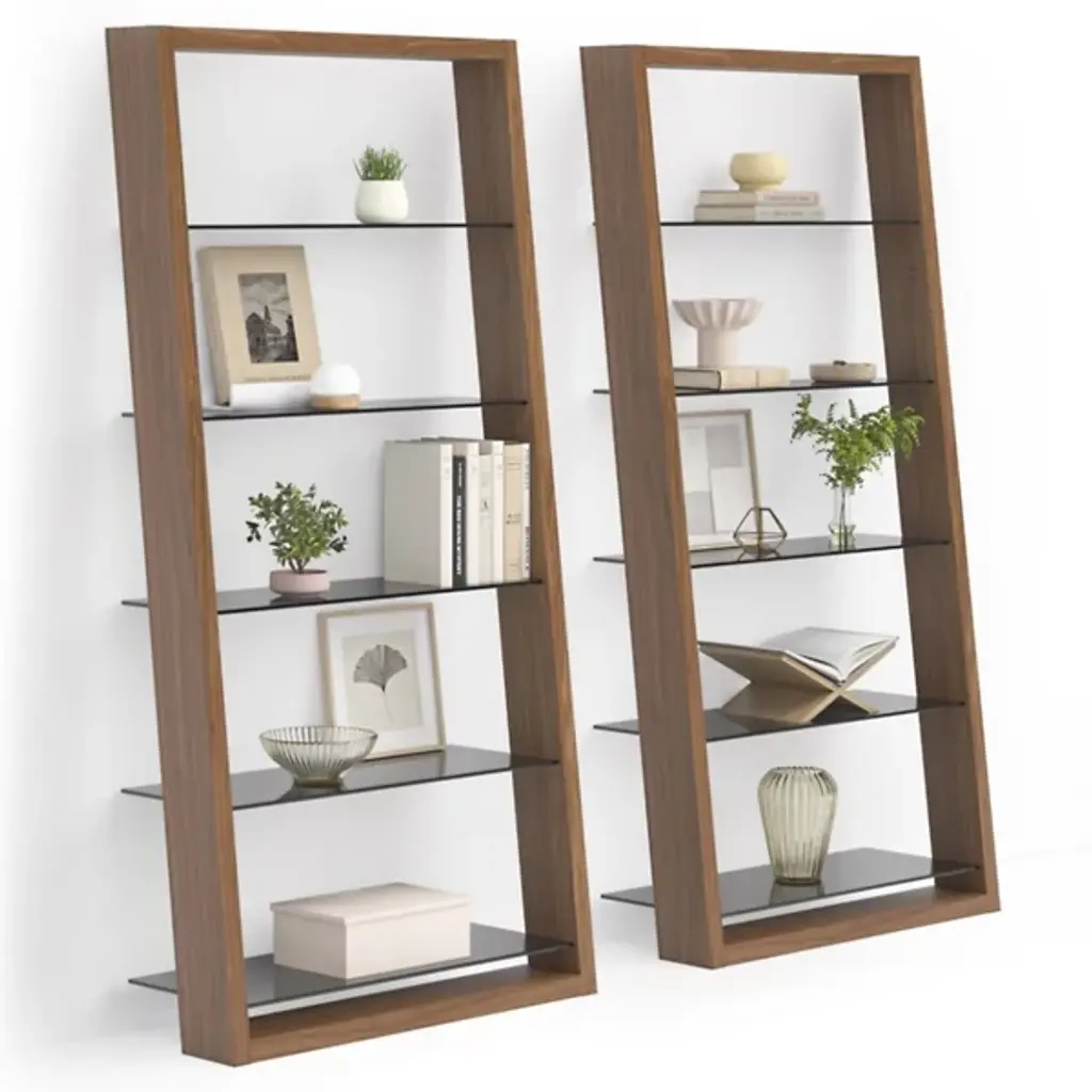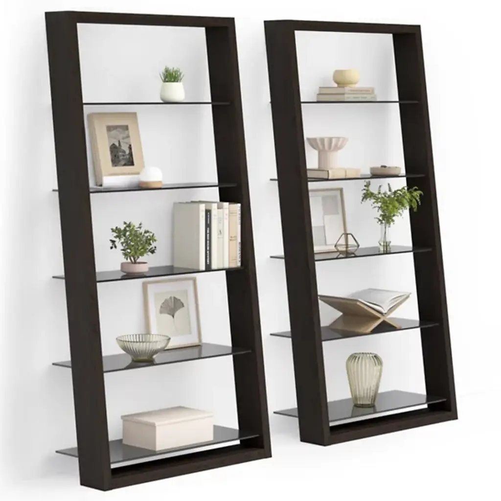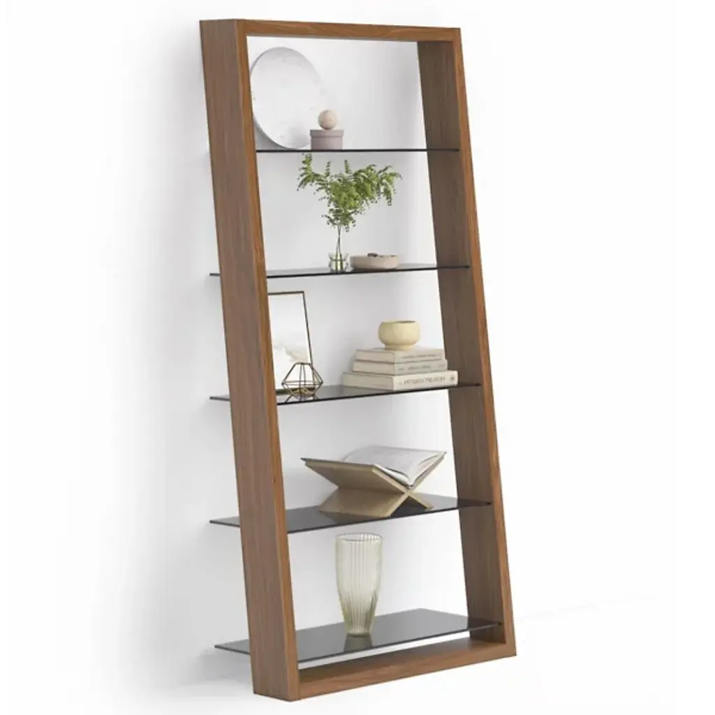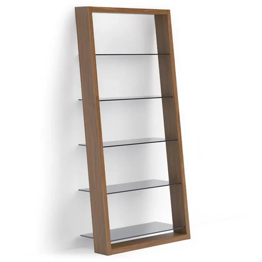 Give your favorite books and knickknacks a cool, laid-back place to hang out on the BDI Eileen Shelf. It features a precisely angled wood frame that leans securely against the wall, with five grey-tinted tempered glass shelves in increasing depths to accommodate the frame""s tilt. Depending on your storage needs, Eileen looks great alone or in a group.