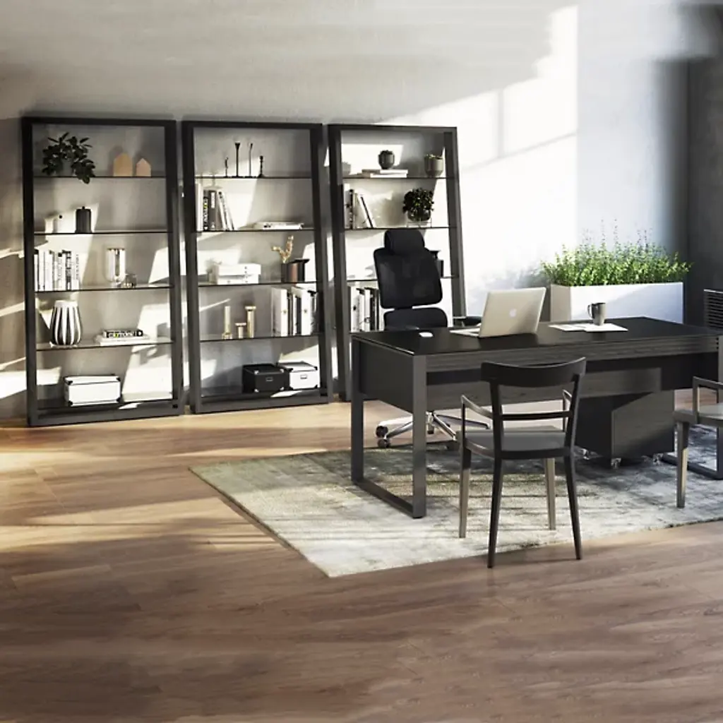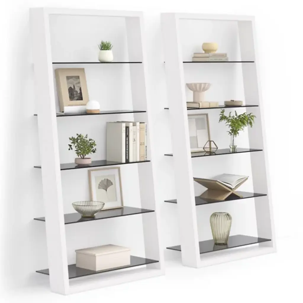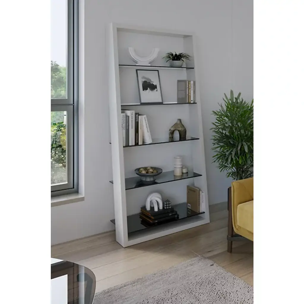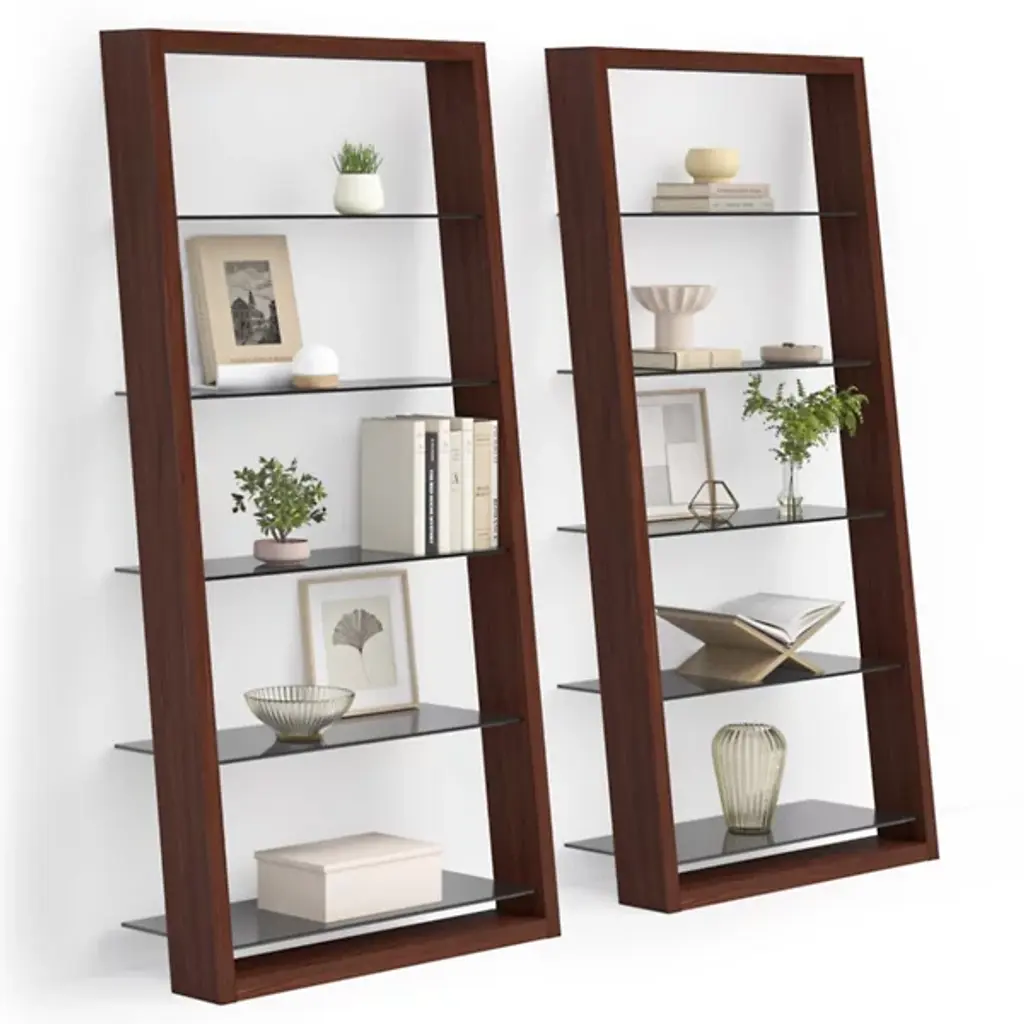 Give your favorite books and knickknacks a cool, laid-back place to hang out on the BDI Eileen Shelf. It features a precisely angled wood frame that leans securely against the wall, with five grey-tinted tempered glass shelves in increasing depths to accommodate the frame""s tilt. Depending on your storage needs, Eileen looks great alone or in a group.