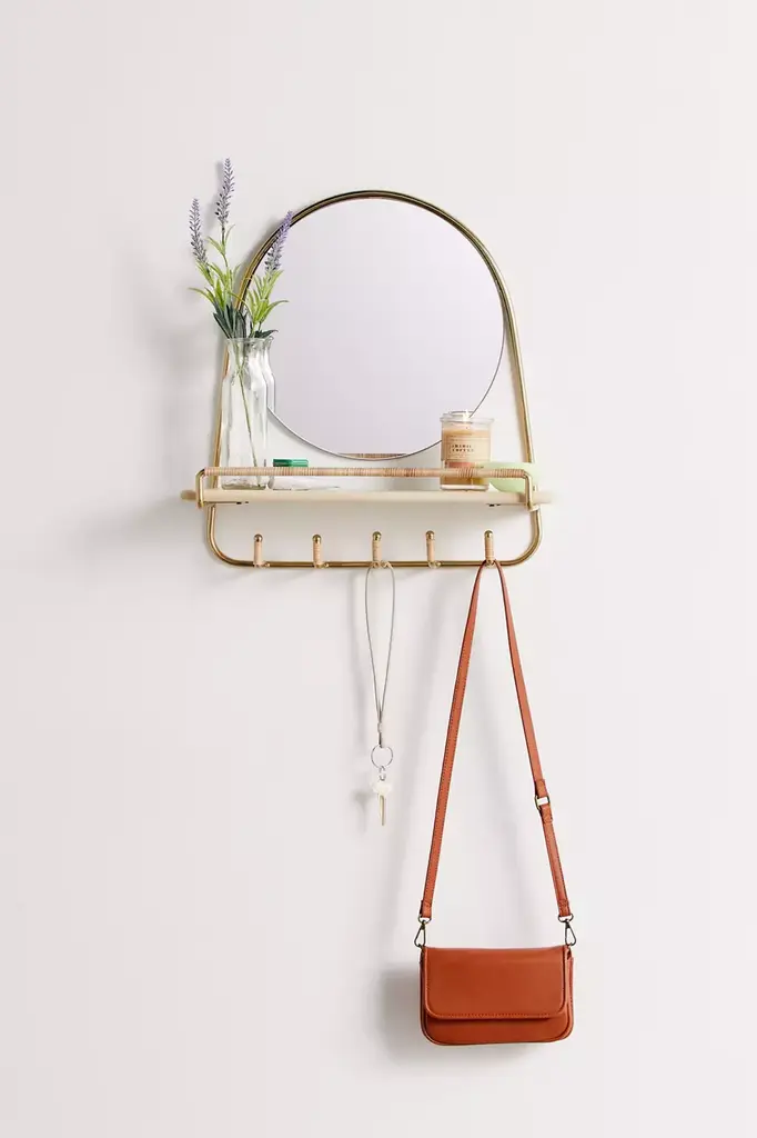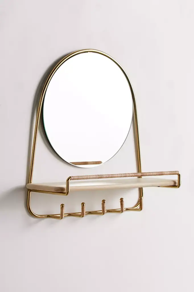 Perfect for catching one last look before you head out the door, this multi-hook wall shelf with a round mirror is just the thing to complete your entryway space. Features a metal frame with four uplifted hooks and a ridge for holding the mango wood shelf plank. Keep your keys on hand and display your favorite scarves and littlest plants. Hardware not included.