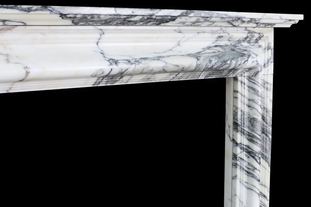 A Stylish & Elegant English Queen Anne Style Bolection Fireplace Surround in Nicely Veined Italian Arabescato Marble, with a Deep Shelf.External Width: 57 3/4″ – 147 cmDepth: 7″ – 18 cmExternal Height: 45 3/4” – 116 cmInternal Width: 36 1/2″ – 92.5 cmInternal Height: 36 1/2″ – 92.5 cm