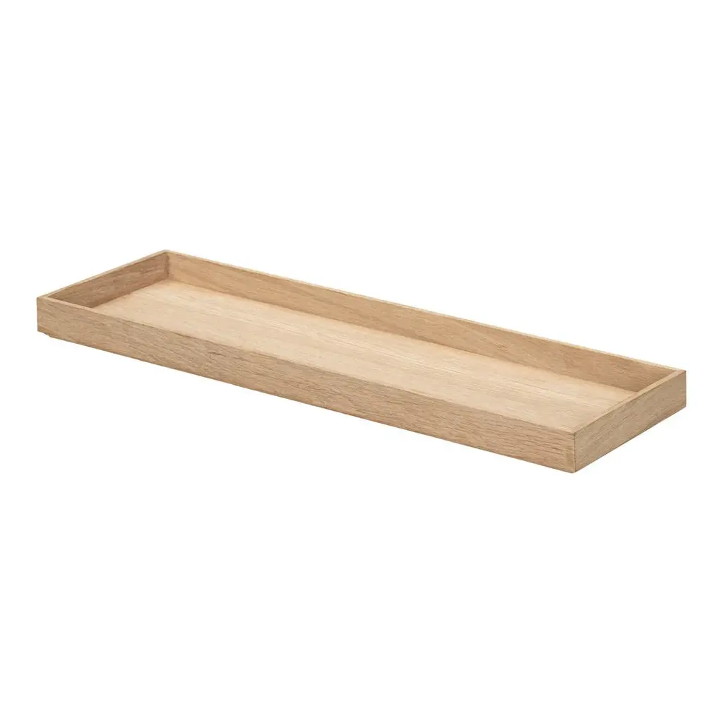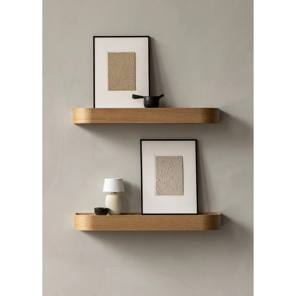 Audo Copenhagen's Epoch wall shelf boasts an elegant design that emphasizes both form and functionality. Designed by Nina Bruun, the wall shelf can be used both ways: one side works perfectly as a display shelf or picture ledge in a bedroom or living room, while the other, deeper side provides storage space for all kinds of clutter in the home, infusing the space with a sense of calmness and serenity. For this purpose, the Epoch shelf is the perfect addition for an entrance too small for a side or console table – but where you still need a place for your keys, sunglasses and headphones. The wooden shelf is made of oak veneered plywood, with the natural warmth of the wood and the curved design language reinforcing the serene impression created by the shelf.