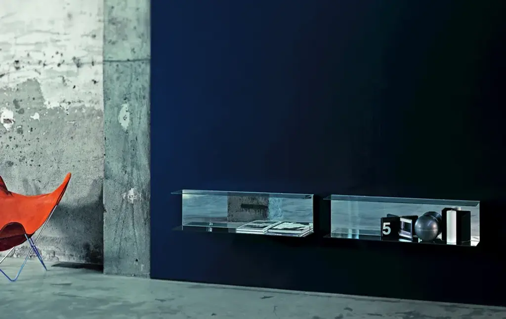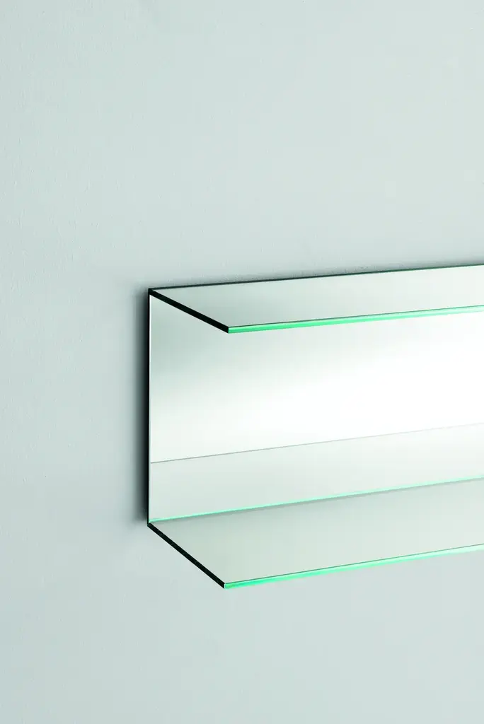 Everywhere is a series of shelves with mirrored back and transparent extralight double plate 8 mm thick tempered.In addition to sustaining and cantaining, this shelf is caracterized by its formal purity and lightness and as well by its reflecting function.