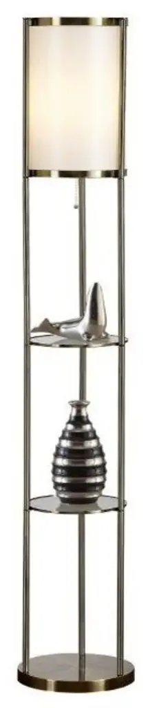 • Please Note• Accessories not includedIlluminate your home with this Exeter floor lamp from Artiva USA. This sleek antique satin brass lamp features two durable glass shelves and a metal bottom shelf for decorative display or photos or to hold your favorite book. A perfect addition to your home or office.Contemporary posh lamp with durable glass shelf and heavy-weighted base for quality and sturdinessComes with a smooth silk shade providing accent and a conversation starter at your home or office durable glass shelf and heavy-weighted base for quality and sturdinessPerfect for Displaying photos, trophies, awards, certificates, etc"¦ for the guests of the room or office spaceDisplay accessory not included63"H with off white silk shade (11.5" diameter)Beautiful Antique Satin brass finishRequires one 100-watt bulb or 1500 lumens LED or 23-watt CFL equivalent (not included)Smart outlet compatible