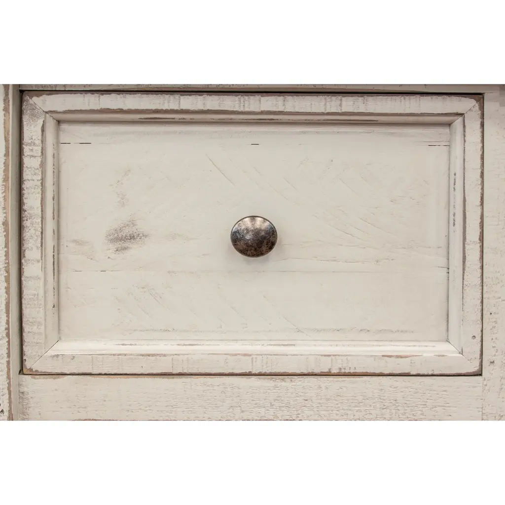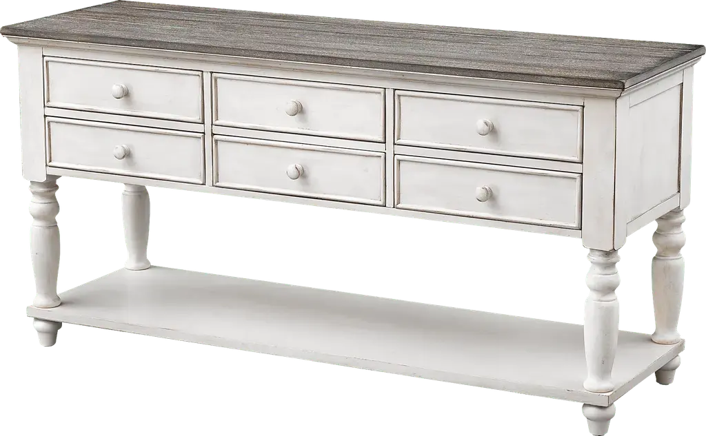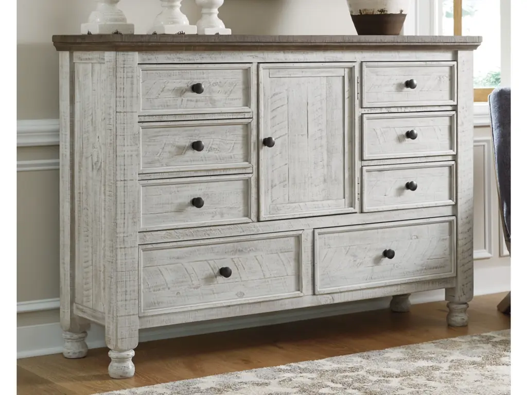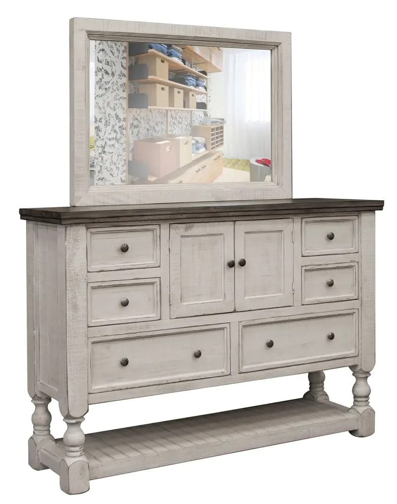 Keep your clothes and other belongings in charming relaxed vintage style when you bring this dresser into your bedroom. This piece features six drawers of various sizes, two cabinet doors with shelves and a slatted shelf perfect for wicker or wood baskets. Framed drawer fronts and hand turned feet provide a touch of old country charm while the clean lines add a modern element that is sure to serve as a great update for your home.