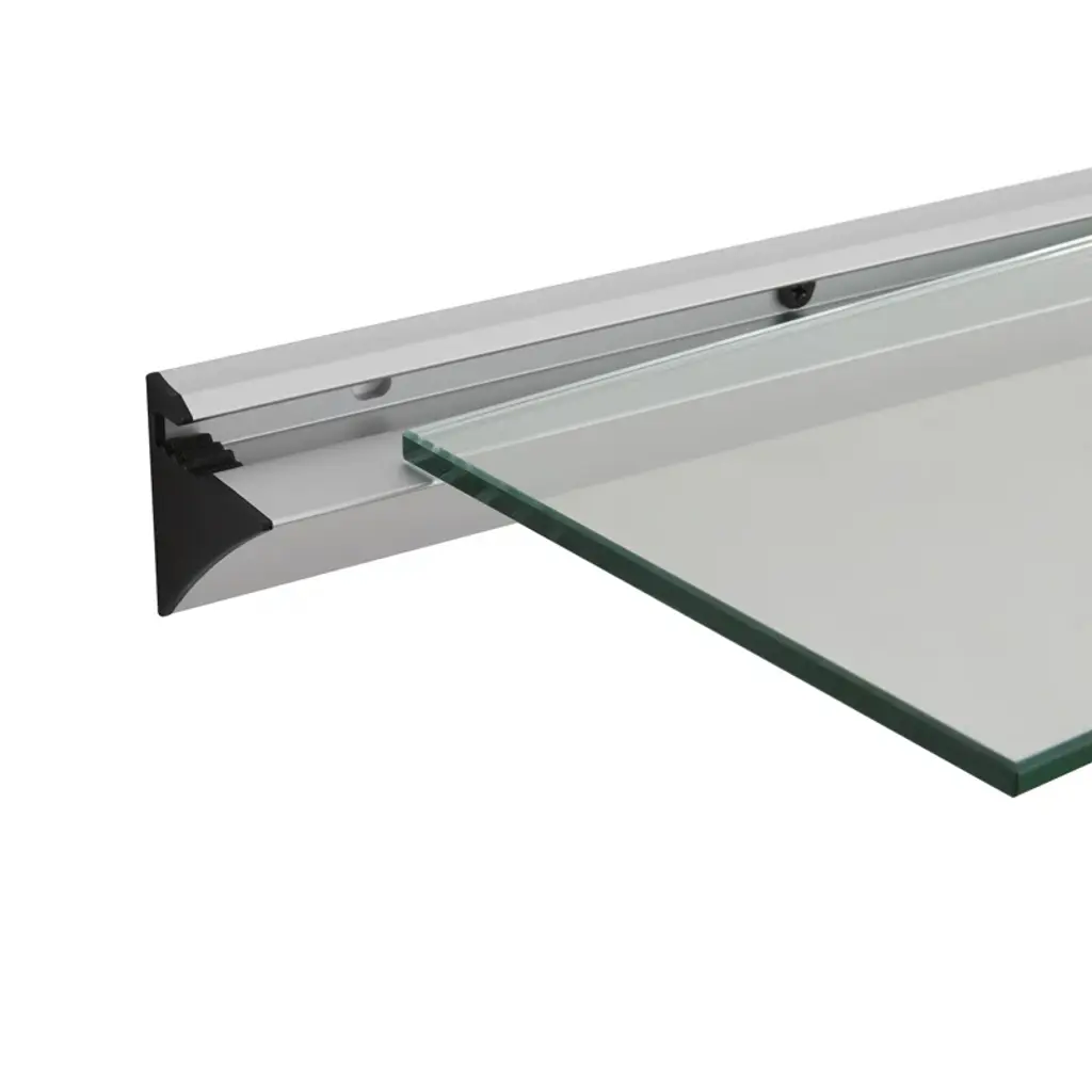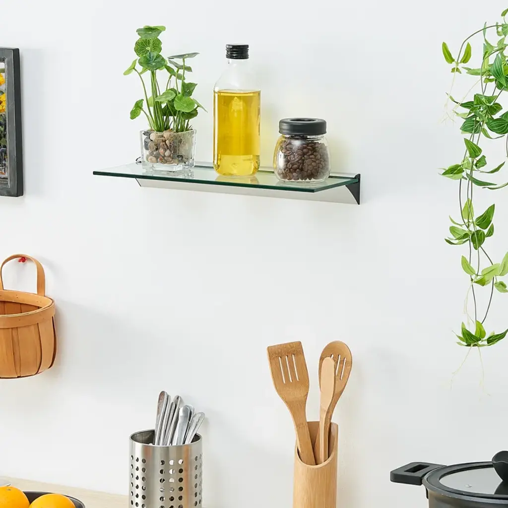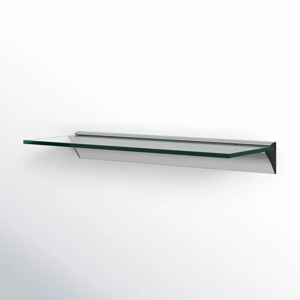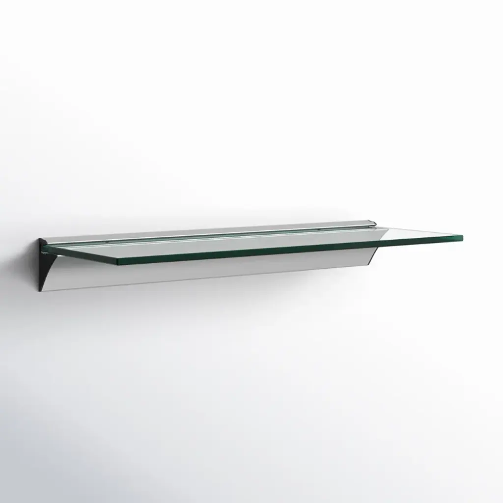 This wall-mounted accent shelf saves you space in your home office, streamlining the look. It's crafted from clear, tempered glass in a rectangular shape with a sleek, brushed aluminum backing bracket. The L-shaped design features an angled piece that attaches to the wall. This wall-mounted shelf can hold up to 25 lbs., making it perfect for supplies in your home office or shampoo and washcloths in your bathroom. We love that it comes pre-assembled and with mounting hardware, so it's ready to install right out of the box.