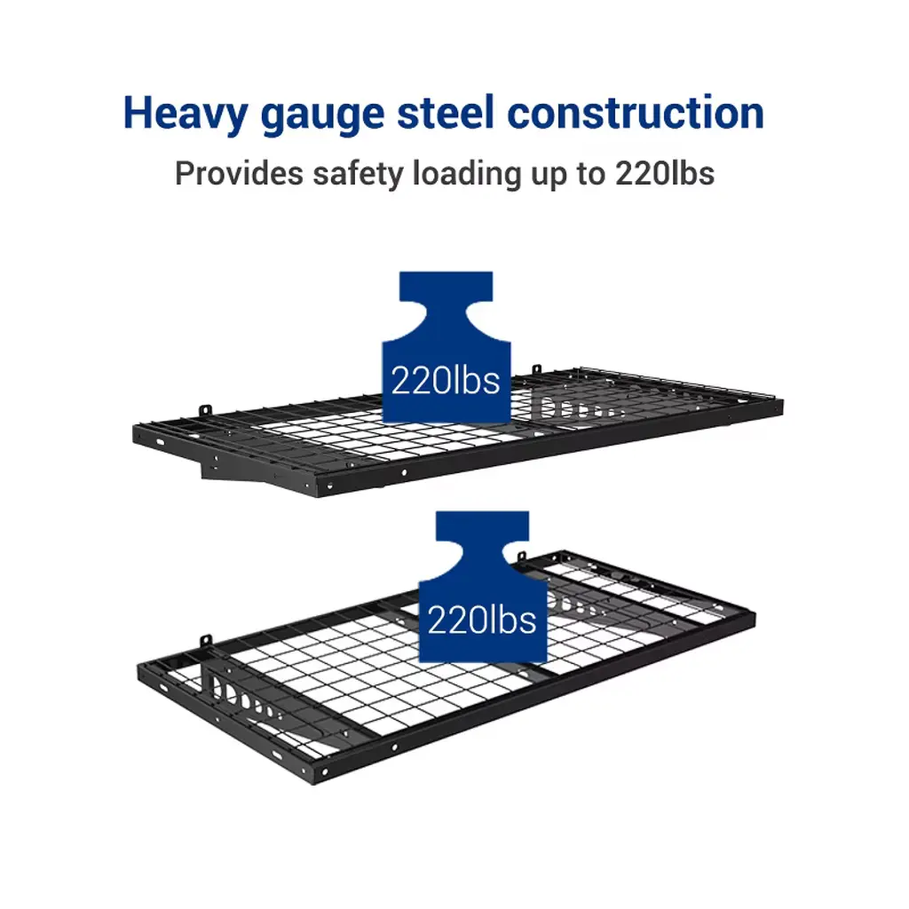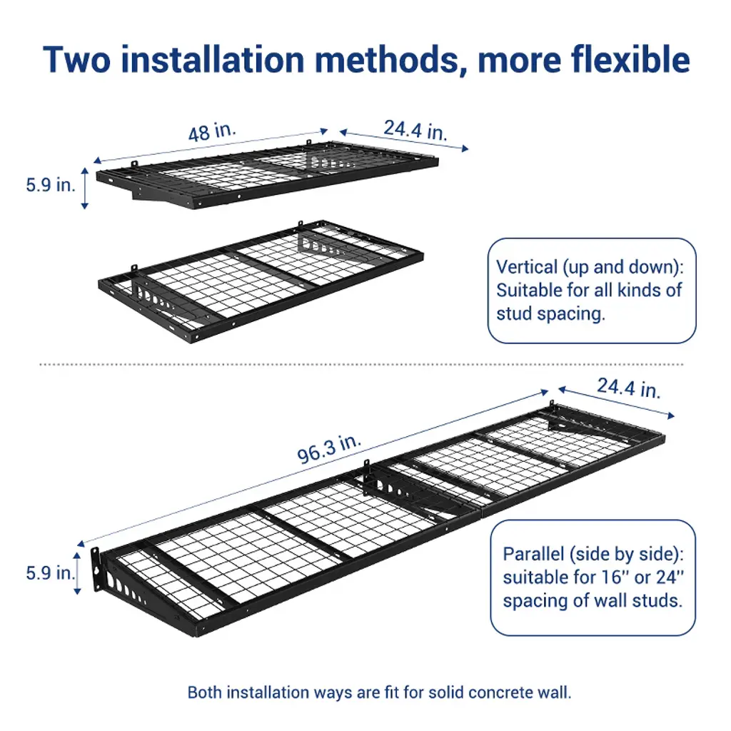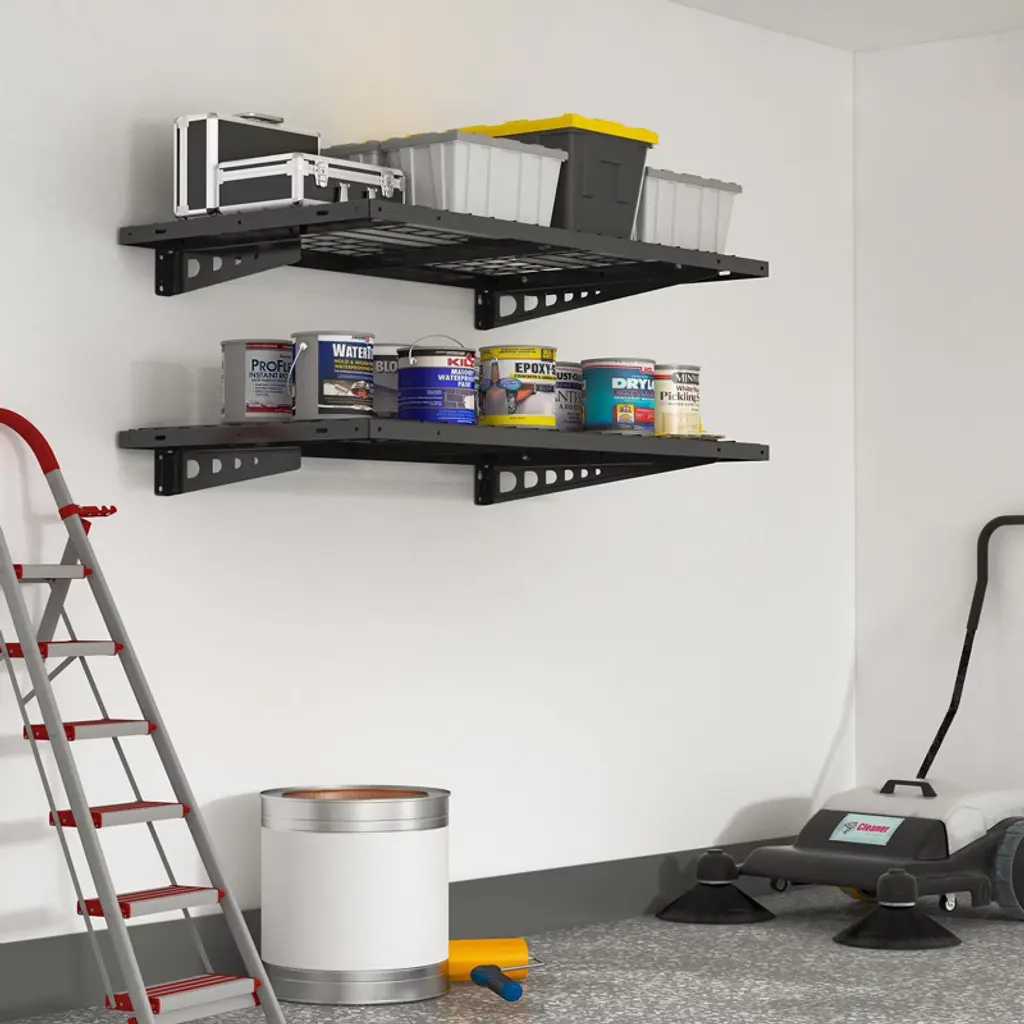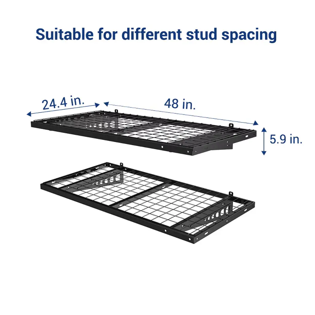 The BR24B-E garage wall shelf package in black includes two shelves, each measuring 48 inches wide by 24 inches deep, with a weight capacity of 220 lbs. per shelf. Made from powder-coated cold-rolled steel, it is scratch-resistant. The two shelves can be installed side-by-side, requiring bracket placement at the shelf edges into 16- or 24-inch stud spacing. It comes with a lifetime warranty.