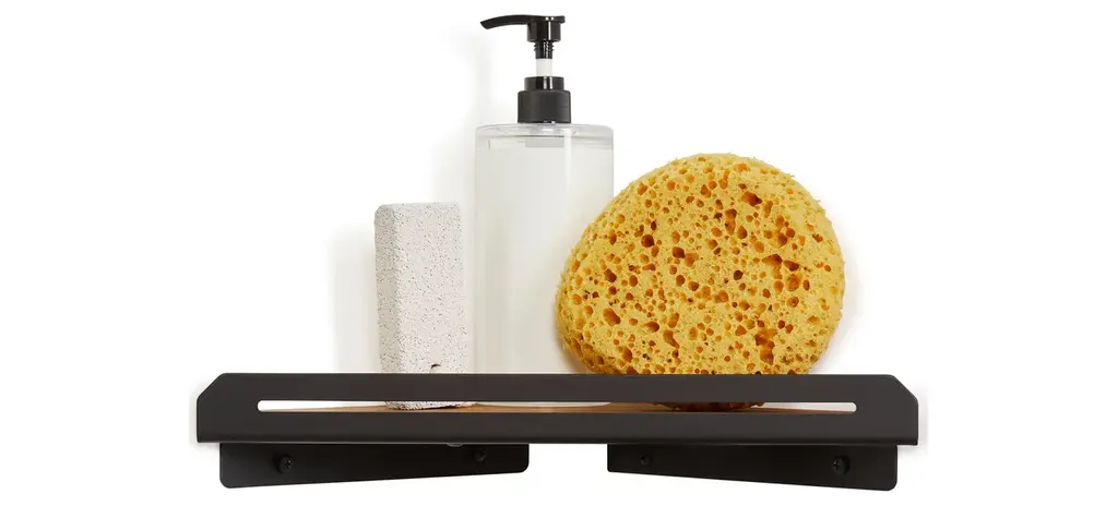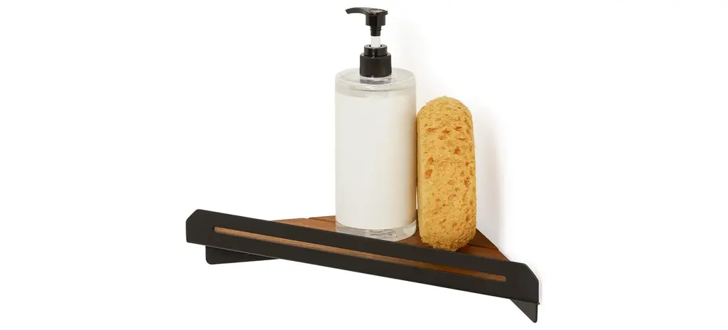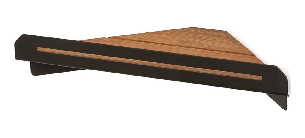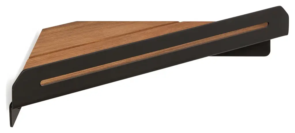 Floating Corner Shower Shelf With Natural Teak Wood, Matte Black