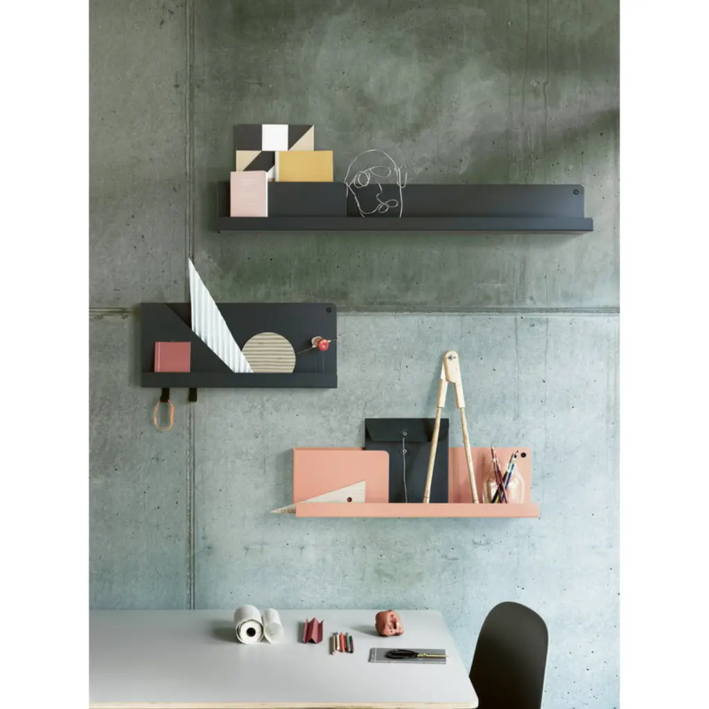 Muuto’s Folded shelves feature a sophisticated, minimalist form that consists of a single folded sheet of steel. Designer Johan van Hengel drew his inspiration from the play of layers and shadows and created a collection of simple metal shelves with pocket-like elements for organizing and supporting objects. The Folded shelves are perfect for storing and displaying both everyday essentials and favorite keepsakes. They are available in several sizes and come with convenient hooks for hanging clothes, bags, accessories and towels.