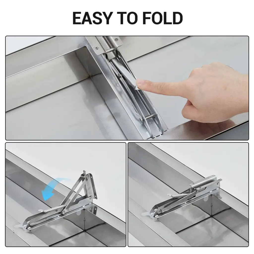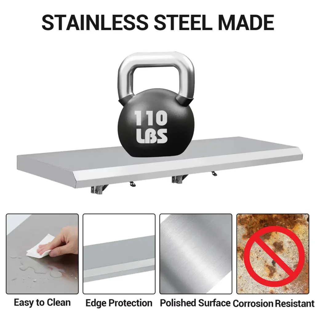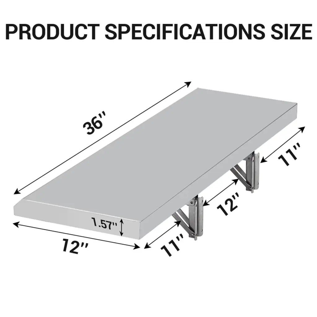 "Stainless Steel Folding Shelf 36" x 12" - Commercial Grade Wall Mount Drop Down Shelf for Food Truck, BBQ, Restaurant"Product Overview:The TROPOW Folding Concession Shelf provides professional workspace solutions with its 36" x 12" 304 stainless steel construction. Designed for commercial kitchens and mobile food service, this wall-mounted shelf features a space-saving fold-down mechanism, 1.6" thick steel surface, and tool-free operation - ideal for optimizing cramped workspaces.Key Features & Specifications:Commercial 304 Stainless Steel Construction36" L x 12" W x 1.6" thick (supports 80+ lbs)Rust/corrosion-resistant for wet environments37.01" x 12.8" x 3.94"H (folded dimensions)Instant Space-Saving FunctionalityOne-hand push-snap folding (no tools required)Wall-mounted design maximizes floor spaceAuto-locking mechanism when fully extendedHygienic Food-Safe SurfaceSeamless stainless construction (FDA-compliant)No crevices for bacteria accumulationEasy-wipe cleaning for commercial sanitationQuick Professional InstallationIncludes all mounting hardwarePre-drilled holes for stud/wall mounting30-minute assembly with basic toolsVersatile Commercial ApplicationsFood trucks (condiment stations)BBQ setups (tool/meat prep surface)Restaurant kitchens (additional workspace)