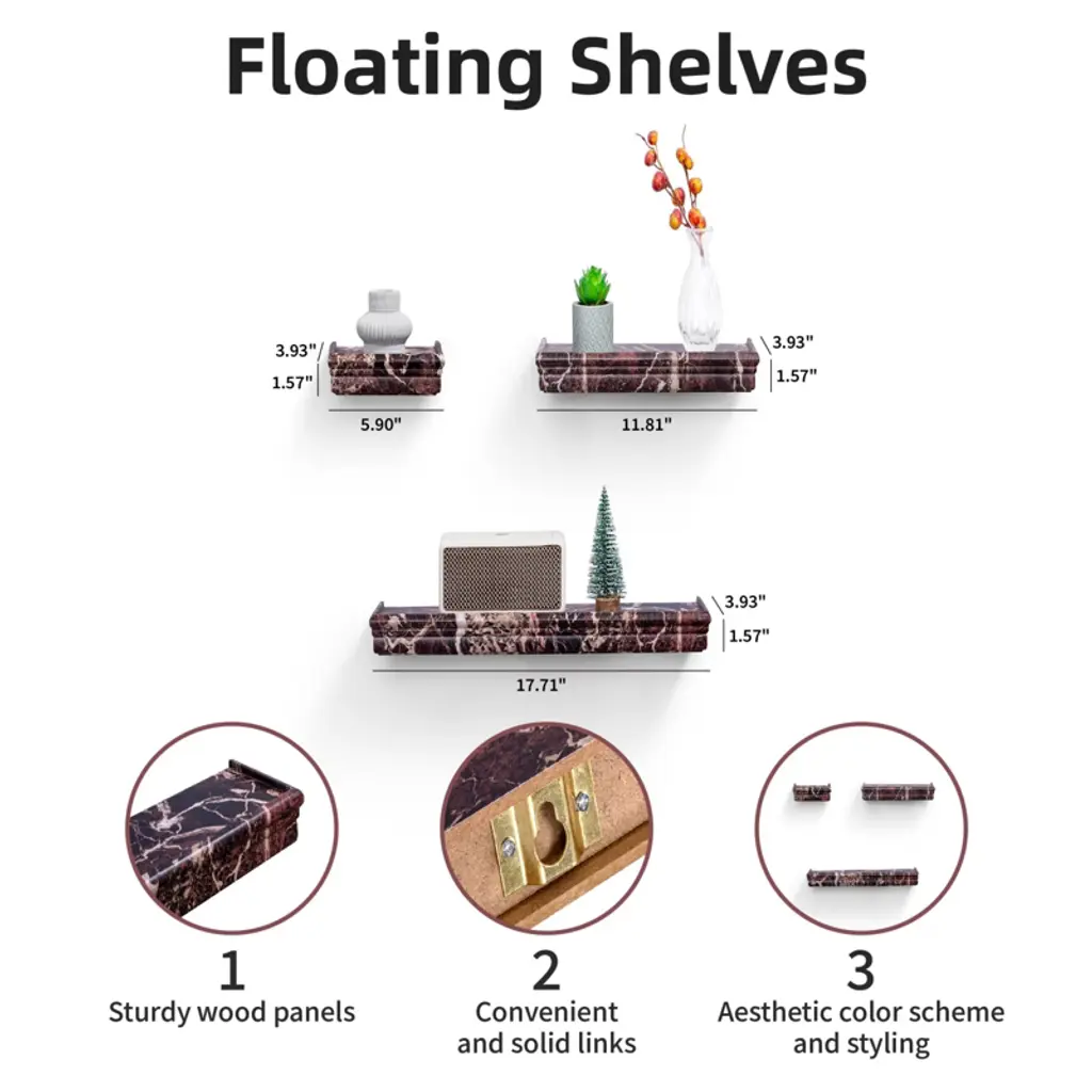 These floating shelves offer stylish storage to display items and provide practical space, maximize space without extra floor area, work in various rooms like bedrooms or kitchens, have multiple functional uses for storage and decor, and come with included hardware for simple installation.